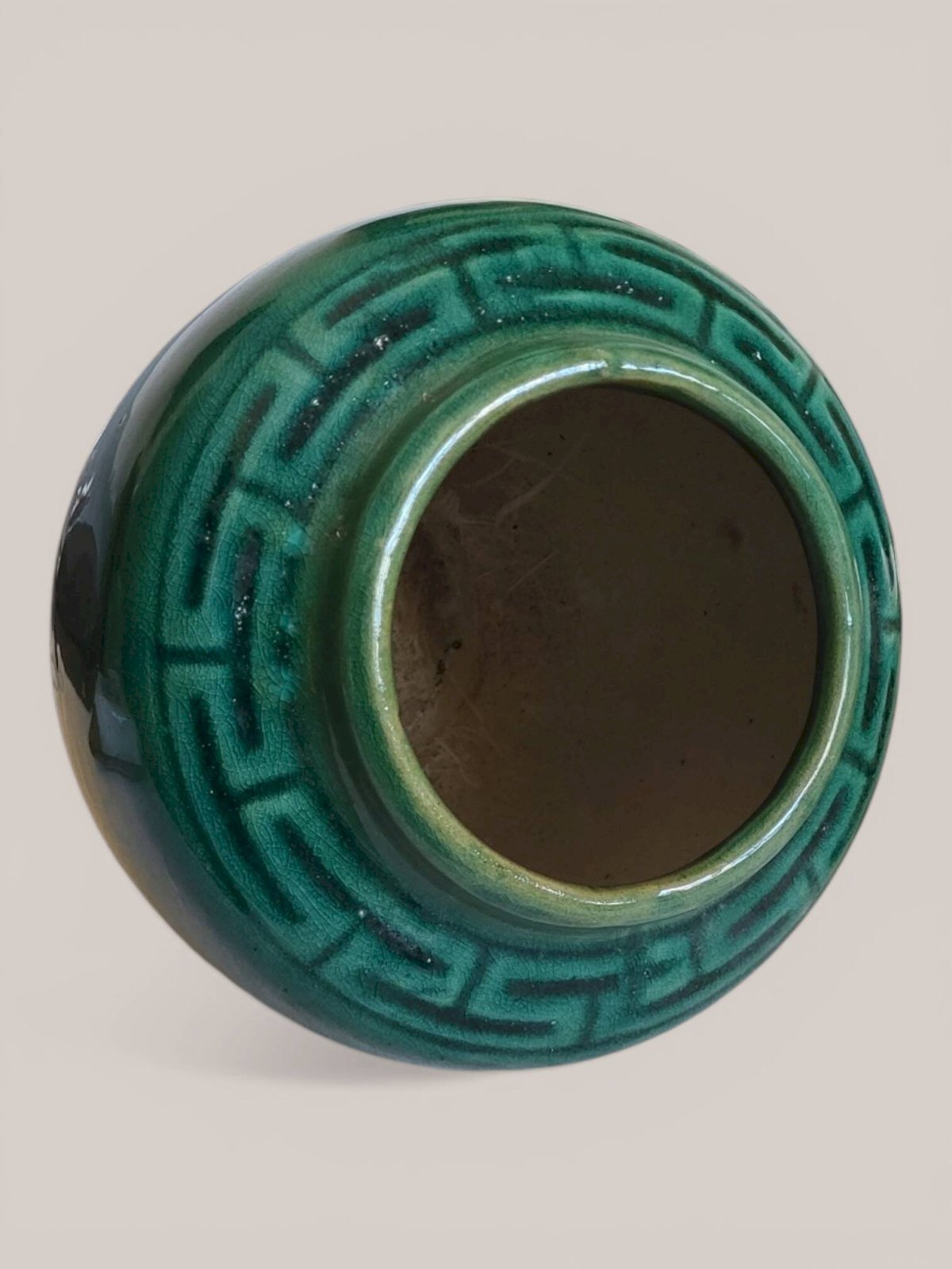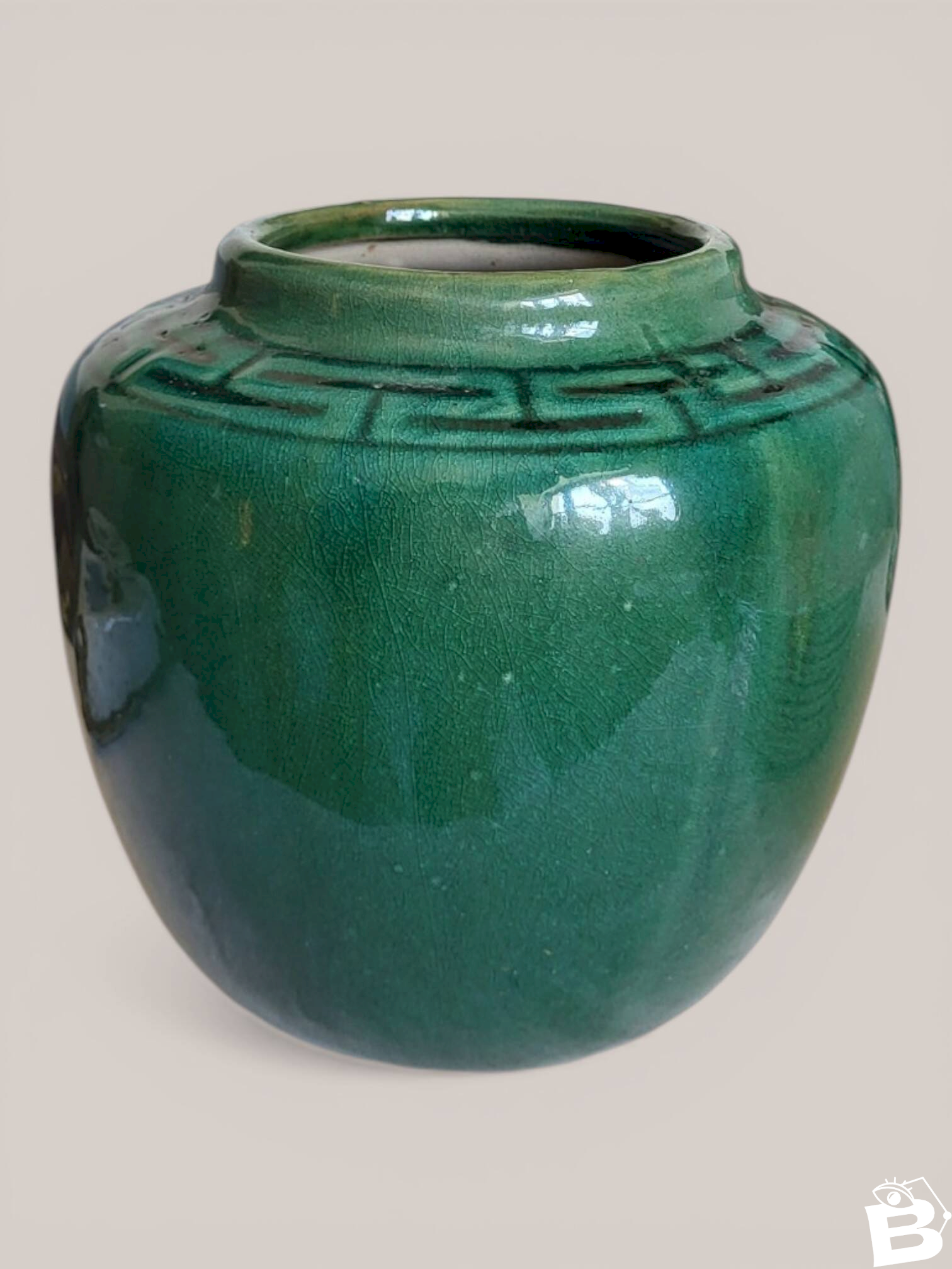 Art Deco style vase in dark green glazed terracotta with geometric decoration. Height 20 cm. Width 19.5 cm. In good condition. Weight 1.8 kg. Careful packaging and fast delivery. L: 19 W: 19 H: 20
