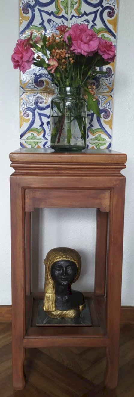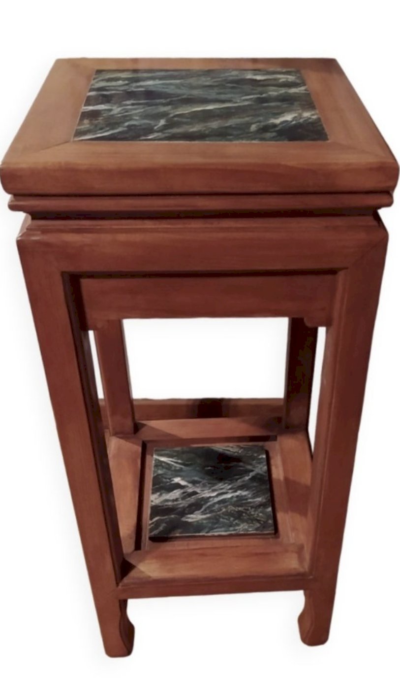 Stunning Art Deco-style pedestal table, period, made of tropical wood (African blonde mahogany?) Centerpiece with upper and lower trays, faux marble predominantly in emerald green. Ideal for showcasing plants and objects.