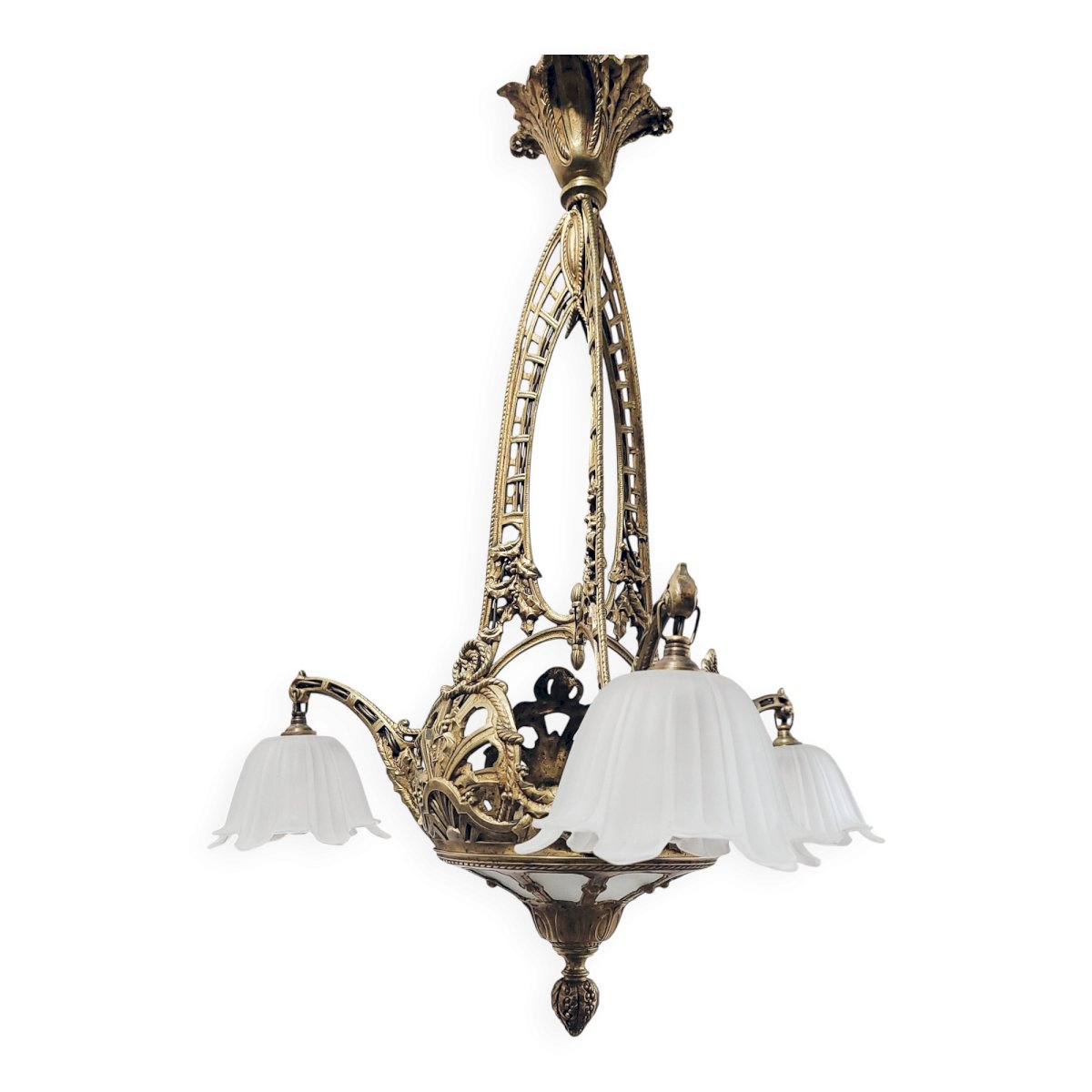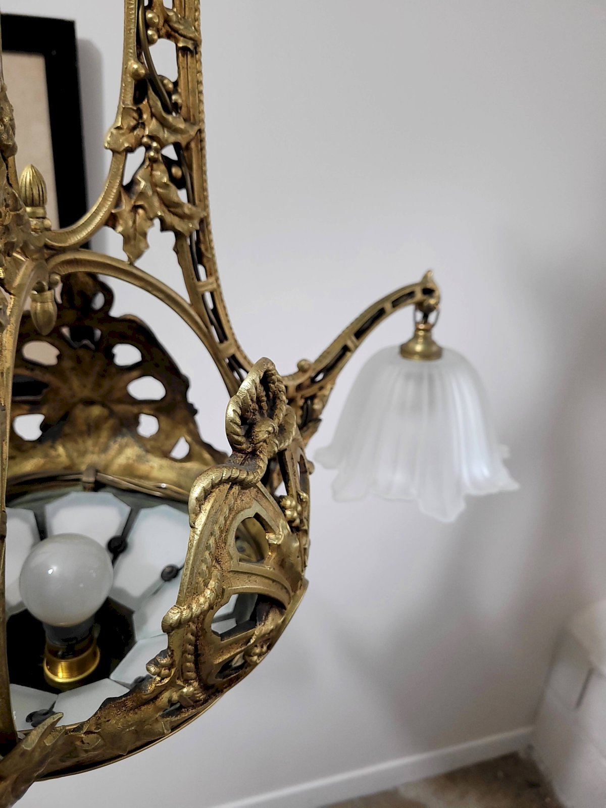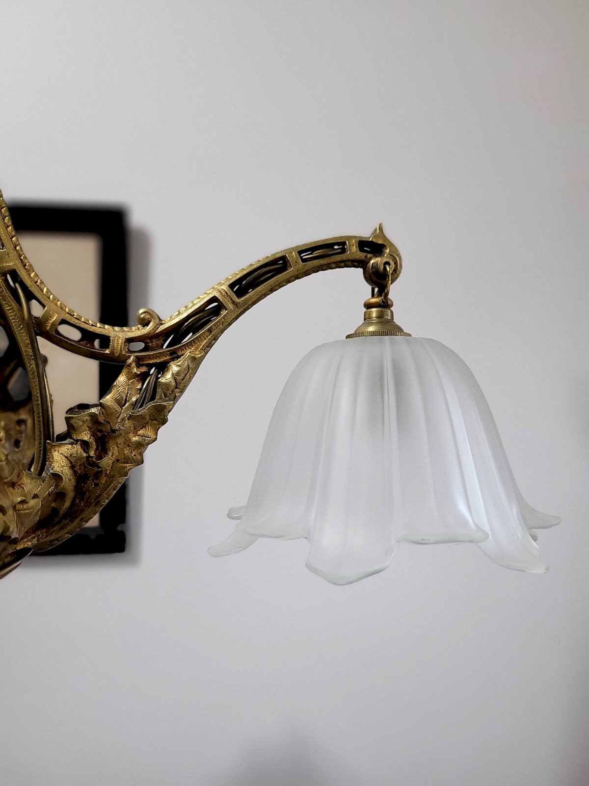 The structure is richly decorated and matches perfectly with its frosted glass lampshades.