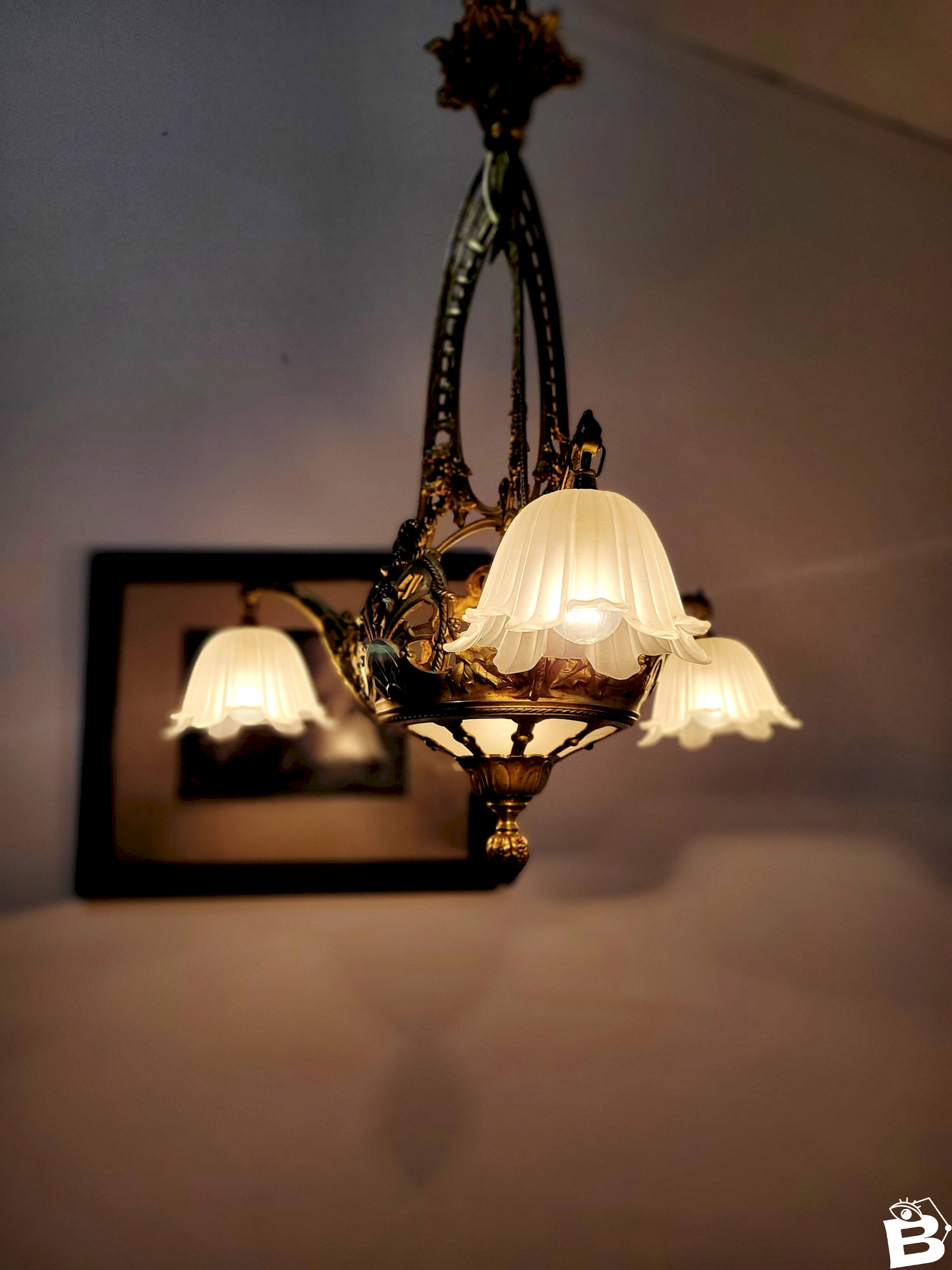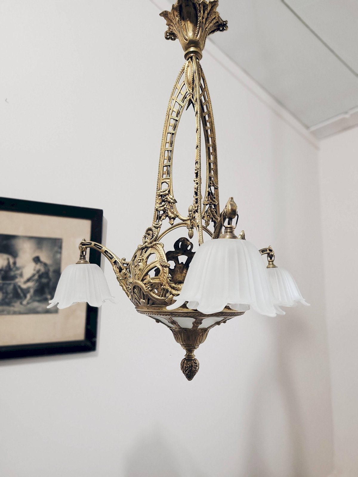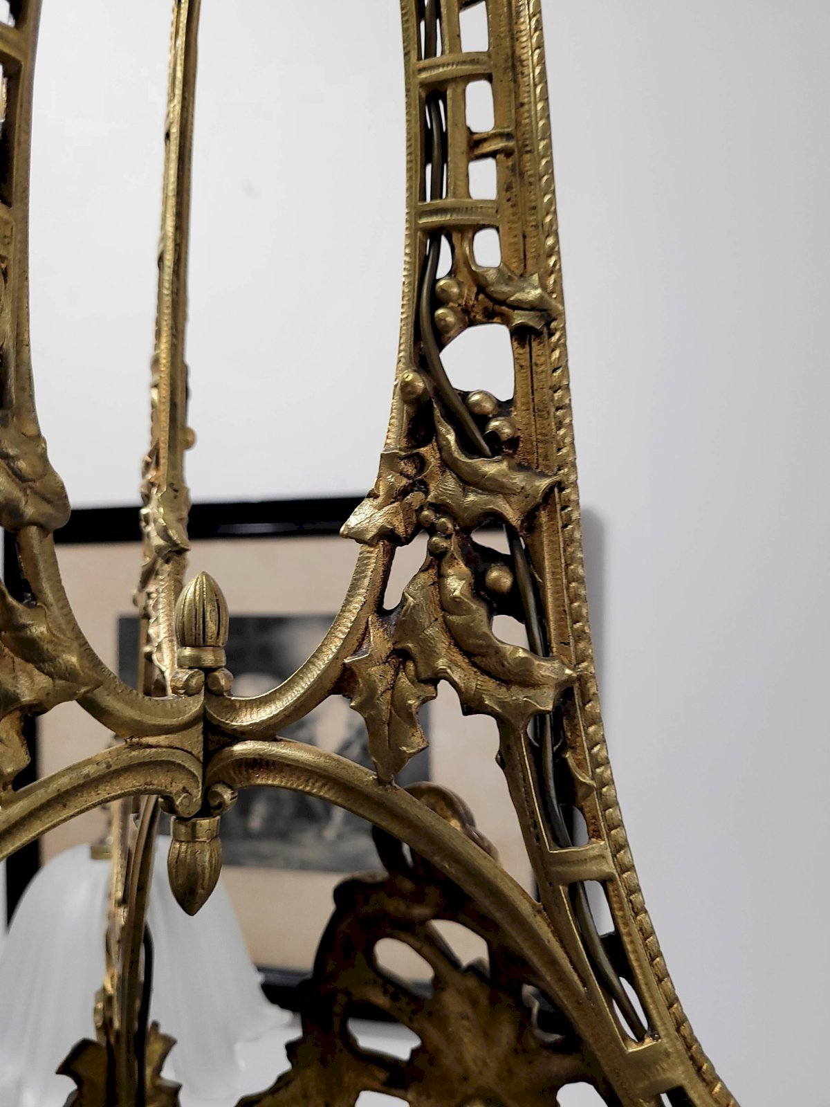 The structure is richly decorated and matches perfectly with its frosted glass lampshades.