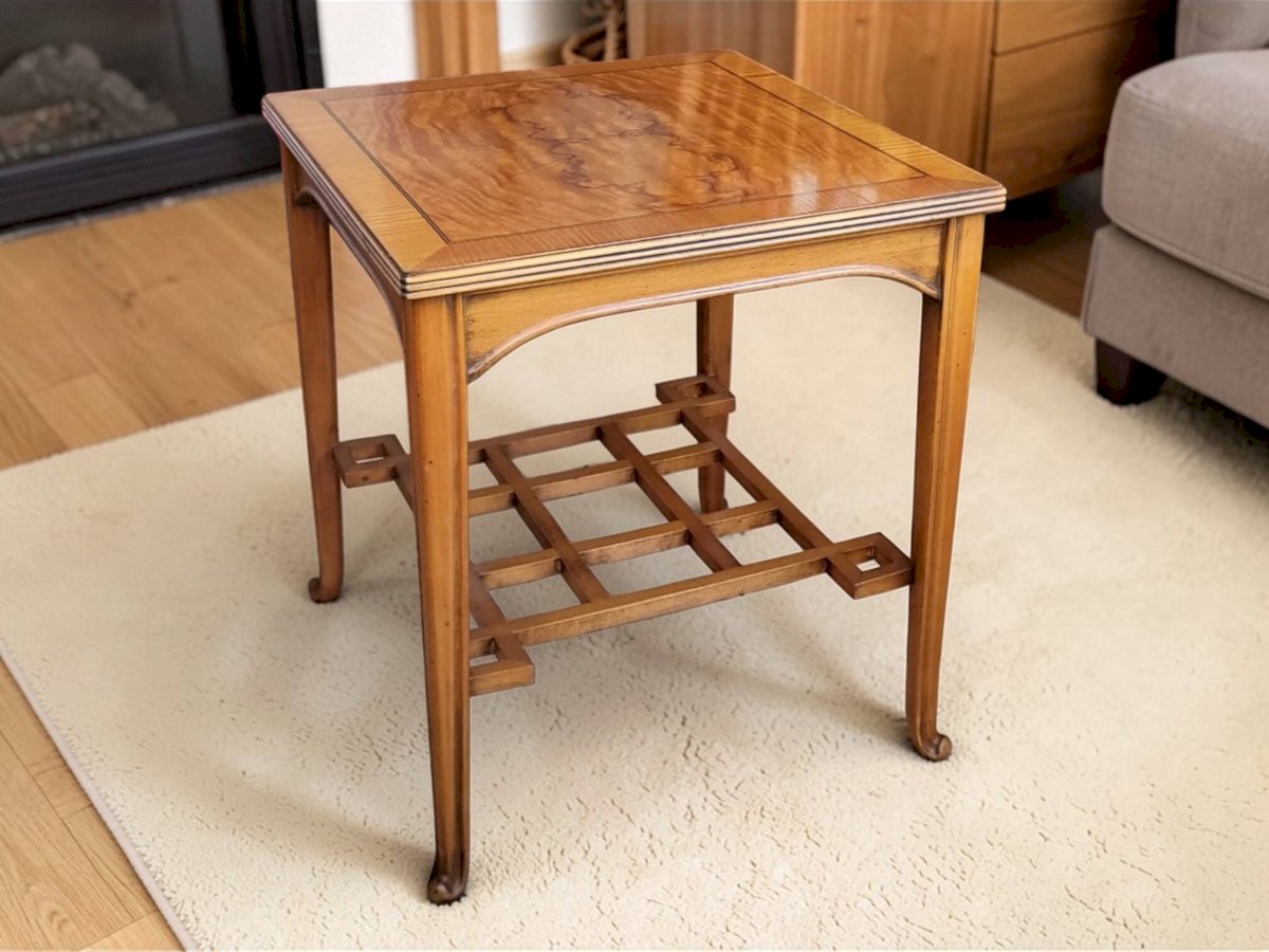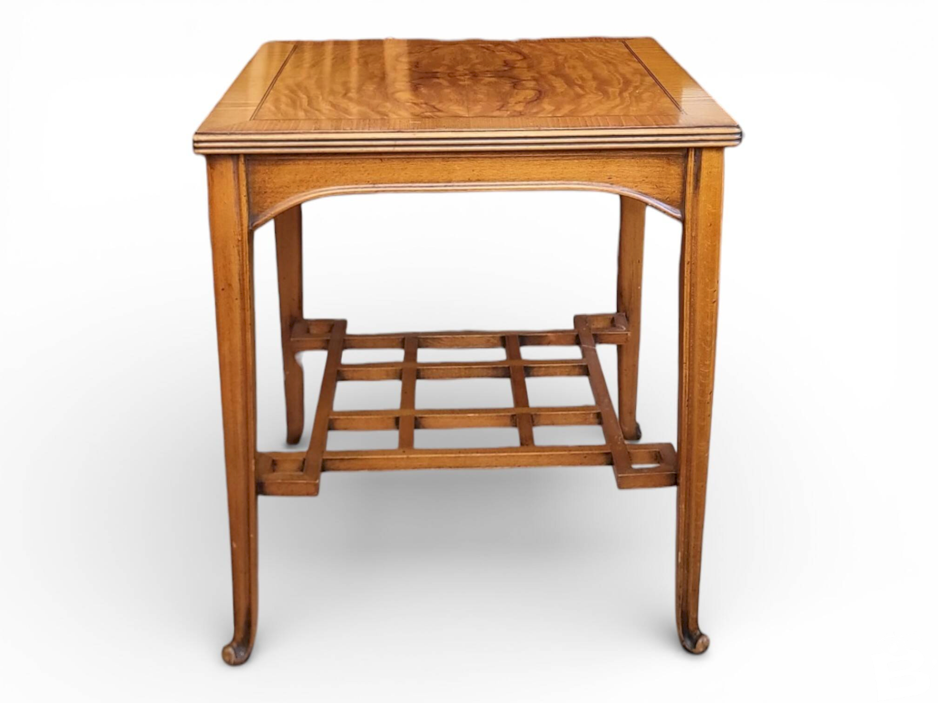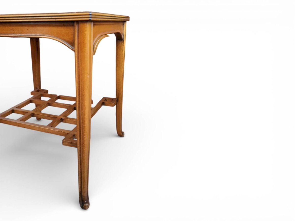 Art Nouveau coffee table that also serves as a magazine rack in a Japonese style. Oak table with walnut and maple burl inlays. The legs are slightly curved.