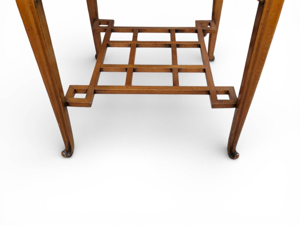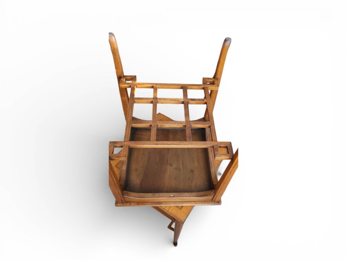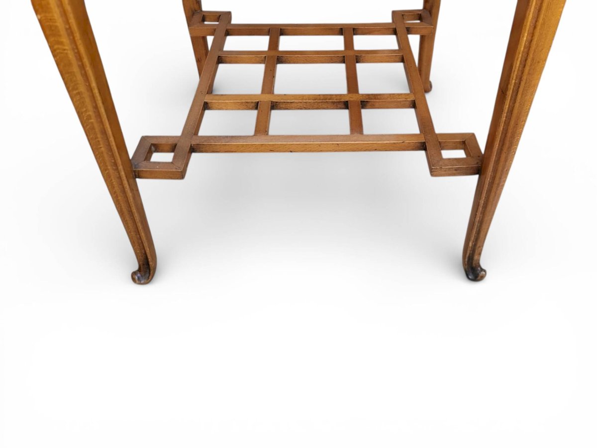 Art Nouveau coffee table that also serves as a magazine rack in a Japonese style. Oak table with walnut and maple burl inlays. The legs are slightly curved.