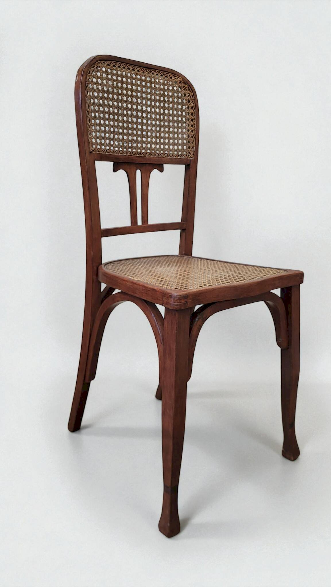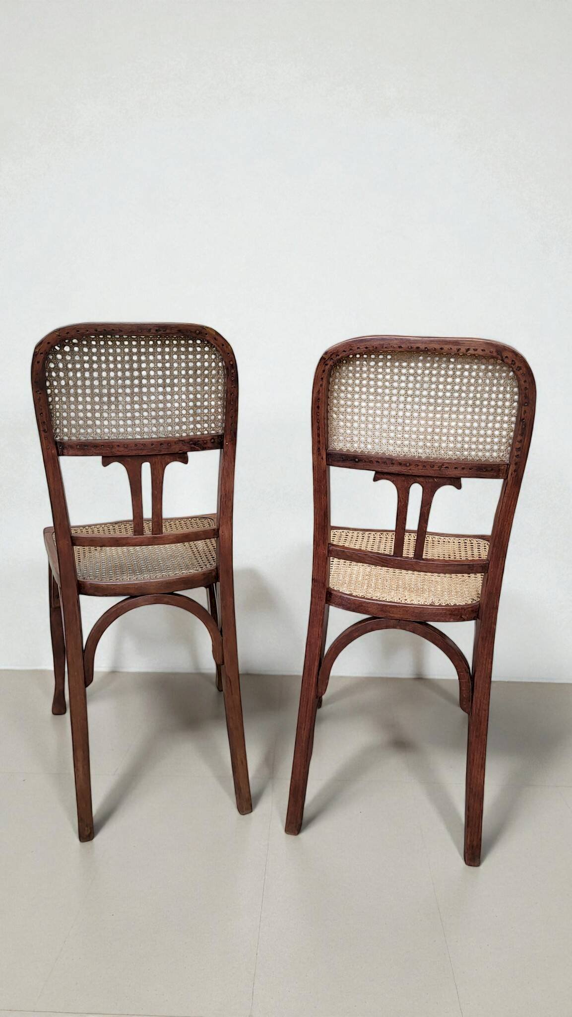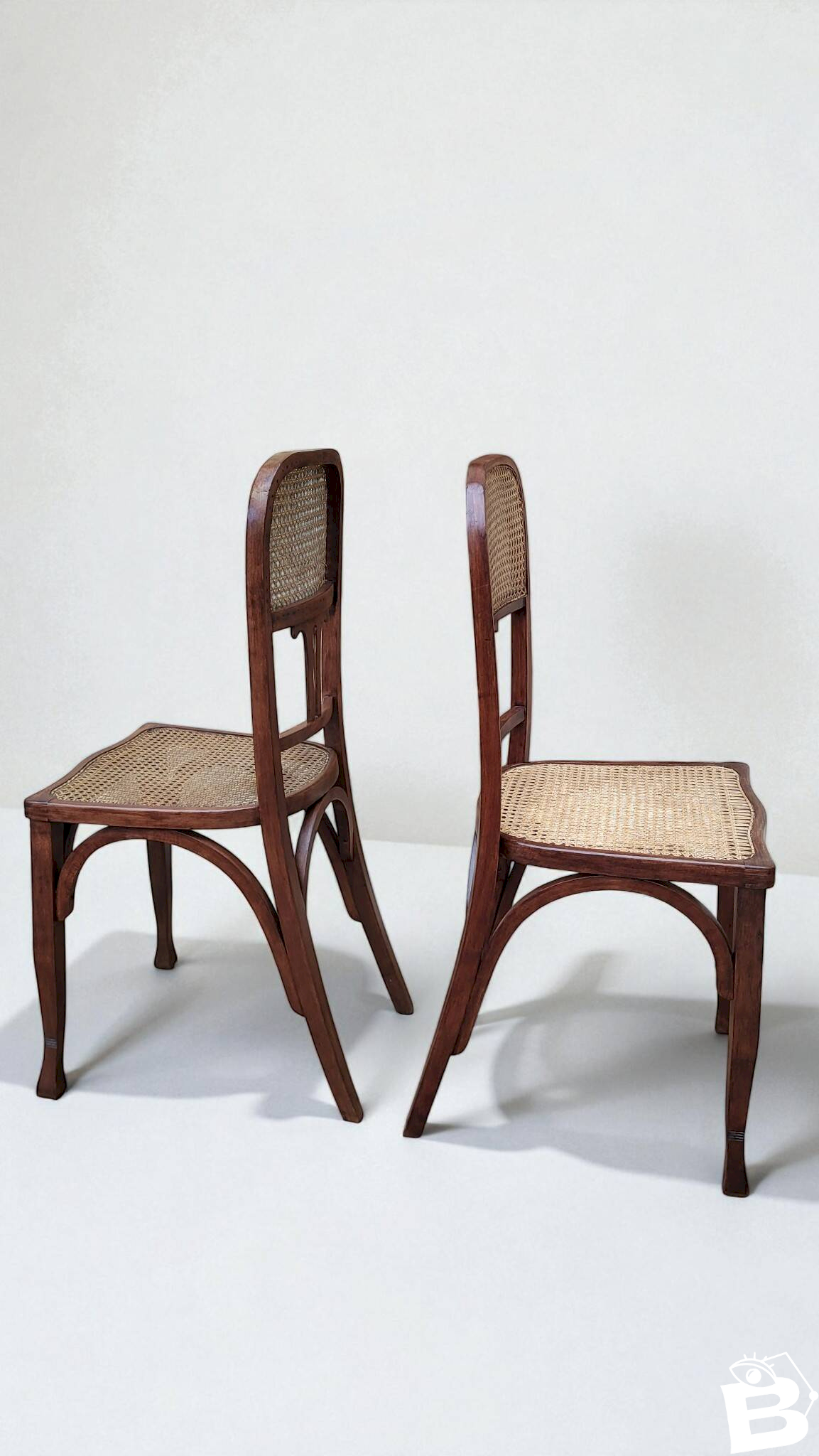 Set of 2 Art Nouveau chairs made of bent wood. Antique manual caning / 1 seat with new manual caning. In good condition with signs of use and age. Height 92 cm. Seat height 47 cm. Width 38.5 cm. Depth 38.5 cm. L: 38 W: 38 H: 92.