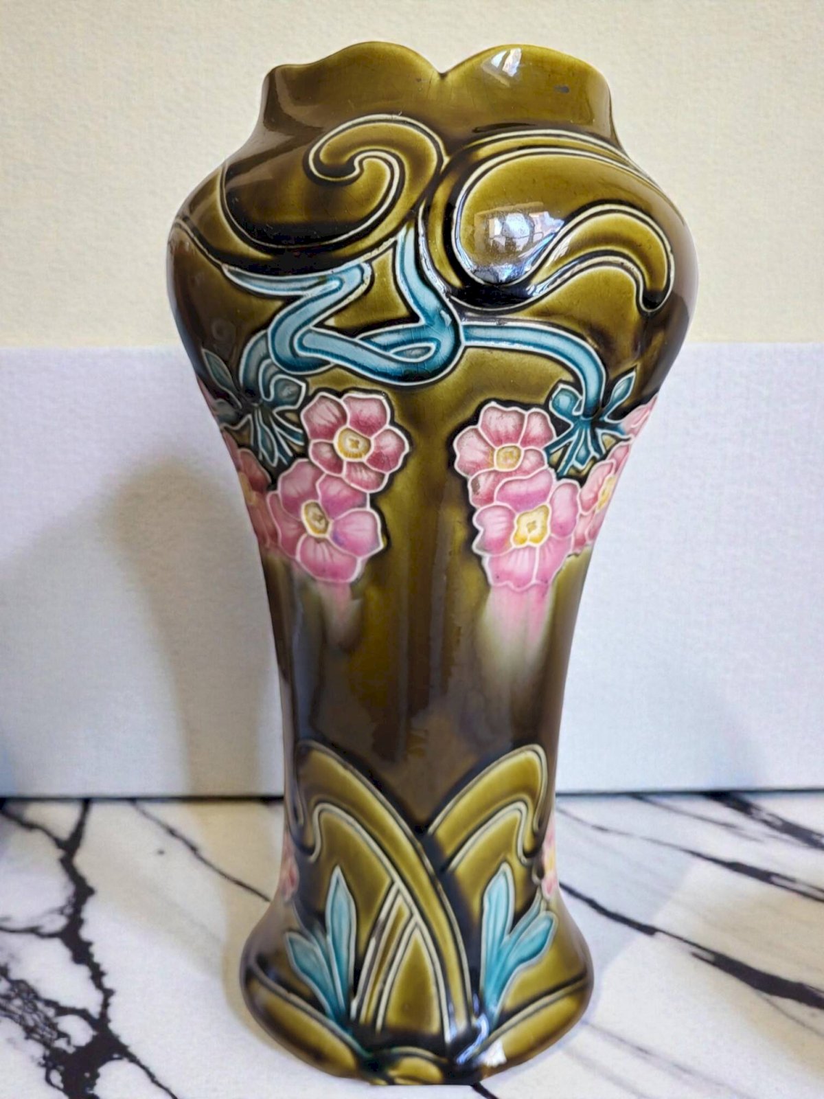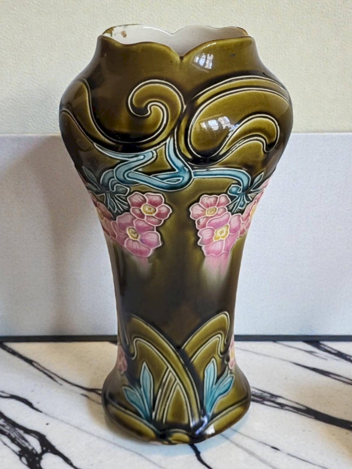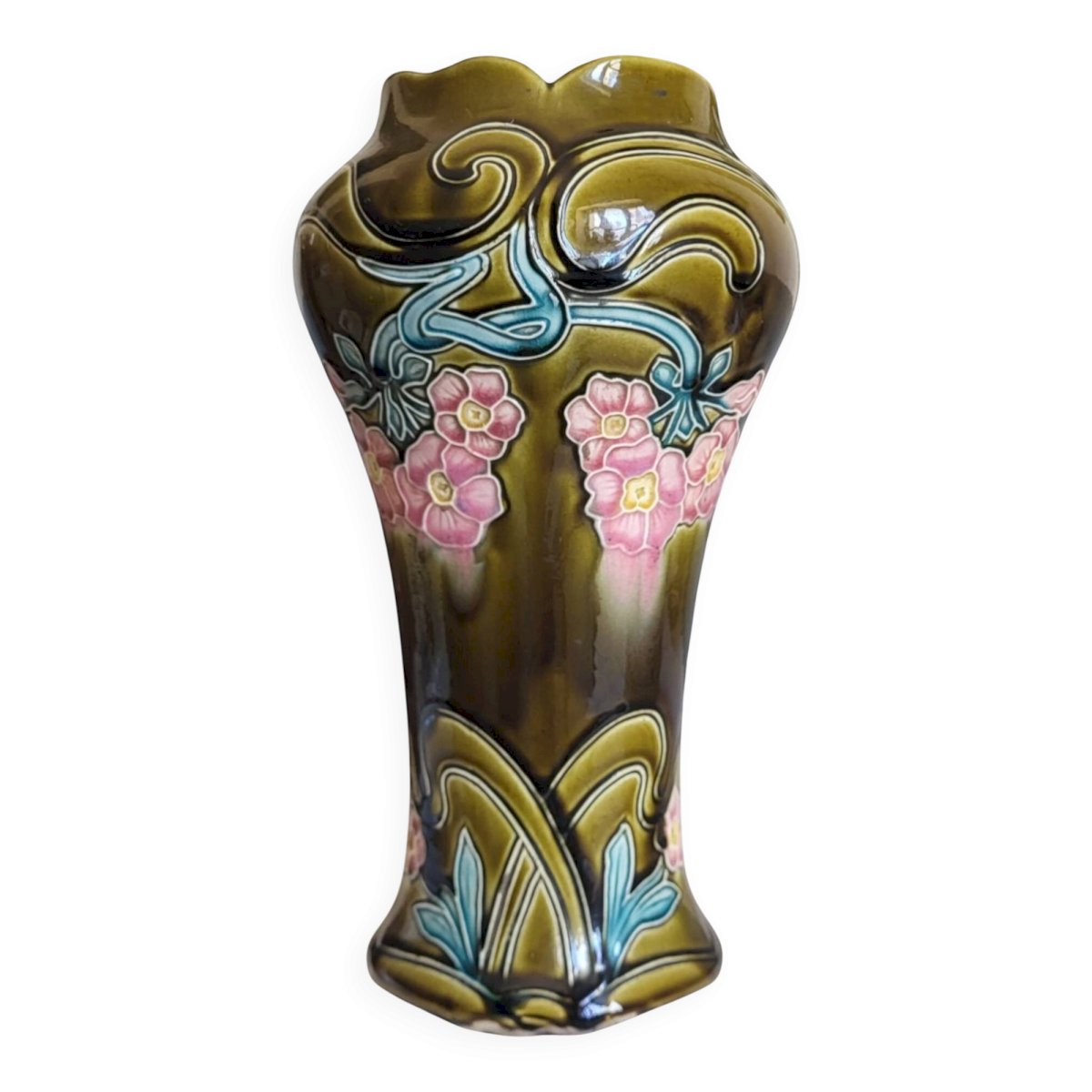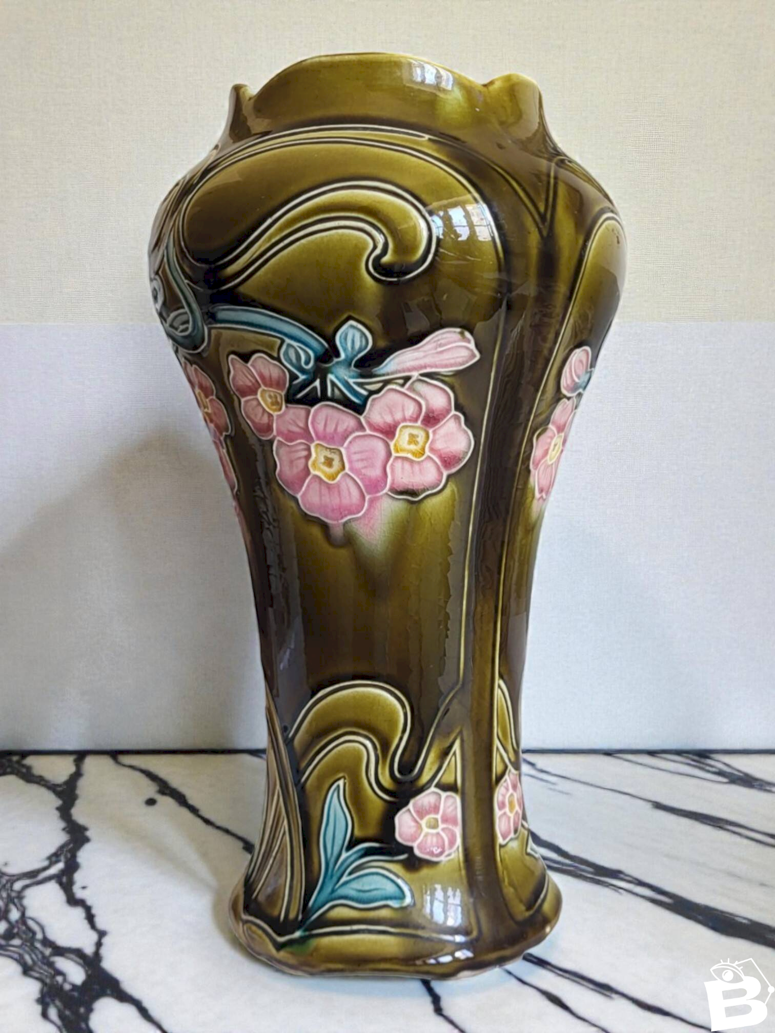 Art Nouveau vase in majolica, Gustave de Bruyn. Height 28 cm. Maximum diameter approximately 15 cm. In very good condition with signs of aging. L: 15 W: 15 H: 28