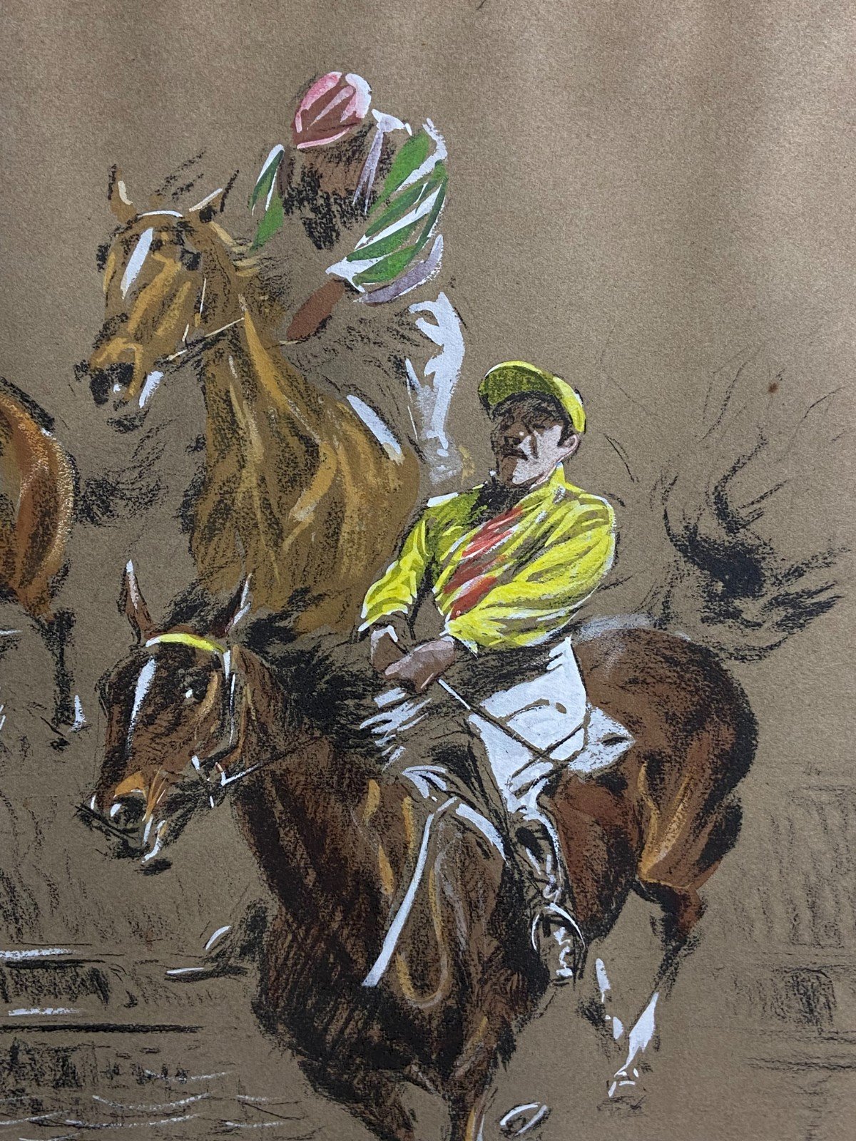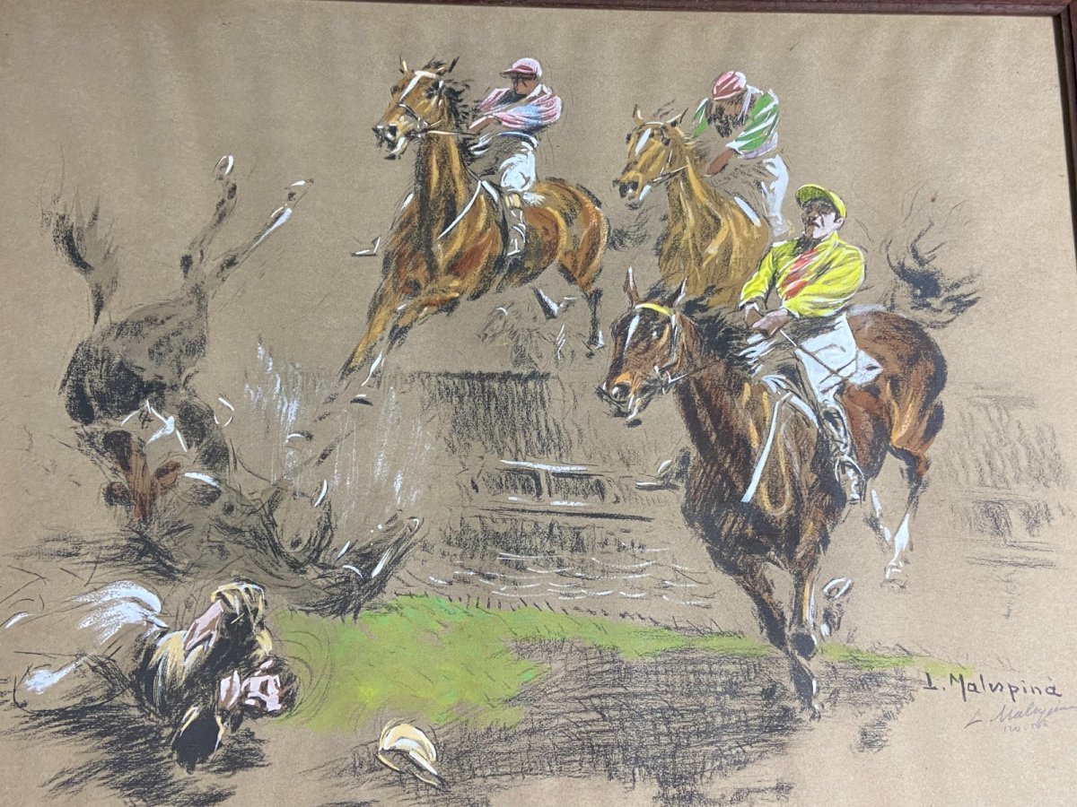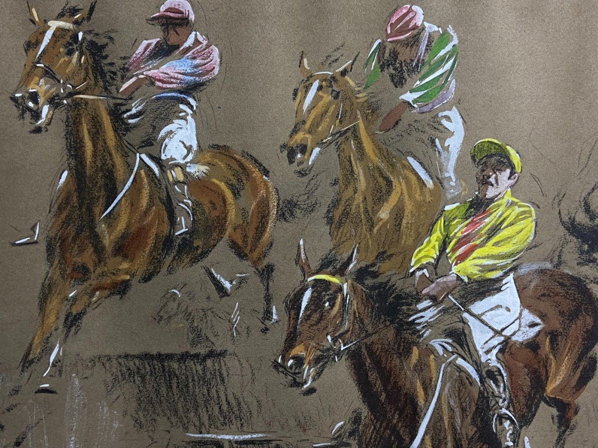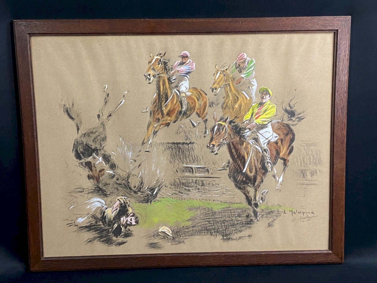 Beautiful original Art print depicting spectacular scenes of horse racing with falls from obstacles, jockeys in mid-jump, and perfectly captured movements. Artist's proof numbered, enhanced by hand by the artist and signed Louis-Ferdinand Malespina 1874-1940. - Pastel visible on bright colors (yellow, pink, green) - Charcoal for volumes and shadows - White gouache for bright highlights on the horses, reflections... - Double signature Very good condition Maximum dimensions with frame: 66 x 51 cm Dimensions of the view only: 60 x 45 cm Weight: 1703 grams - Ultra-secure shipping worldwide - Order pick-up possible by appointment, rue Notre-Dame in Bourges. - Possibility of grouping within the same package: please contact me in advance so I can calculate your optimized shipping costs. Authenticity: Original Type: Print Country of origin: France Support: On paper Characteristics: Framed Theme: Animals