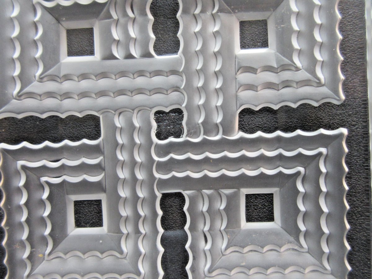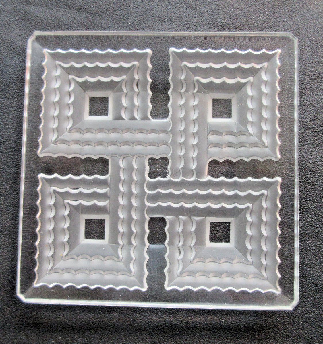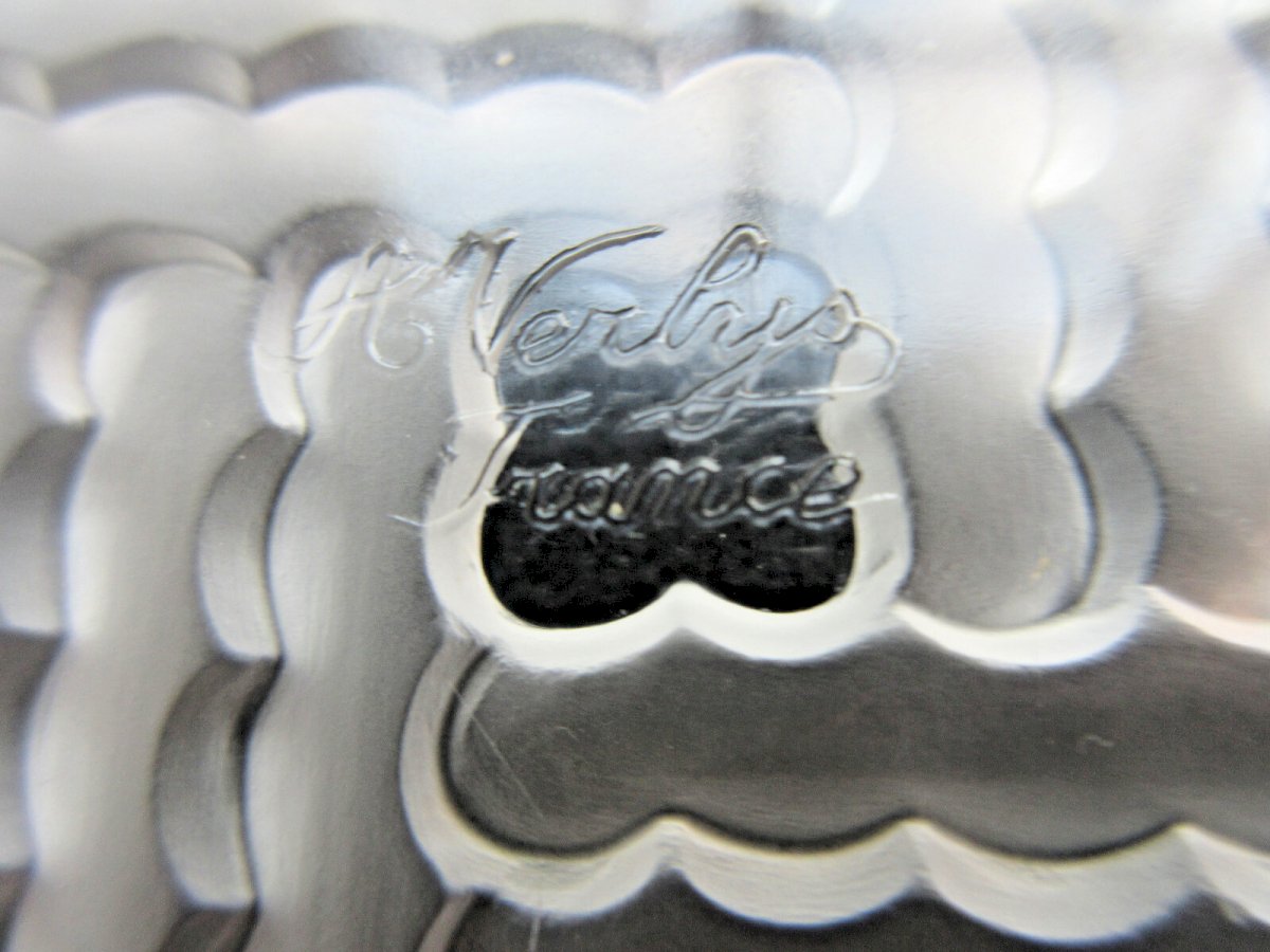 Worldwide sale. VERLYS bowl. Superb square glass bowl with thick sculpted glass featuring interlaced friezes in the style of Lalique. It rests on four short square feet. In the center, the signature A.Verlys France for Andelys Verlys. 14 cm on each side and 2 cm in height. Good condition, no defects. Beautiful small authentic bowl for collectors. The photos complete the description. In the last photo, a second bowl is available for sale. Authenticity: Original Brand: Verlys Type: Showcase object, Decorative Period: 20th-century design Origin: France Subtype: Bowl Material: Glass Style: Lalique