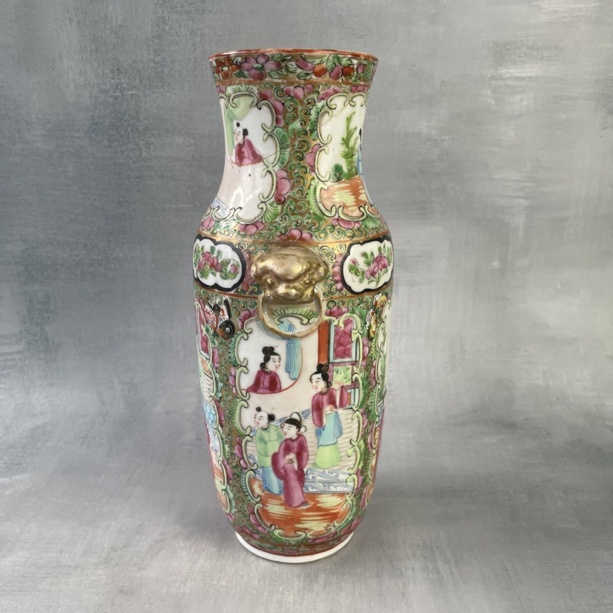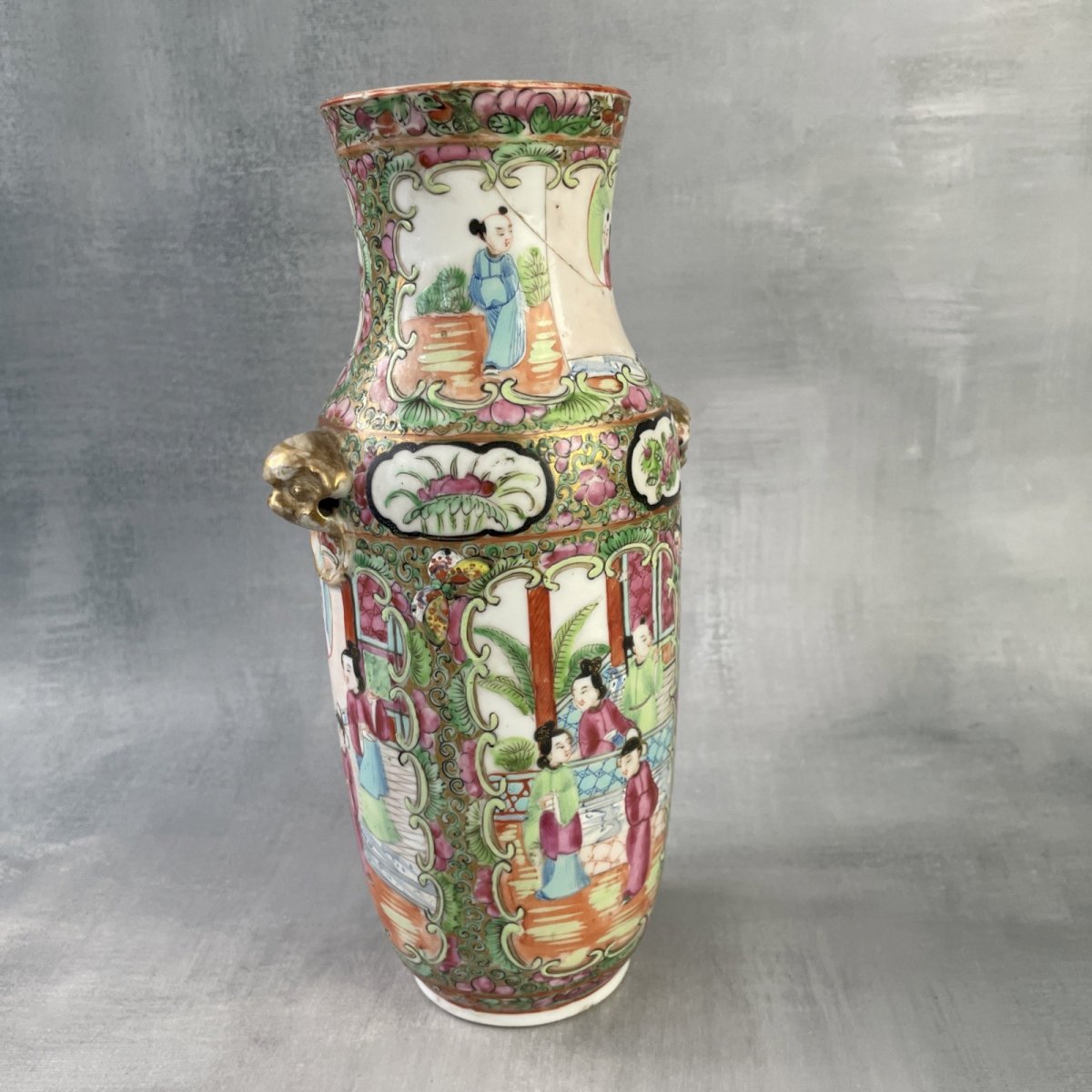 ASIA China antique famille rose porcelain vase to restore Height ~ 23.5 cm Base diameter ~ 6.3 cm Total weight ~ 0.6 kg Broken neck re-glued, missing gilding and chips on the relief heads, see photos Remember to group your purchases to reduce shipping costs! Country of origin: China
