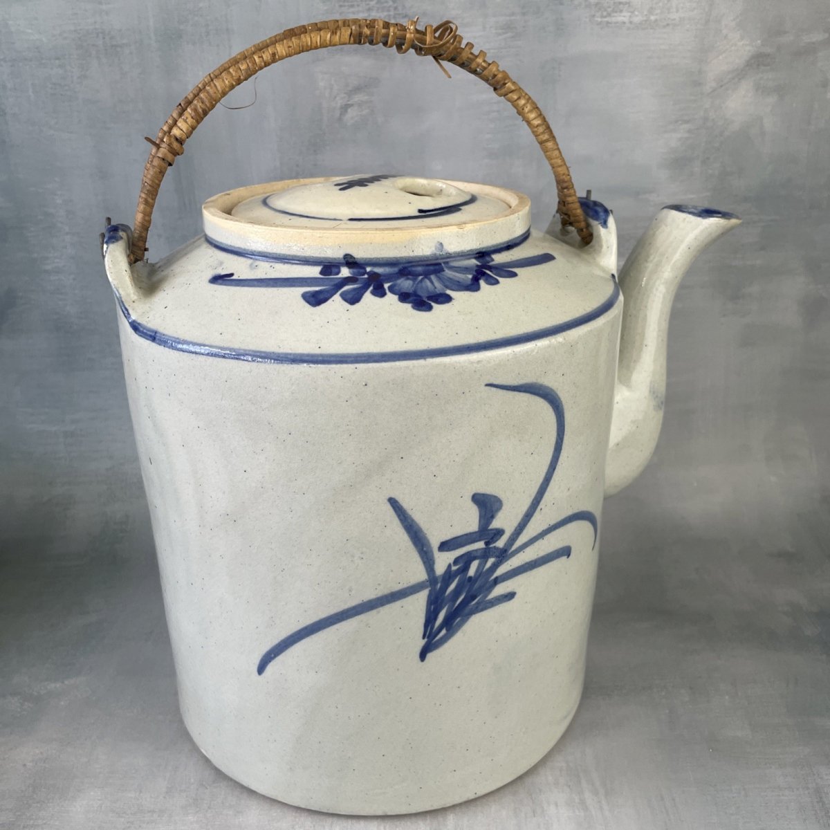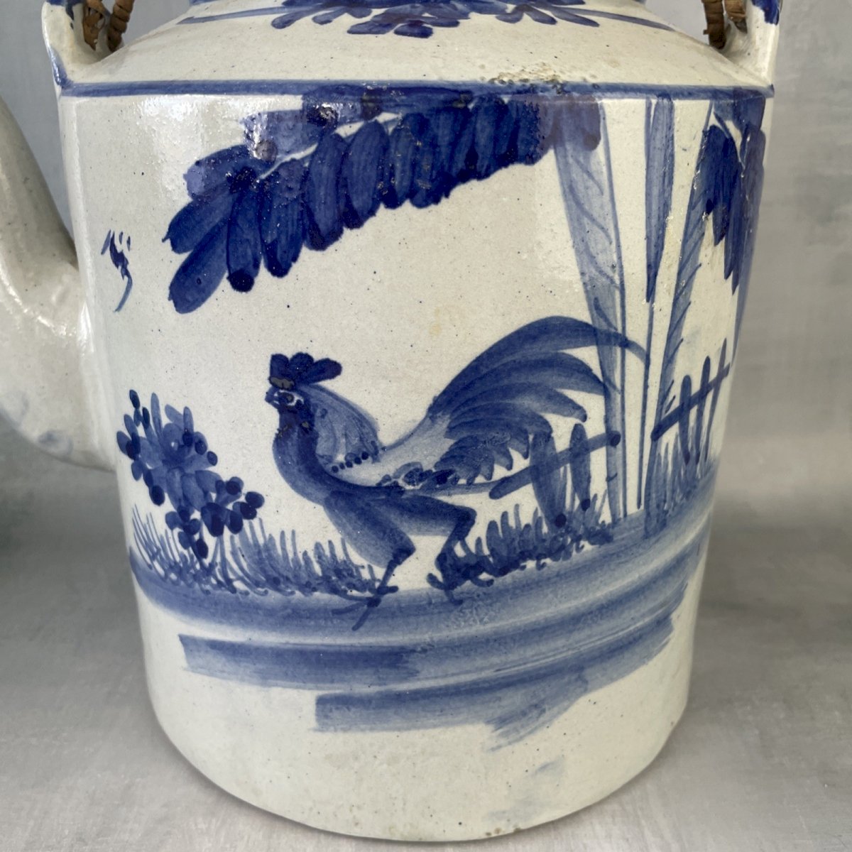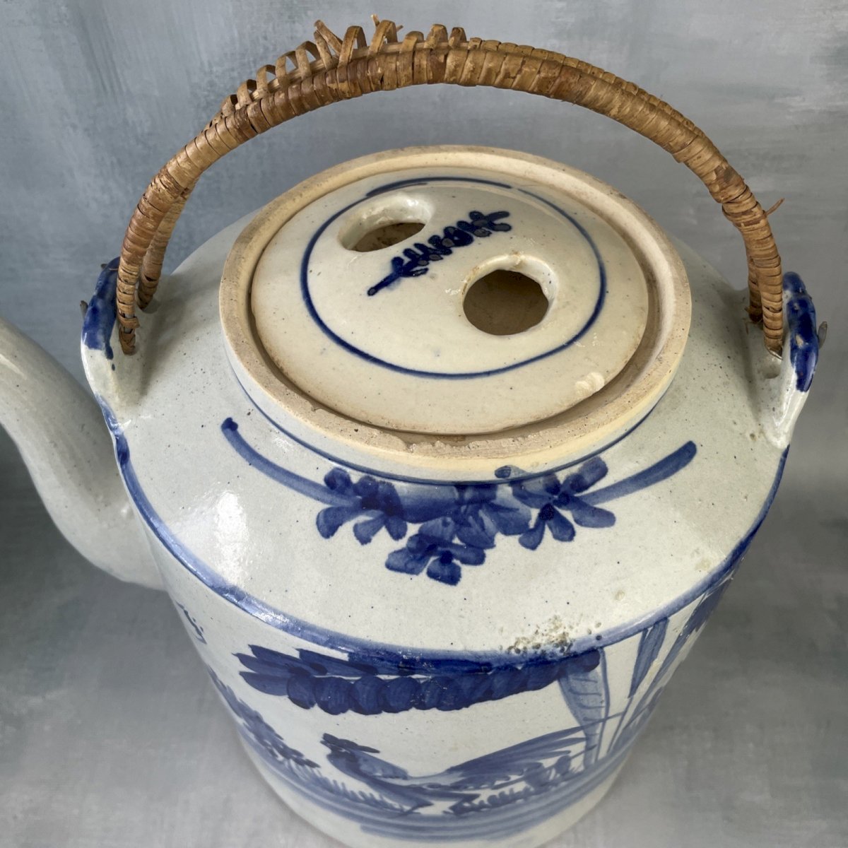 ASIA CHINA very large family-sized stoneware teapot decorated with a blue rooster Height ~ 23.5 cm Base diameter ~ 20 cm Total weight ~ 2.8 kg Good condition, signs of time, damaged handles (to be replaced or repaired), chips and small enamel jumps, chipping where the lid rests, see photos. Please consider grouping your purchases to reduce shipping costs! Country of origin: China