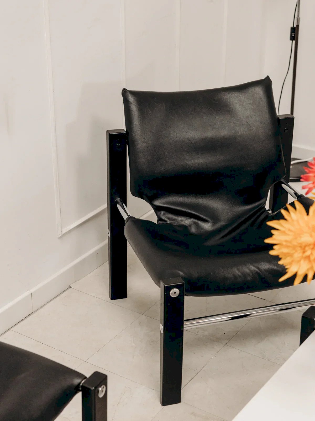 Discover the vintage Arkana set designed by Maurice Burke (United Kingdom, 1970s), consisting of two low armchairs in black leather and a coffee table with a white top. The armchairs combine padded leather seats and backs with a structure of black lacquered wood and chrome metal tubes for enveloping comfort and a graphic silhouette. The coordinated coffee table, featuring a white top placed on a wood and metal frame, adds a bright touch and a compact size suitable for contemporary living rooms. Clean lines and noble materials create a retro and refined atmosphere. Light traces of time contribute to its charm. Armchair dimensions: Width: 64 cm Height: 68 cm Seat height: 38 cm Depth: 64 cm Seat depth: 40 cm Coffee table dimensions: Length: 63 cm Width: 60 cm Height: 38 cm Condition: Used: Item has been used. Item shows some signs of superficial wear, fully operational and functioning correctly. It may be a display model or an item returned to the store after a short period of use. Any imperfections. Brand: Debongout Type: Thrifted product Material: Leather, Wood, Metal Style: Contemporary Custom: Table and chair sets