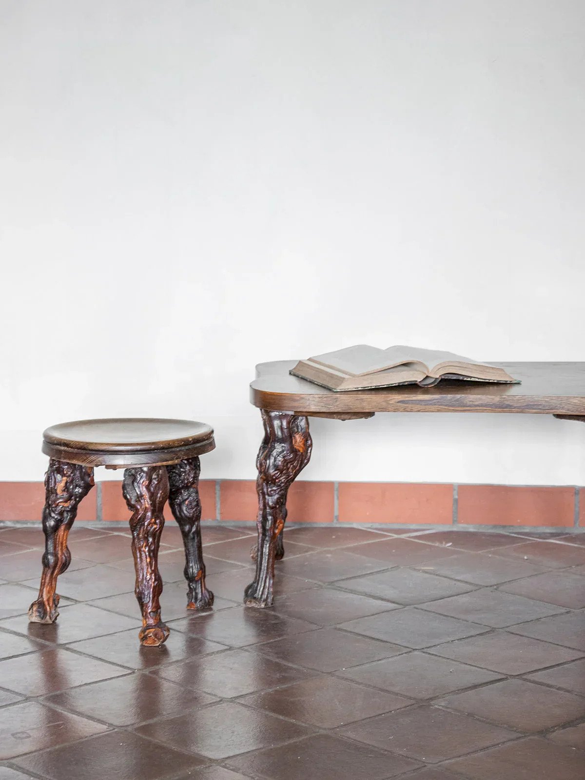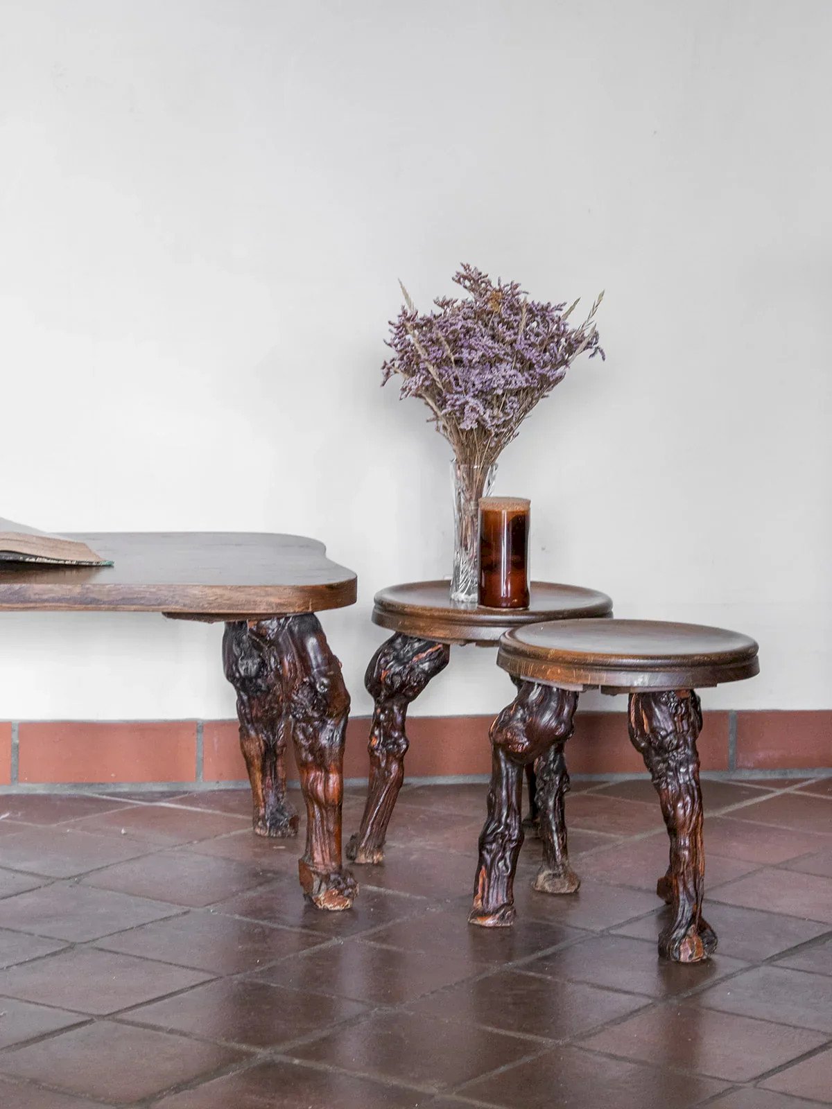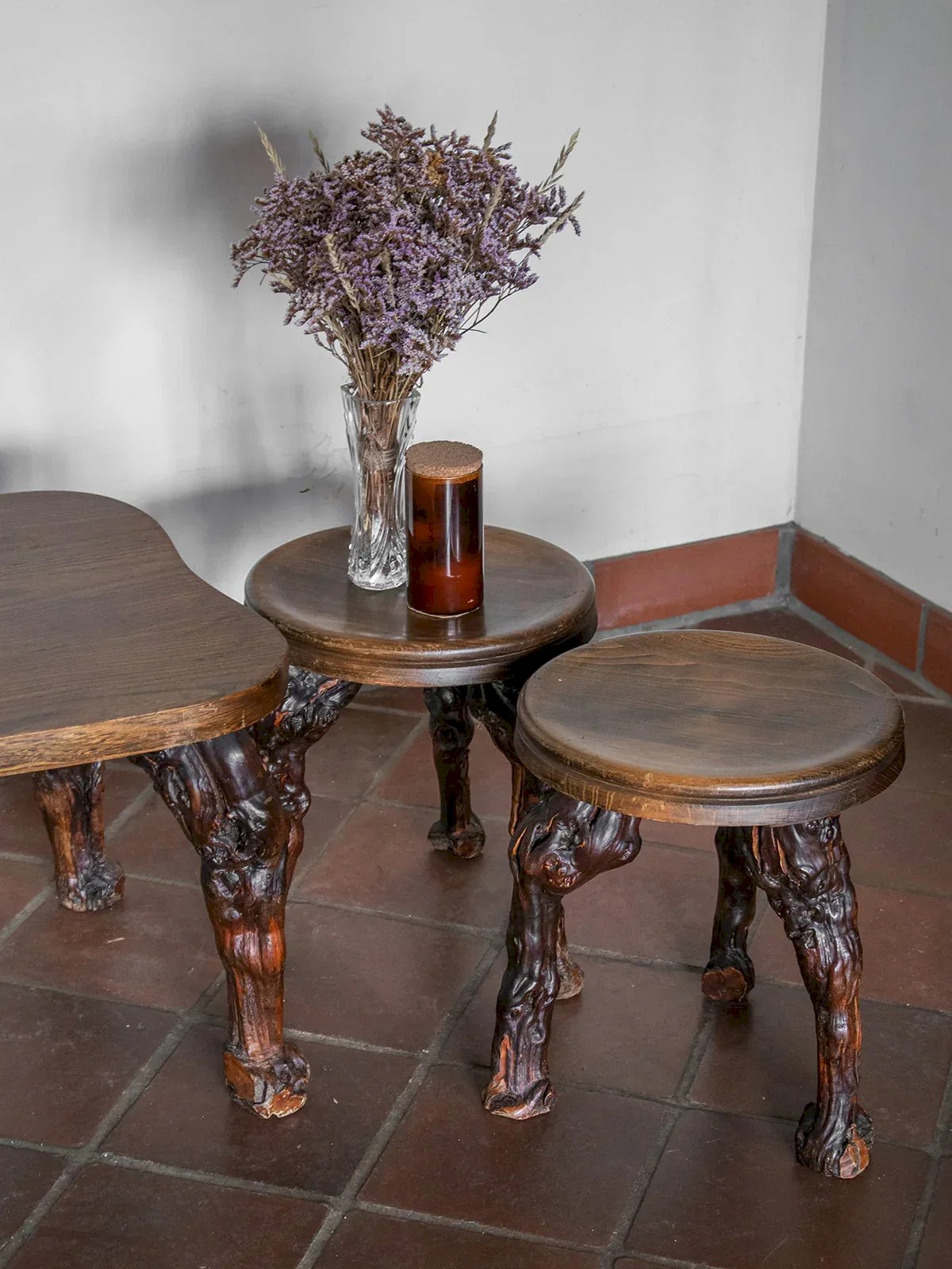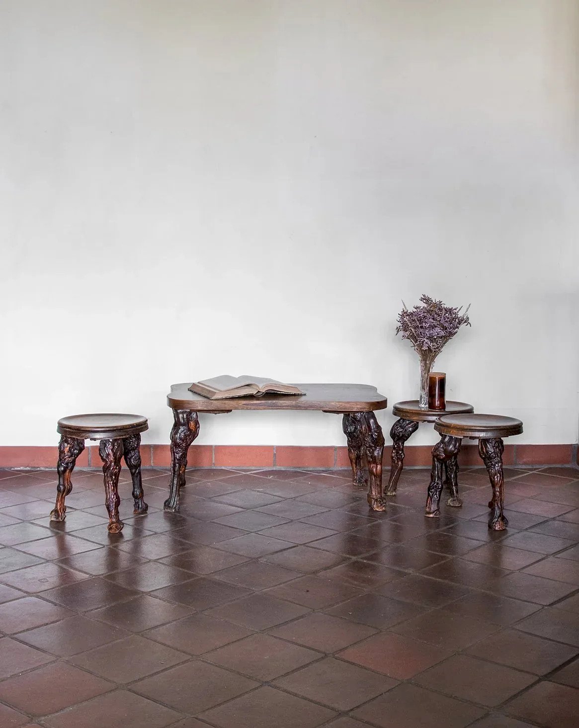 Discover this brutalist-style table and stool set, perfect for adding a touch of authenticity to your interior. Composed of three round stools with comfortable dimensions, this set harmoniously pairs with a table featuring a clean design. With its bold silhouette and robust appearance, this set is ideal for enhancing your living space and giving it more character. Length: 76 cm Width: 45 cm Height: 38.5 cm Seat height: 33.5 cm Diameter: 29 cm Condition: Used: Item has been used. Item showing some superficial signs of wear...Used: Item has been used. Item showing some superficial signs of wear, fully operational and functioning properly. It may be a demonstration model or an item returned to the store after a short period of use with any potential imperfections. Brand: Debongout Type: Vintage product Material: Wood Style: Contemporary Custom: Table and chair sets