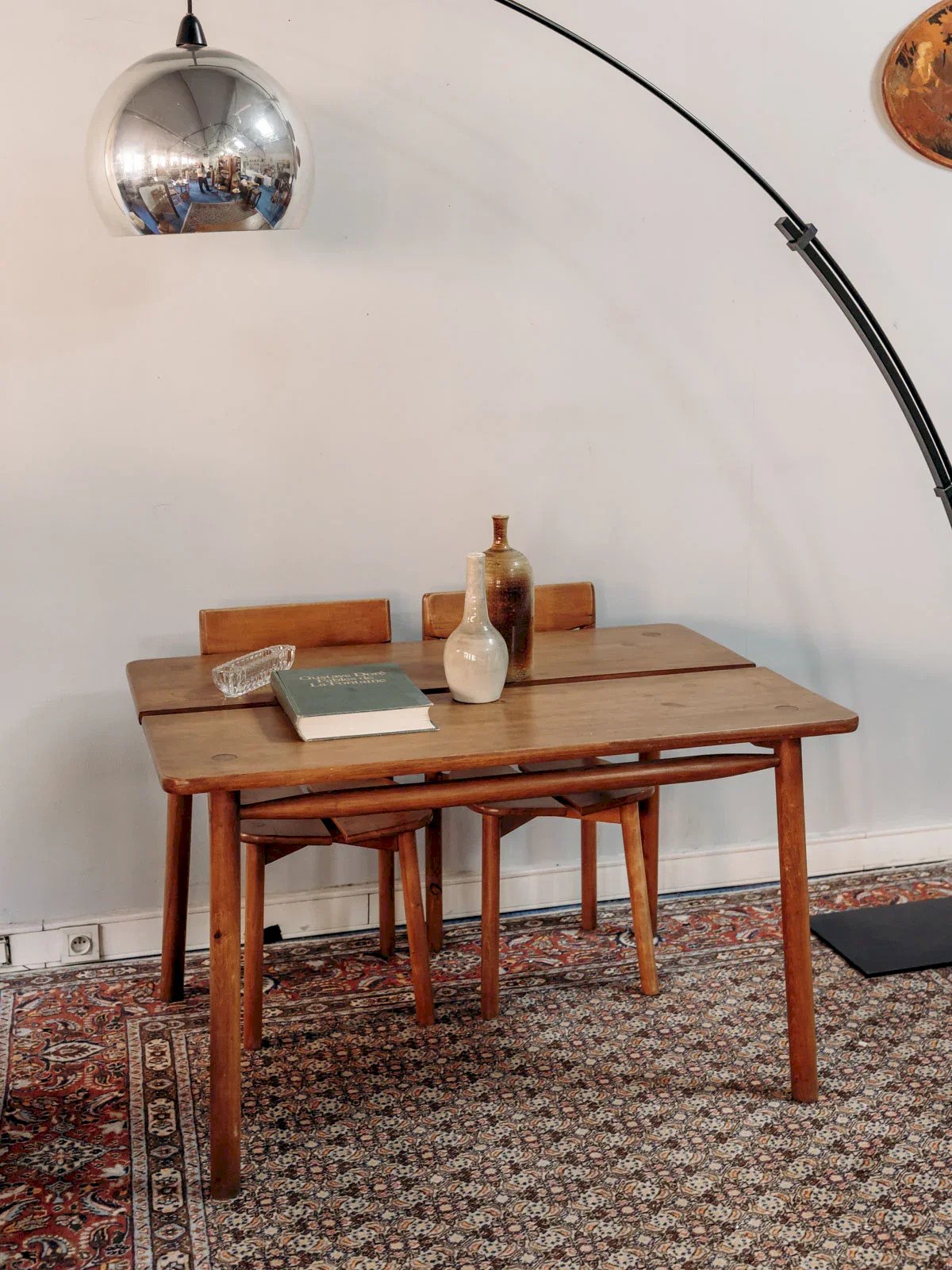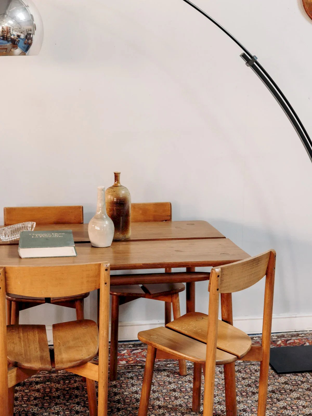 Adopt this table and four chair set made of beech designed by Pierre Gautier Delaye, a discreet embodiment of 1950s design. The light wood and clean lines provide a bright and structured look, while the compact tabletop comfortably accommodates four guests. The chairs, with their generous backrest and well-proportioned seat, promise a stable and pleasant seating experience for everyday use. Ideal for an intimate dining room, it creates a warm and contemporary atmosphere. Dimensions of the table: Length: 119.5 cm Width: 79.5 cm Height: 72.5 cm Height under tabletop: 70 cm Dimensions of the chairs: Length: 41 cm Width: 39 cm Height: 80.5 cm Seat height: 45 cm Condition: Used: Item has been used. Item shows some superficial wear marks, ... Used: Item has been used. Item shows some superficial wear marks, fully operational and functioning correctly. It may be a demonstration model or an item returned to the store after a short period of use, the possible imperfections. Brand: Debongout Type: Vintage product Material: Wood, Beech Style: Contemporary Customized: Table and chair sets.