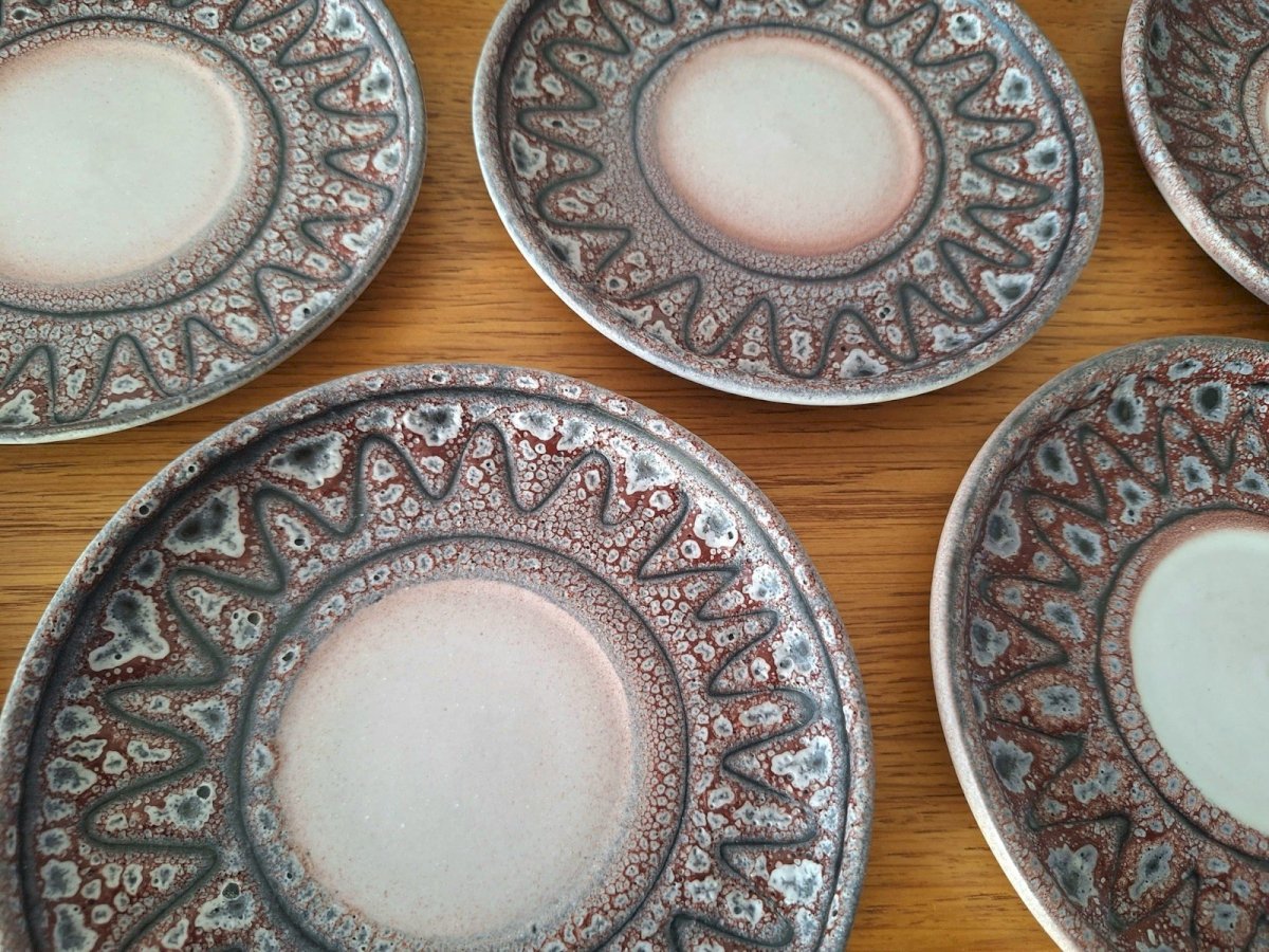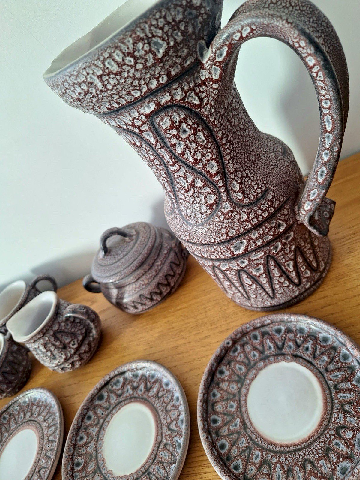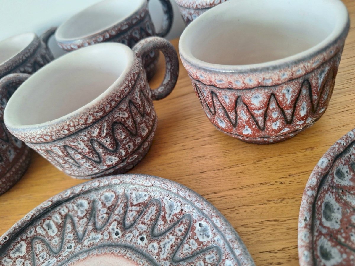 Thank you for writing to me if you would like to make me an offer. Austruy Vallauris vintage coffee service, vase, and ceramic plate, decorative empty pocket tray 36x18.5xh9cm. Vase diameter 12.5xh26cm. 13 saucers diameter 13.5cm. 10 cups diameter 7cm excluding handle, height 6cm. Milk jug height 8cm. Sugar bowl 10x15xh9cm. Indivisible lot please. Pickup at my home or delivery possible via carrier (for example, €40 to Paris and the Paris region, please contact me for other destinations). Delivery times of 2 to 4 days are imposed by and are therefore provided for informational purposes only. Ceramic decoration art porcelain Capron vase coffee pot.
