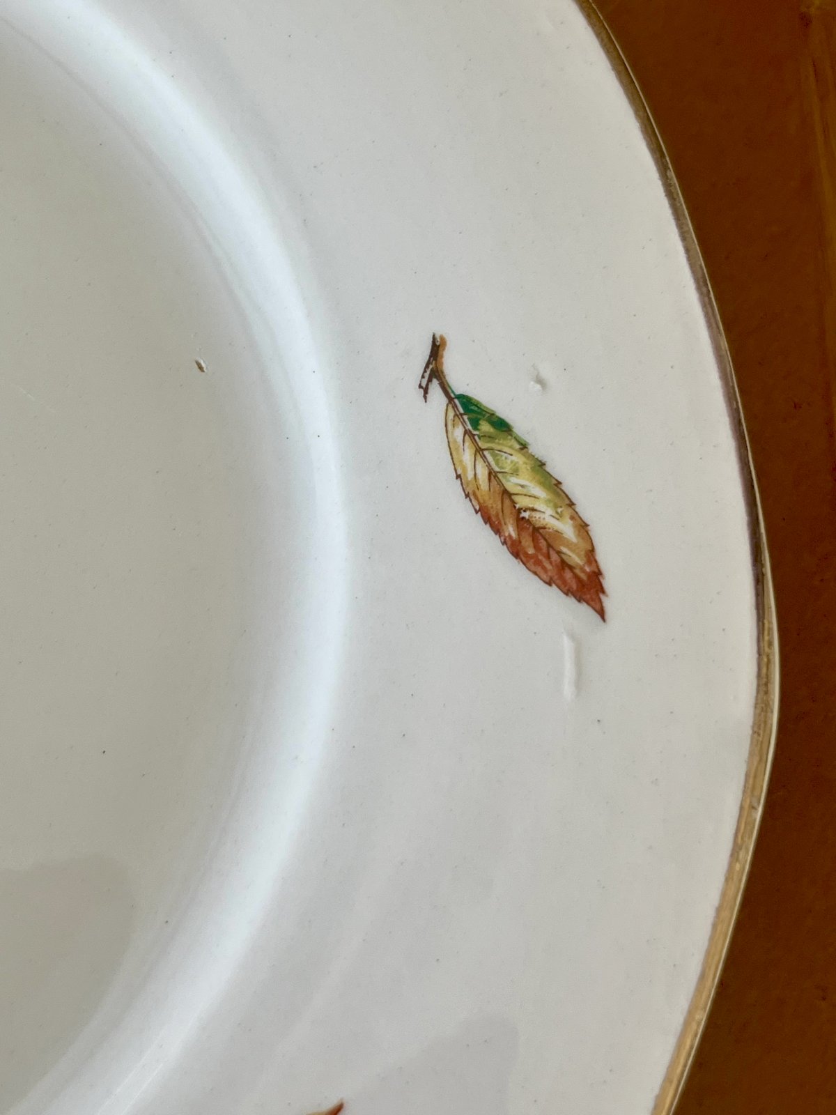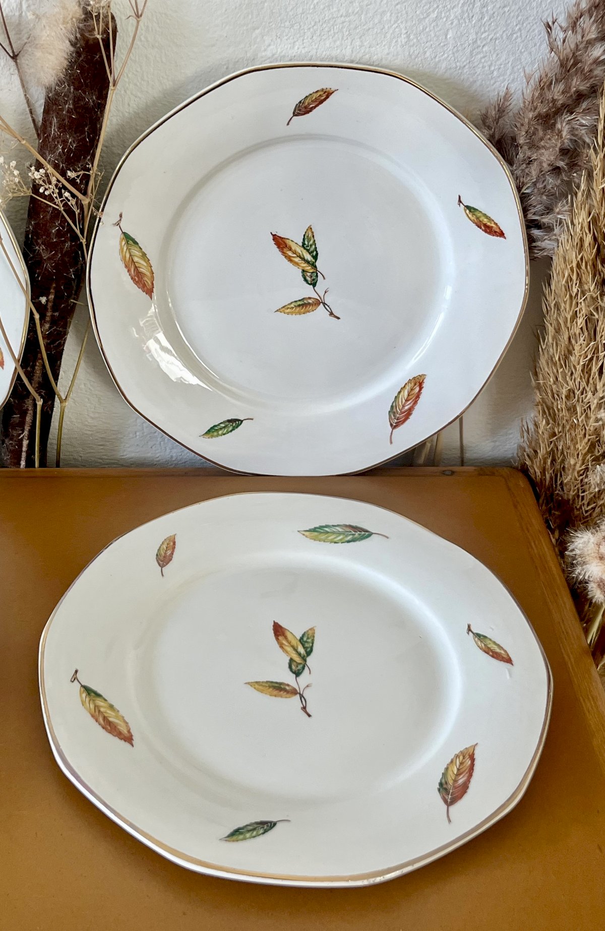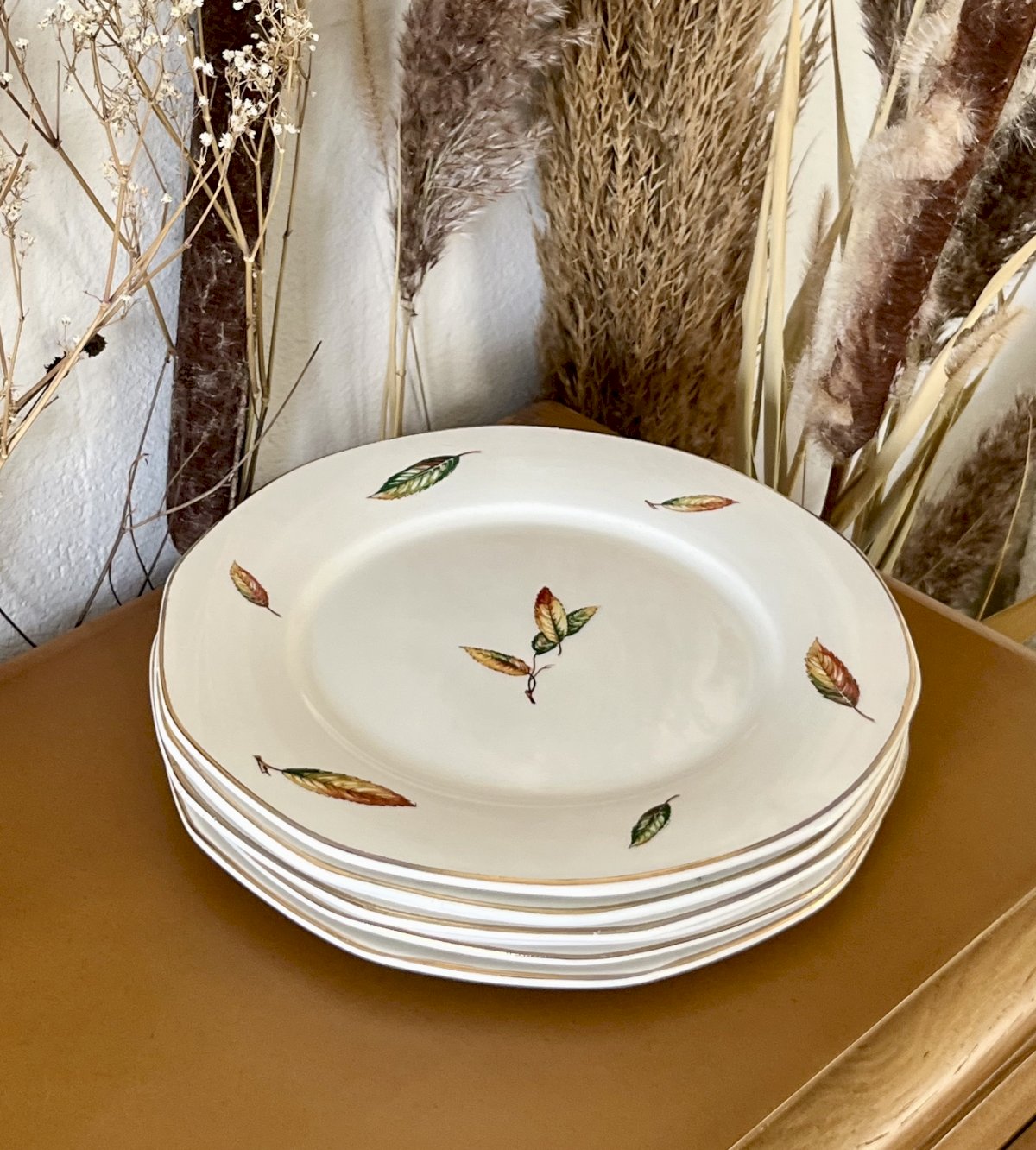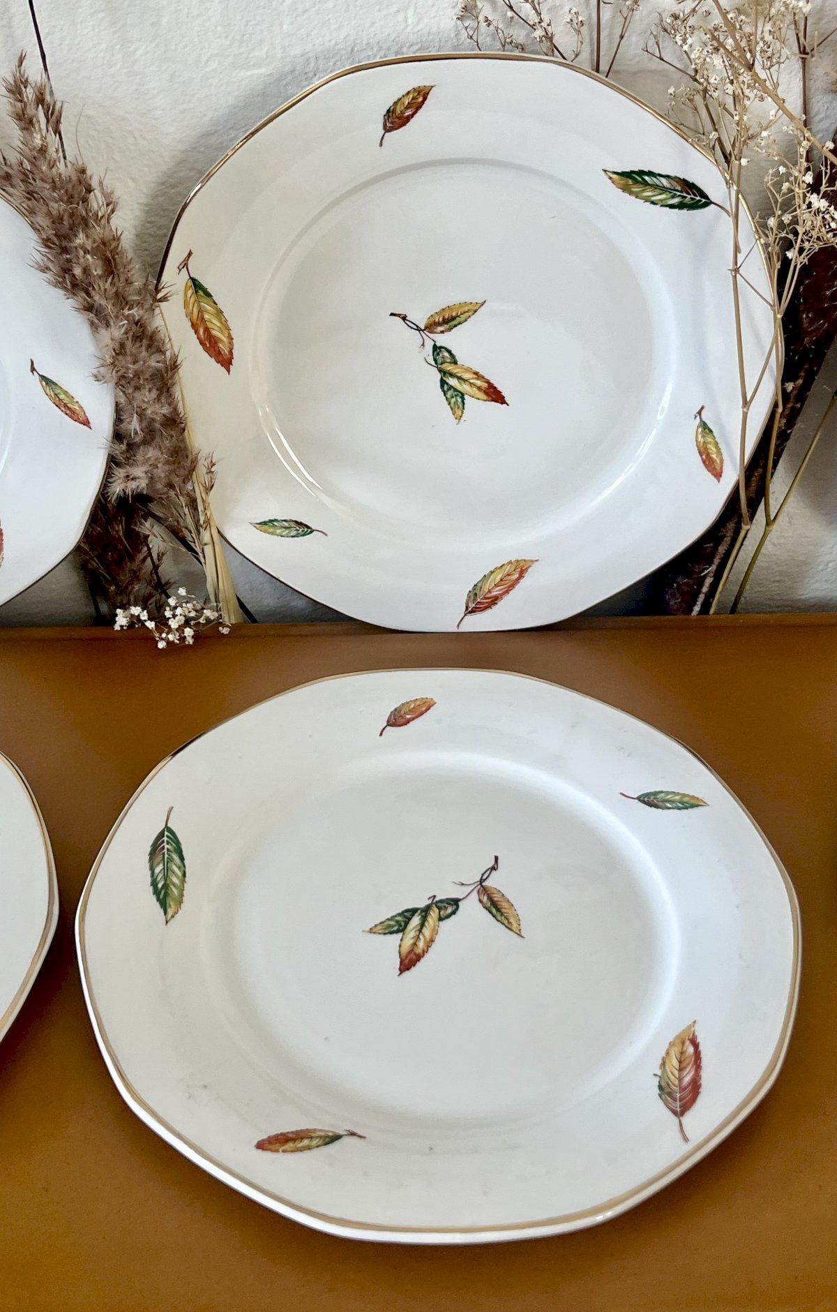 Add an autumn touch to your table with these 6 flat "Nemours" plates in cream opaque porcelain adorned with a golden trim and leaf motifs, decagonal shape. Reference lot no. 1.
