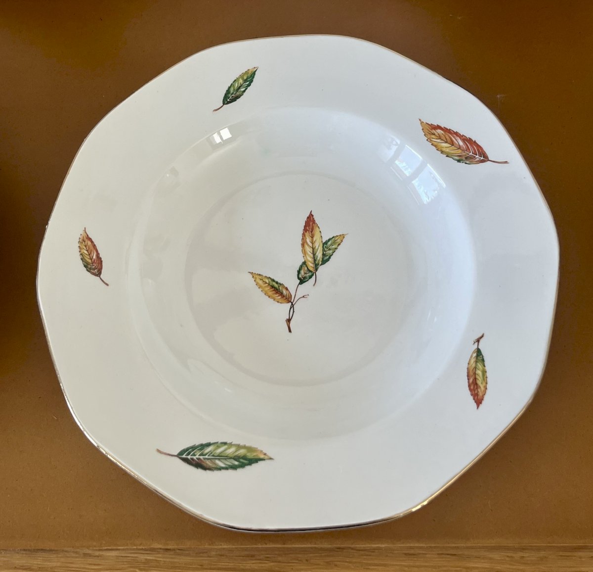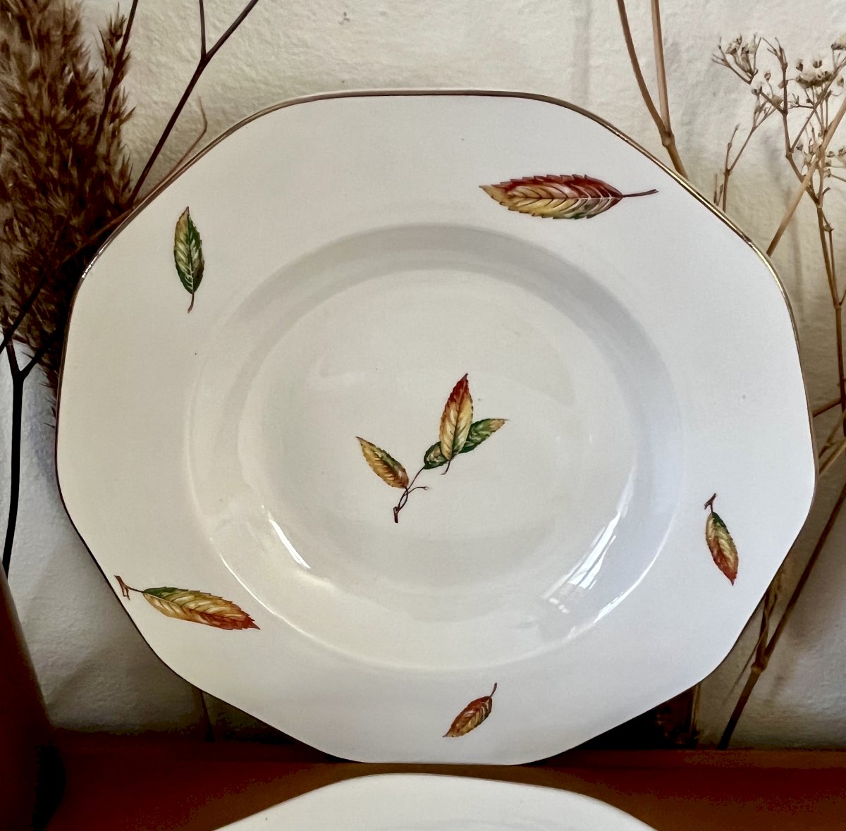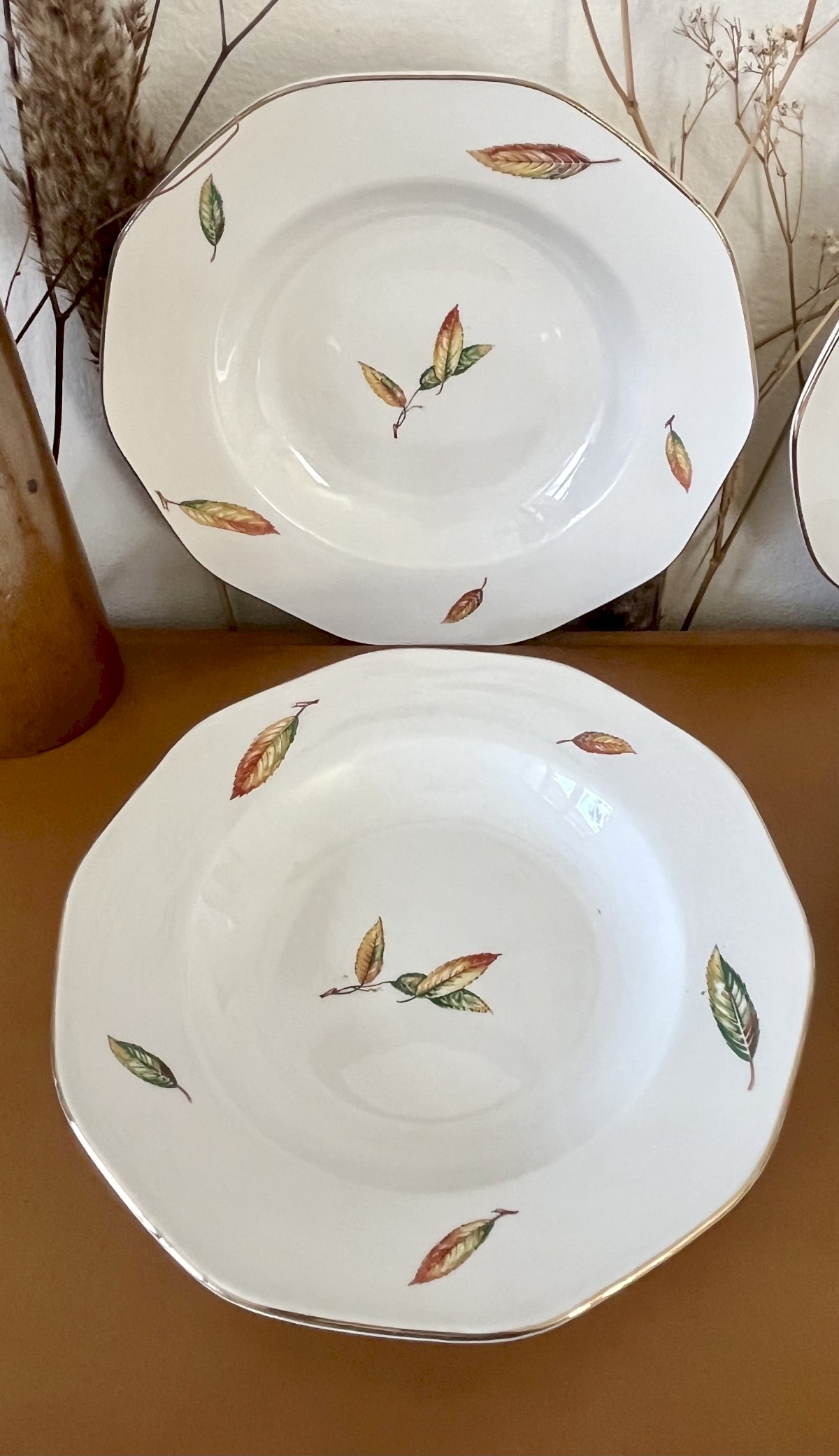 Bring an Autumnal touch to your table with these 6 "Nemours" deep plates in cream opaque porcelain adorned with a golden rim and leaf patterns, in "decagon" shape. Reference Lot No. 2.
