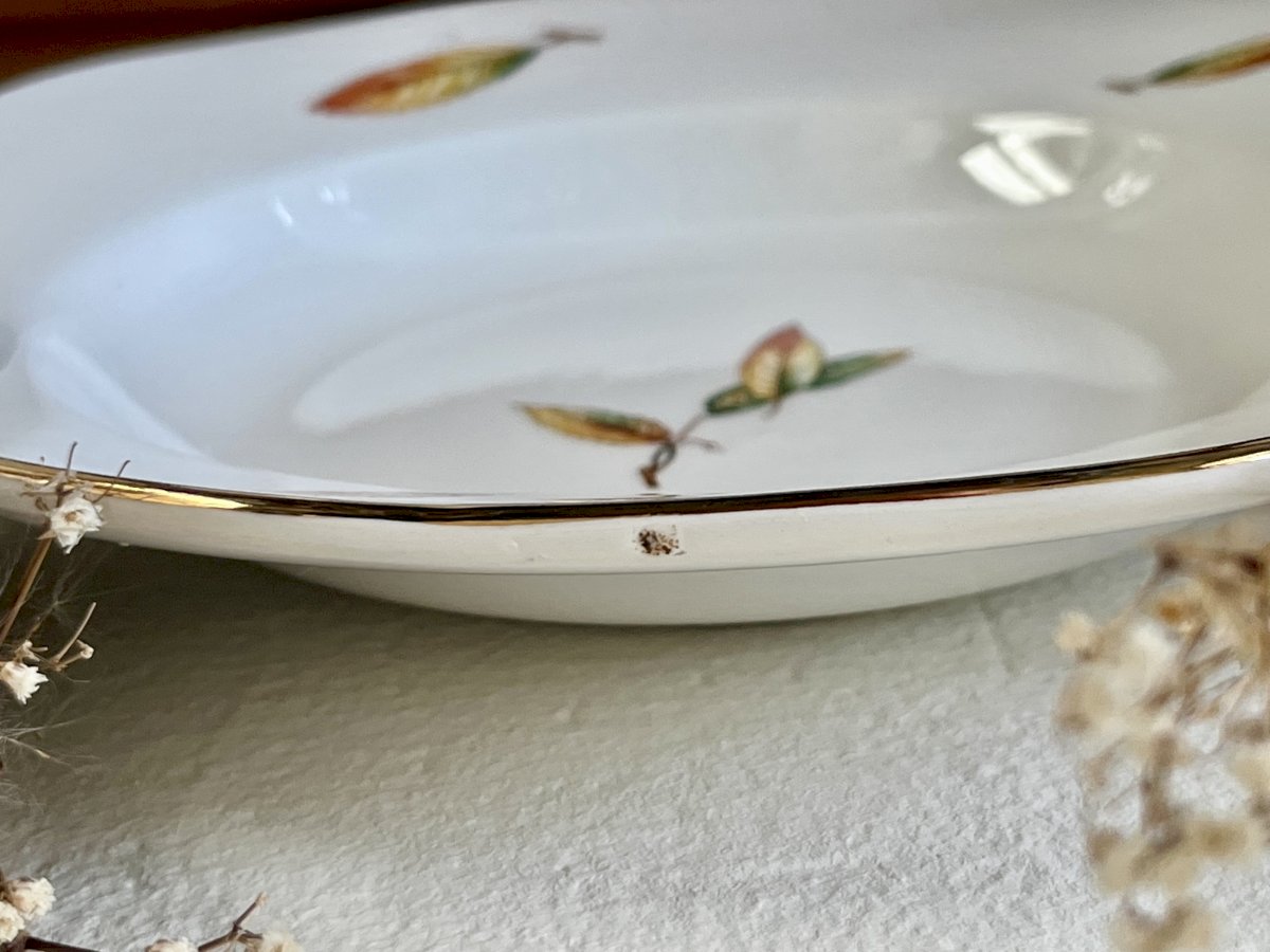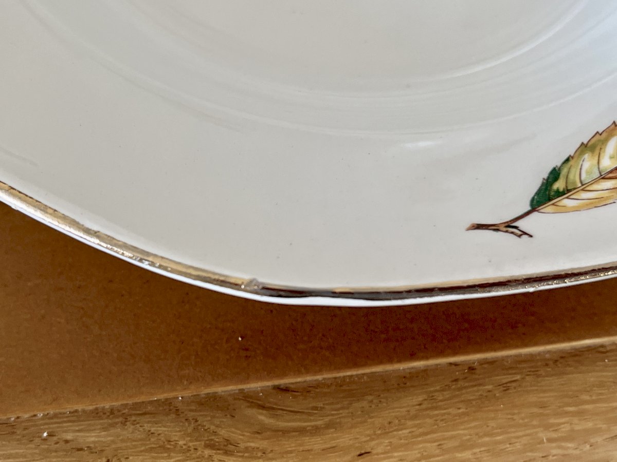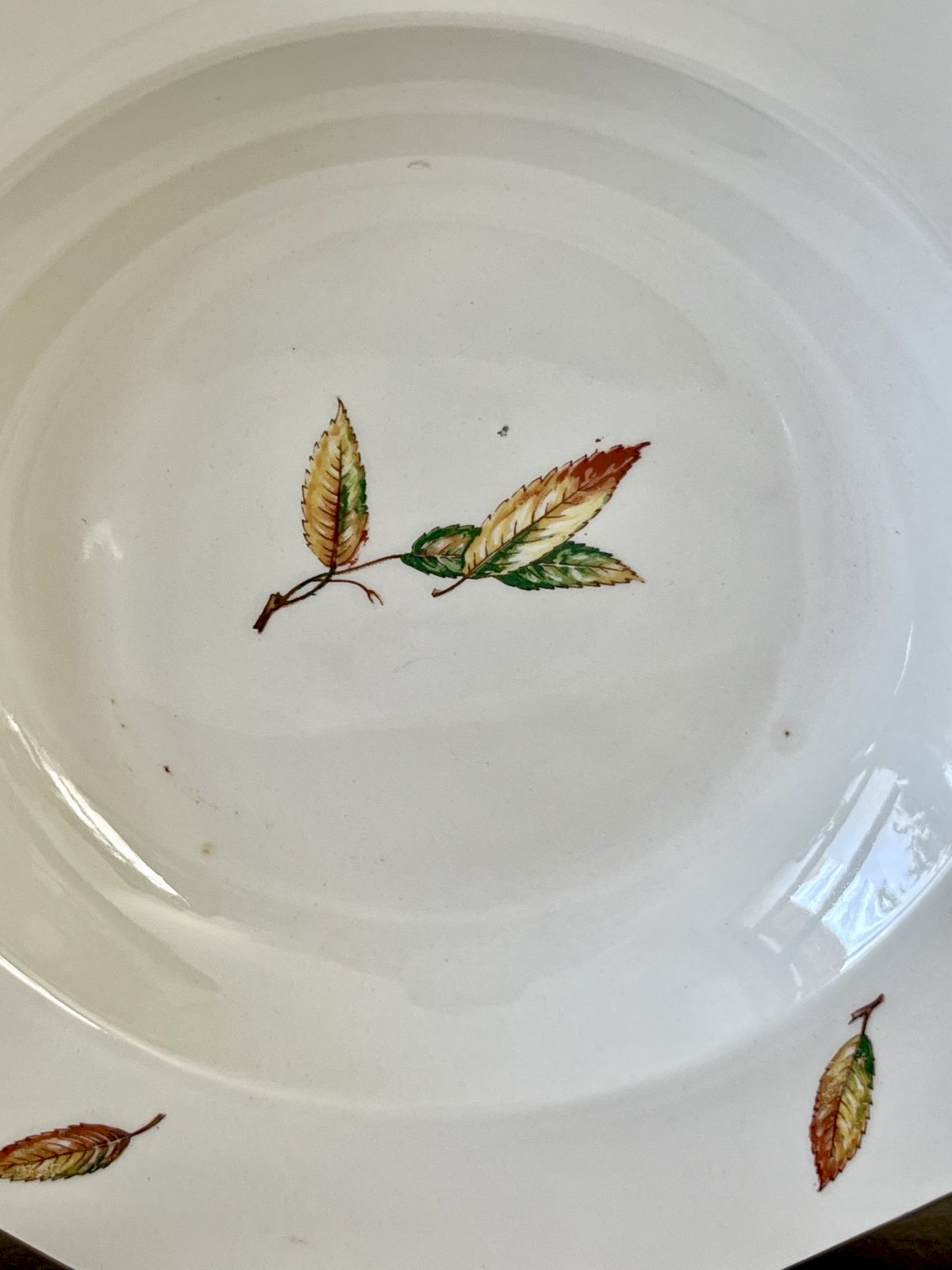 Bring an Autumnal touch to your table with these 6 "Nemours" deep plates in cream opaque porcelain adorned with a golden rim and leaf patterns, in "decagon" shape. Reference Lot No. 2.