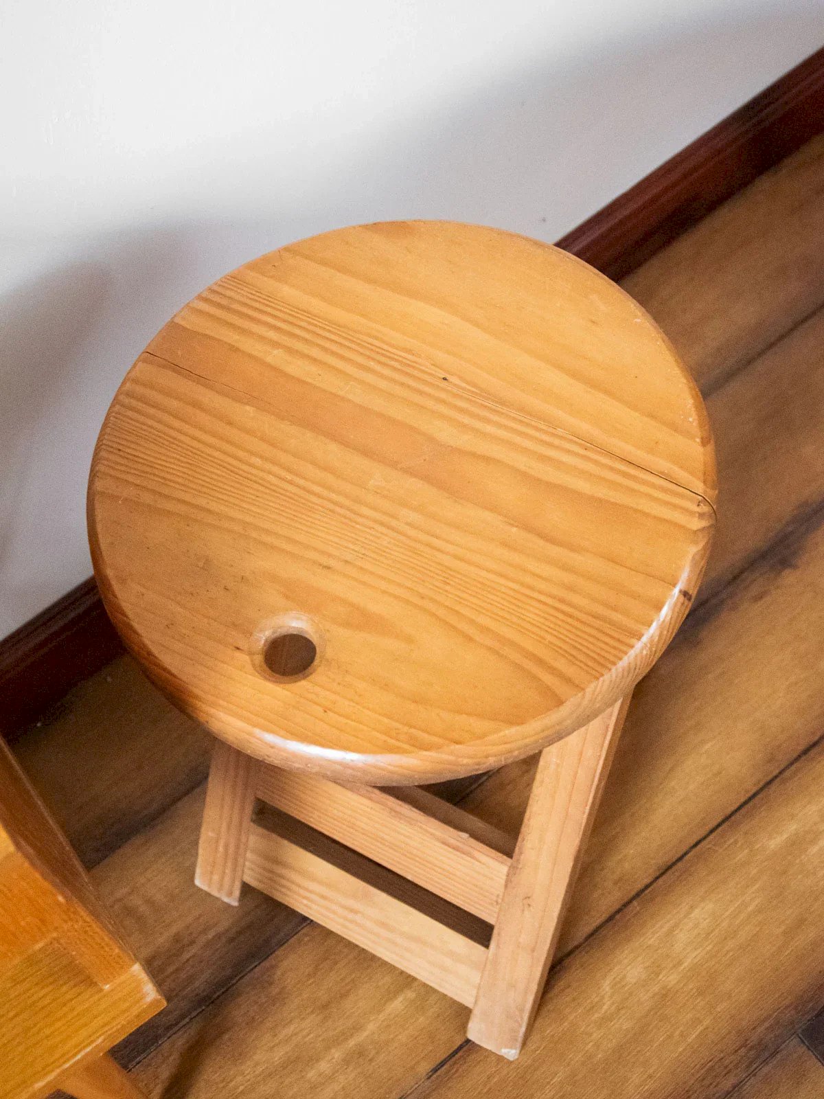 Adopt this light wood folding stool with a round seat and sleek profile that adds a warm and natural touch to any interior. Designed for easy transport, it folds with a single movement thanks to an ingenious hook on the seat, making it ideal for small spaces, balconies, or convivial moments outdoors. Its lightness and understated silhouette make it a versatile and elegant extra seat. Signs of wear present. Height: 45 cm Diameter: 30 cm Condition: Used: Item that has been used. Item showing some superficial signs of wear, ...Used: Item that has been used. Item showing some superficial signs of wear, fully operational and functioning correctly. It may be a demonstration model or an item returned to the store after a short period of use, with possible imperfections. Color: Multicolor Height: Wood Width: Low stools Brand: Debongout Type: Thrifted product Material: Wood Style: Contemporary