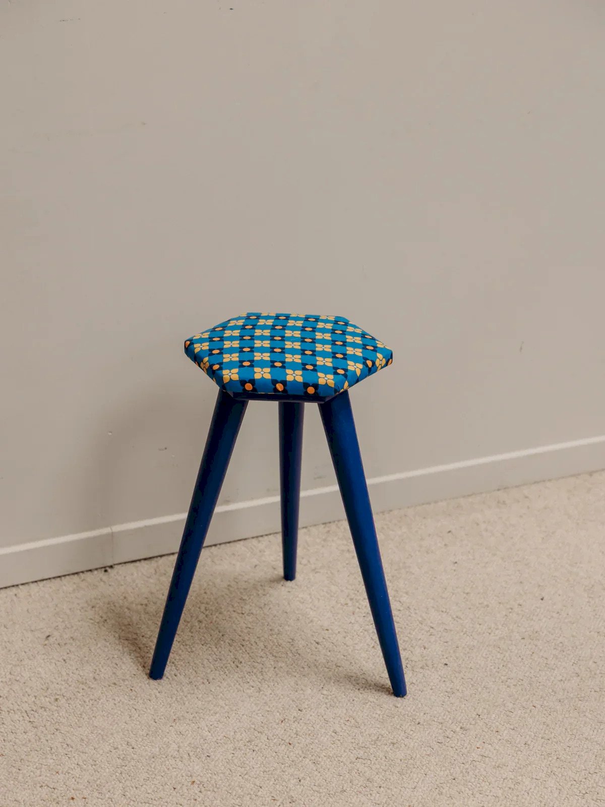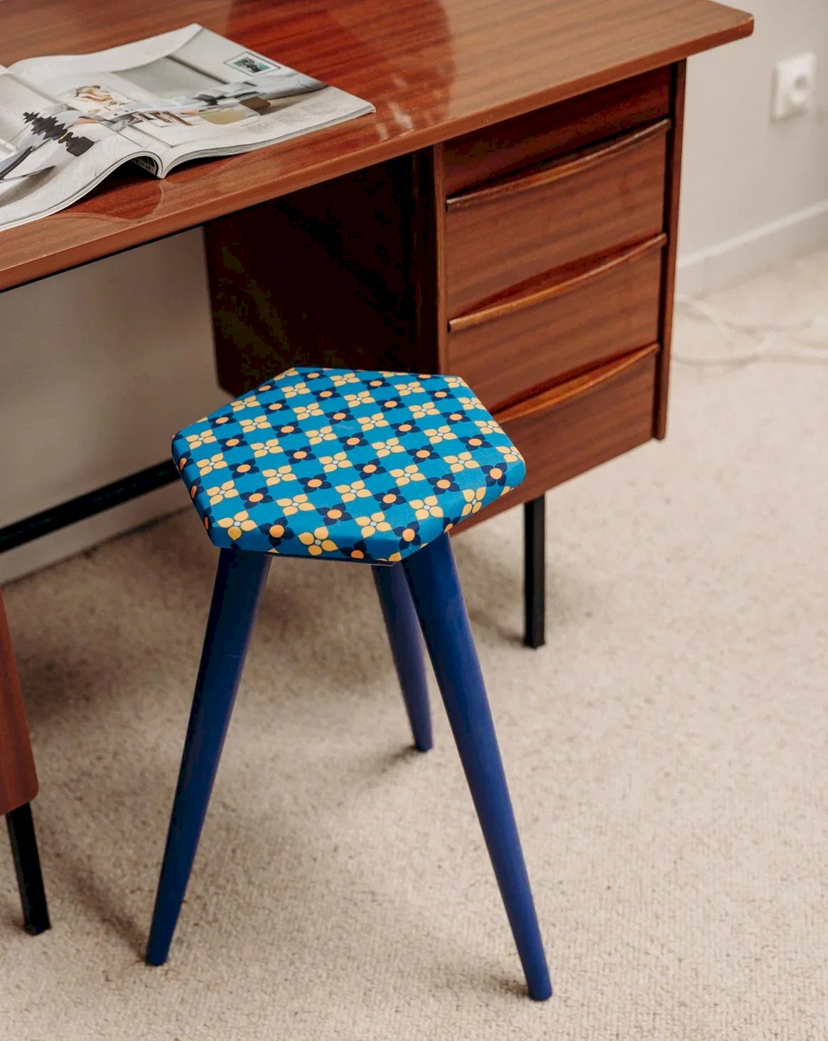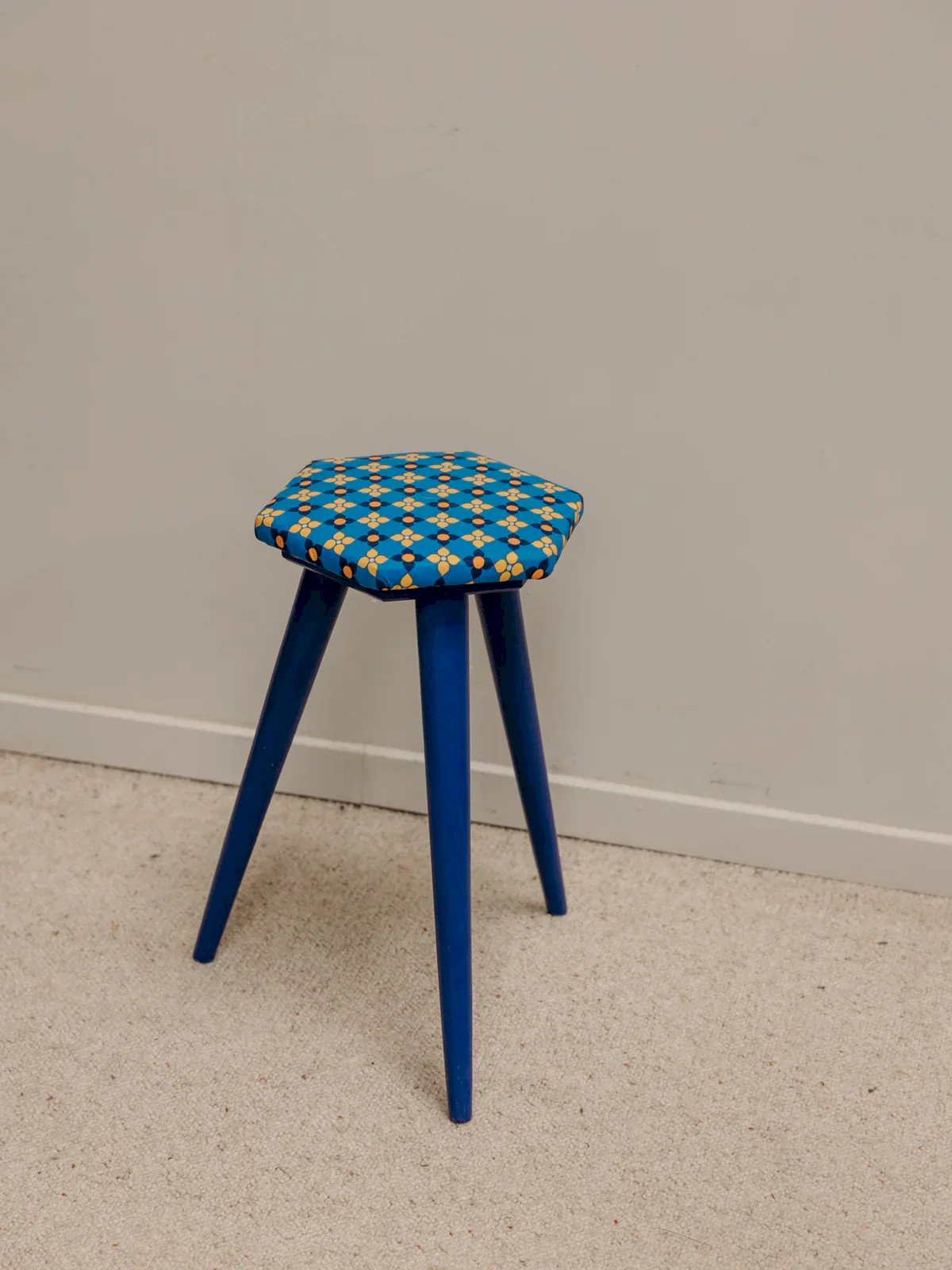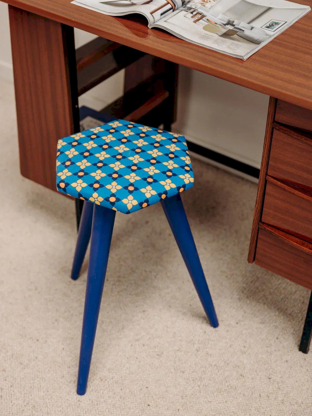 Embrace the refined look of the Klein blue stool, mounted on wooden splayed legs that give it a balanced and light silhouette. The seat, covered in a patterned fabric with accents of yellow, orange, and blue, adds a graphic and warm touch, subtly retro. With its compact size, it is suited for an entryway corner or a creative workshop, offering comfortable seating and harmonious proportions. A blend of natural materials and vibrant colors, it easily integrates into contemporary interiors as well as vintage atmospheres. Length: 27 cm Width: 31 cm Height: 52 cm Condition: Used: Item that has been used. Item showing some superficial wear marks...Used: Item that has been used. Item showing some superficial wear marks, fully functional and working correctly. It may be a demonstration model or an item returned to the store after a short period of use. possible imperfections. Color: Multicolor Height: Contemporary Width: Fabric, Wood Length: Low stools Brand: Debongout Type: Vintage product Material: Fabric, Wood Style: Contemporary Assembly required: No Level of assembly: Fully assembled.