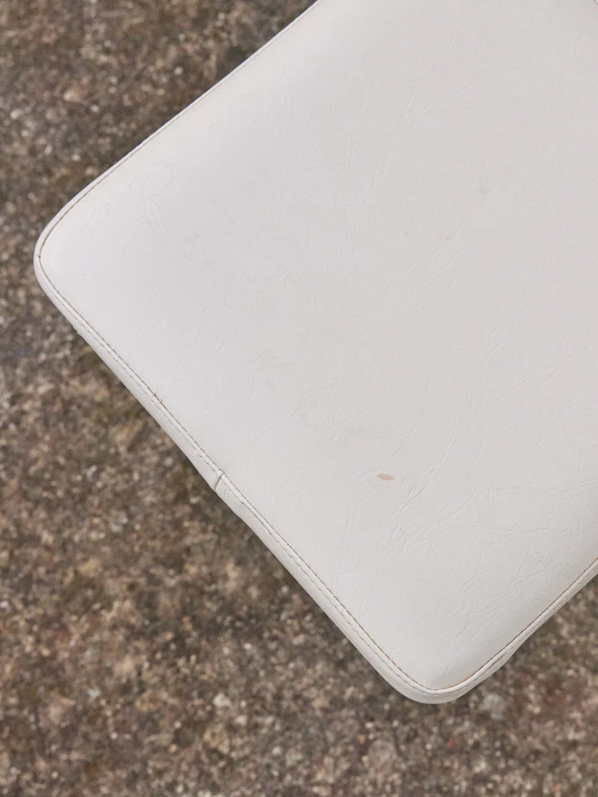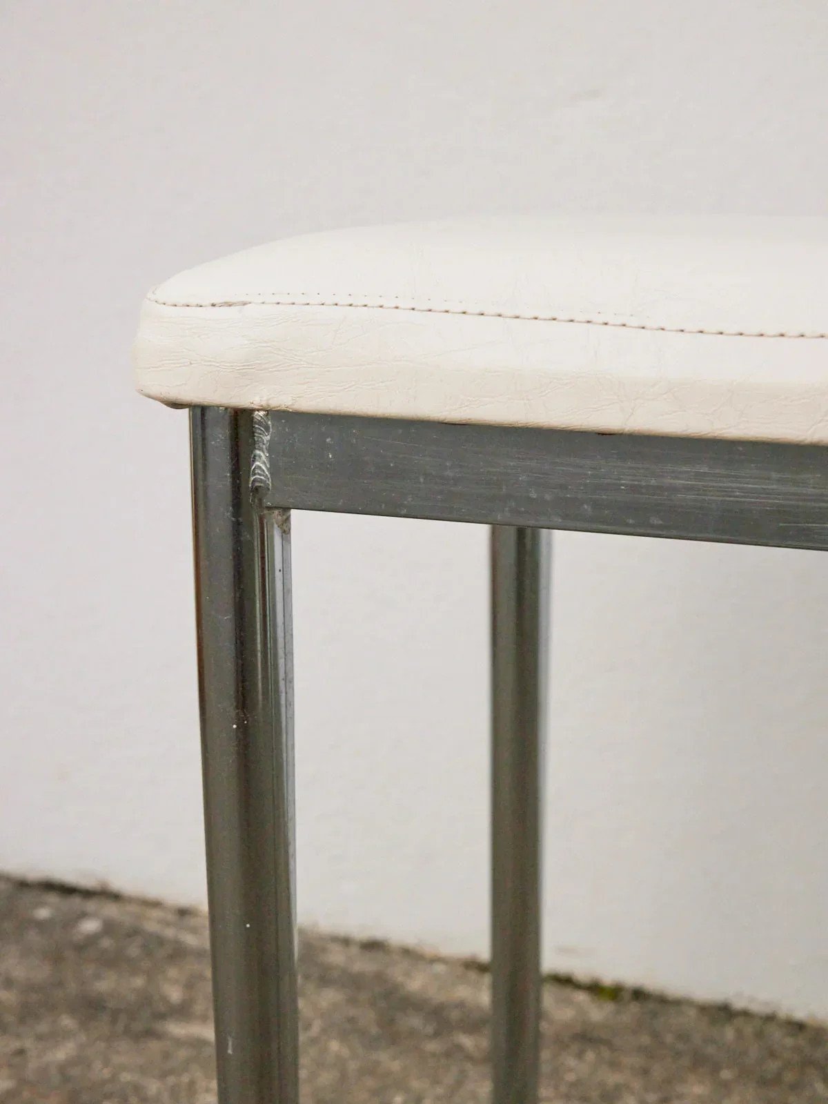 Adopt this square white leather stool with chrome legs, where the simplicity of the lines reveals a refined finish. The leather seat, bright and subtly textured, offers discreet comfort while the chrome legs bring contemporary elegance and great stability. Compact and graphically proportioned, it fits perfectly at the bar, near a vanity, or in a lounge corner to create a modern and minimalist atmosphere. Easy to maintain for daily use. Length: 30 cm Width: 30 cm Height: 46 cm Seat height: 46 cm Seat depth: 30 cm Seat width: 30 cm Condition: Used item: An item that has been used. Item showing some superficial signs of wear, fully operational and functioning correctly. It may be a demonstration model or an item returned to the store after a short period of use, including any imperfections. Color: Multicolor Height: Contemporary Width: Leather, Chrome Length: Low stools Brand: Debongout Type: Curated product Material: Leather, Chrome Style: Contemporary Assembly required: No Assembly level: Fully assembled
