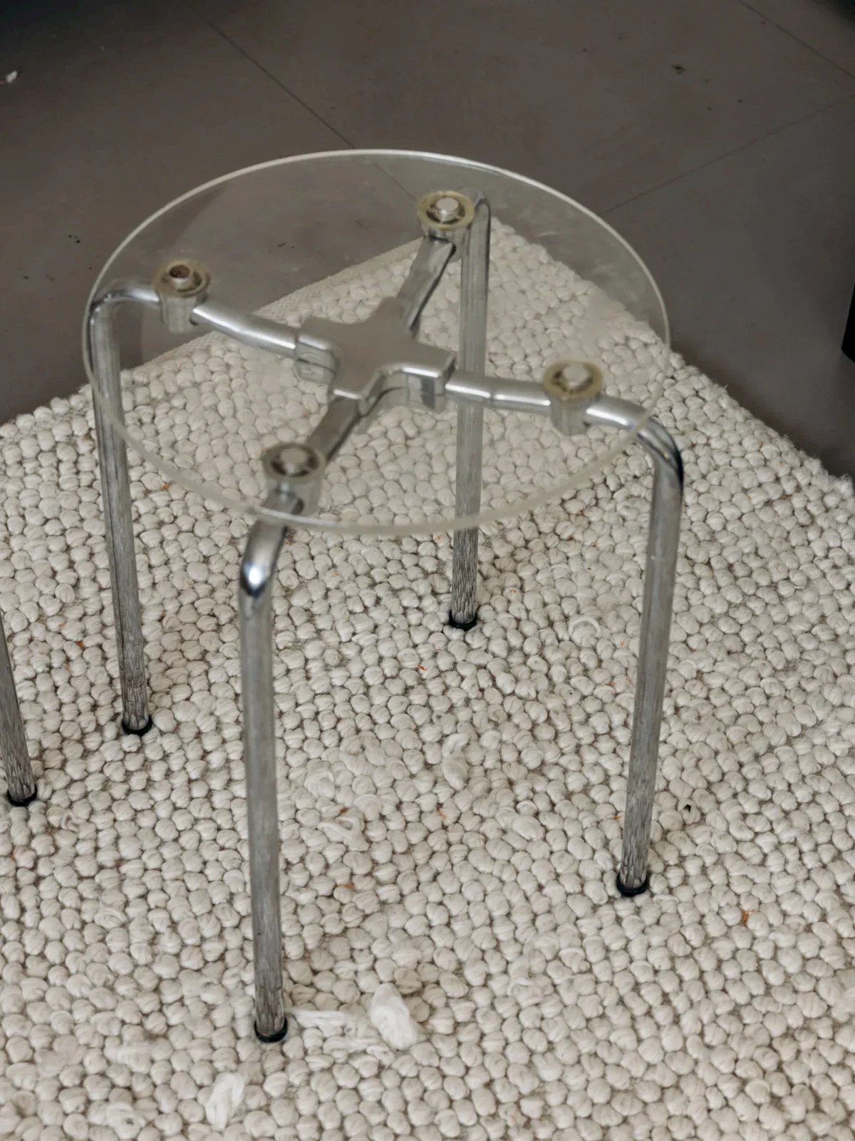Discover our modern stool, featuring a sturdy tubular metal frame and an elegant transparent plexiglass seat. This streamlined furniture blends harmoniously into any interior, adding a contemporary touch to your decor. Perfect for a coffee corner or a workspace, it offers optimal comfort while remaining lightweight and easy to move. Add a stylish and functional note to your home with this timeless stool. Sold individually, two quantities are available! Height: 47 cm Seat diameter: 34 cm Condition: Used item: An item that has been used. Item showing some signs of superficial wear... Used item: An item that has been used. Item showing some signs of superficial wear, fully operational and functioning correctly. It may be a display model or an item returned to the store after a short period of use. Possible imperfections. Color: Multicolored Height: Contemporary Width: Metal, Plexiglass Length: Low stools Brand: Debongout Type: Vintage product Material: Metal, Plexiglass Style: Contemporary Assembly required: No Assembly level: Fully assembled.