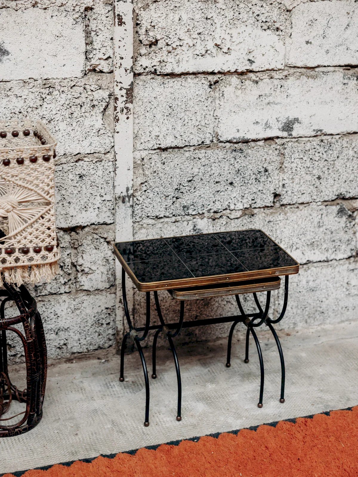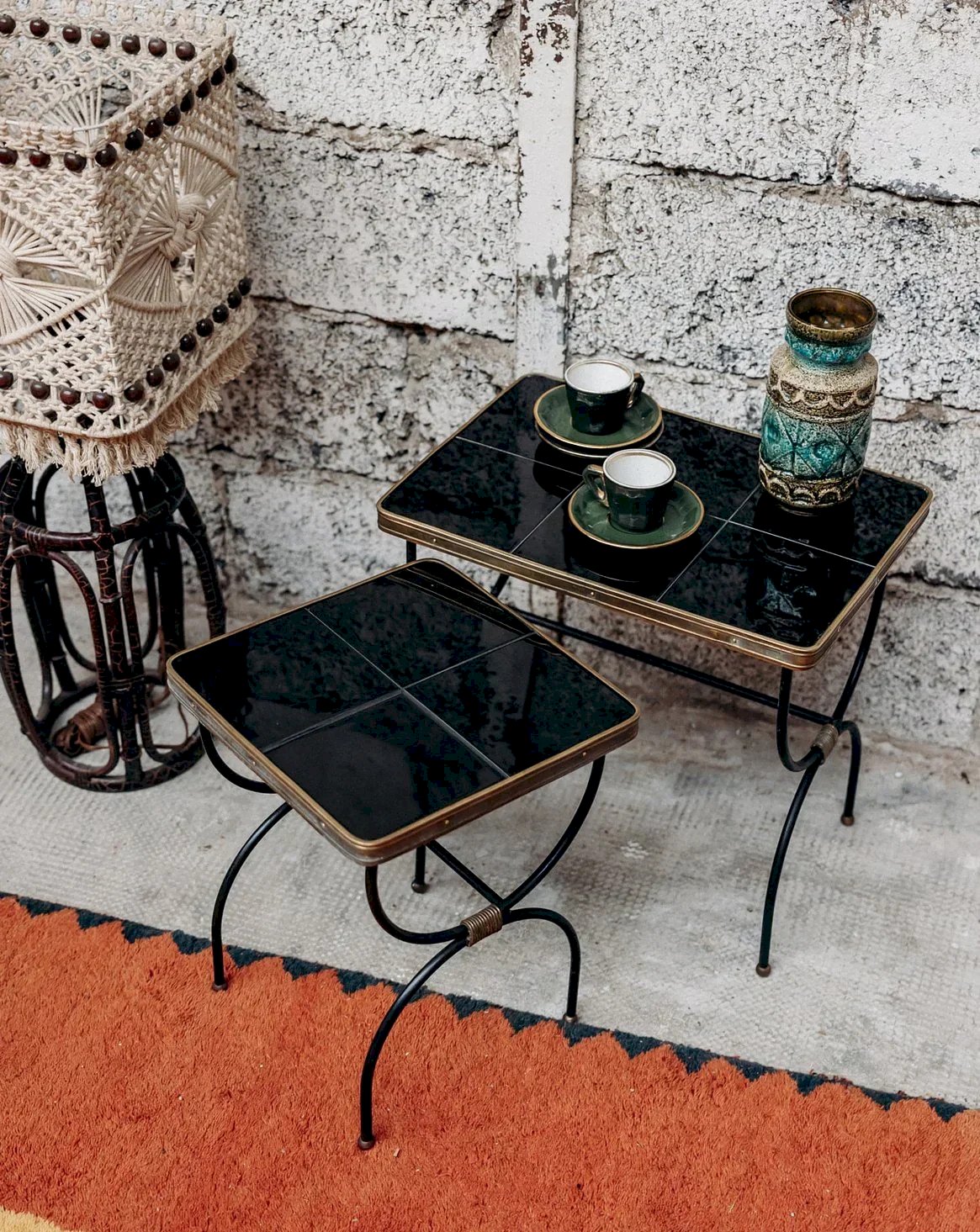 Discover this pair of nesting tables designed by Jacques Adnet, combining elegance and functionality. Their tops adorned with black ceramic tiles bring a graphic and sophisticated touch. The metal legs provide a fine and sturdy structure, typical of the modernist style. Ideal for adapting the space according to your needs while adding character to your interior. A rare and iconic piece of French design. Dimensions of the small table: Length: 31 cm Width: 31 cm Height: 40 cm Dimensions of the large table: Length: 46 cm Width: 31 cm Height: 45 cm Condition: Used: Item has been used. Item shows some signs of superficial wear, fully operational and functioning correctly. It may be a demonstration model or a returned item after a short period of use, with possible imperfections. Brand: Debongout Type: Vintage product Material: Ceramic, Metal Style: Contemporary Customizable: Nesting tables.