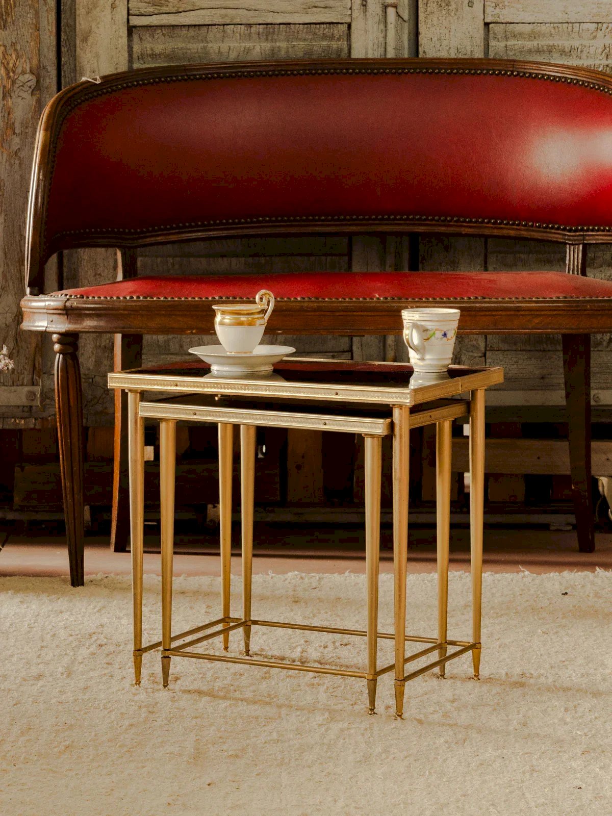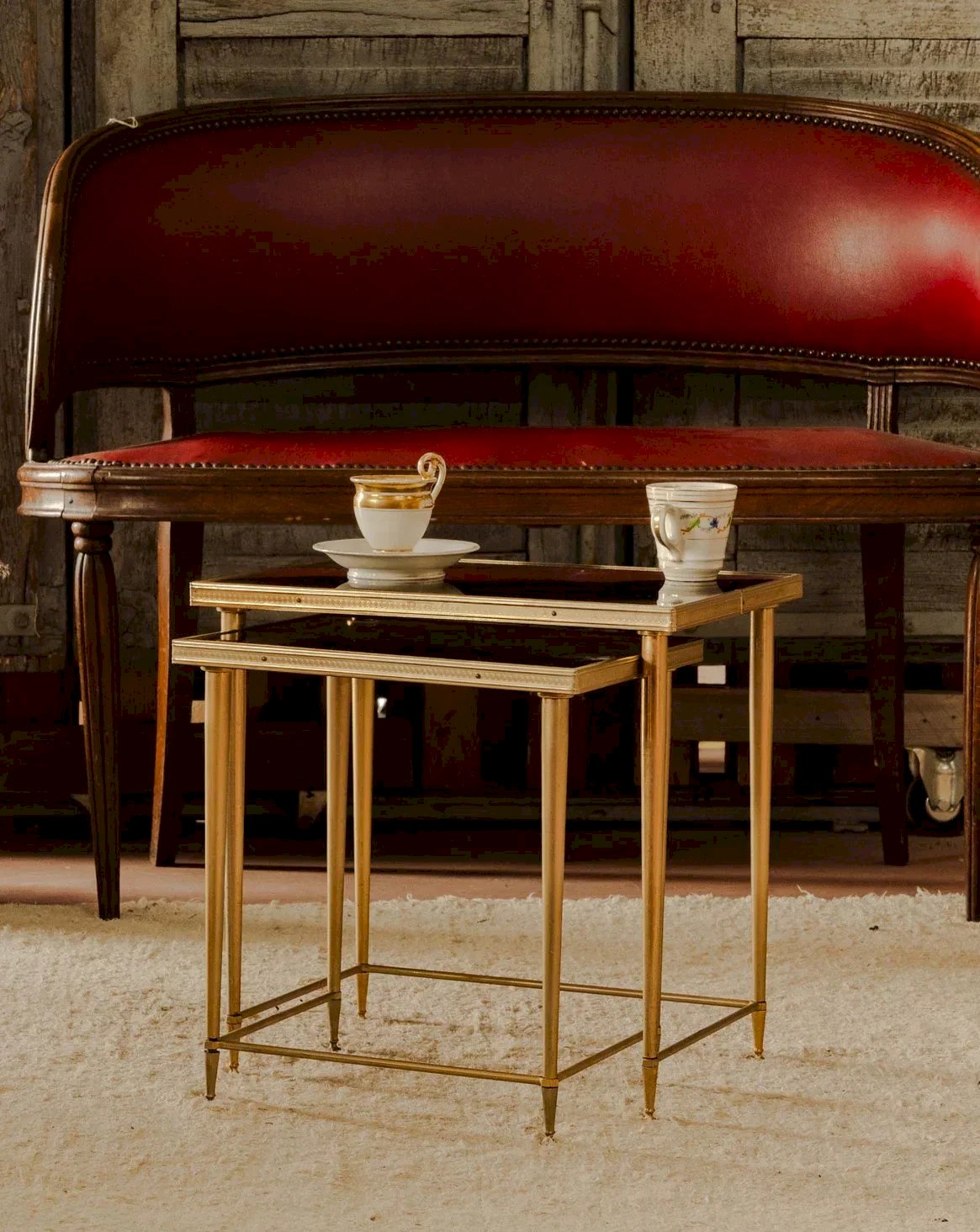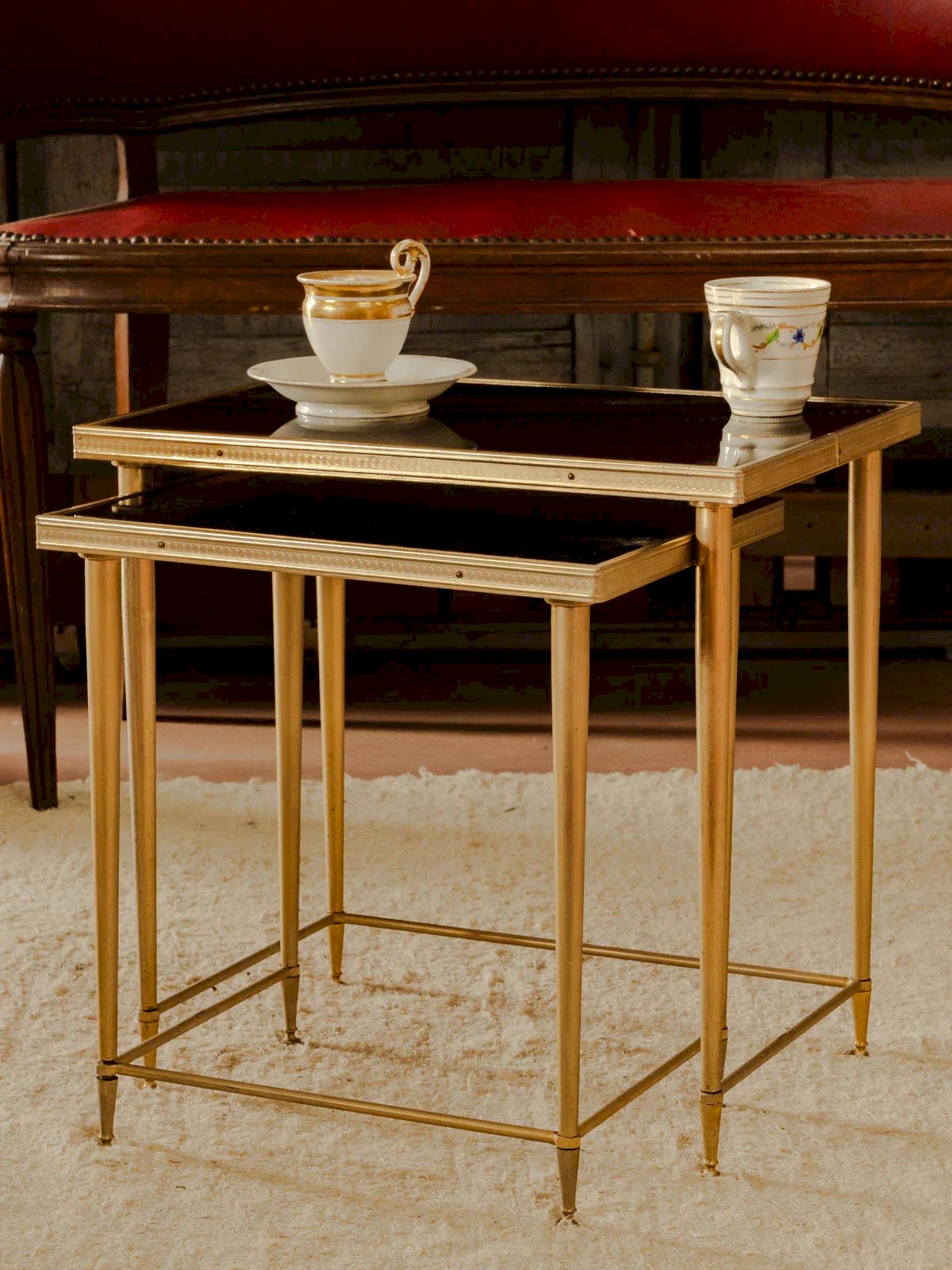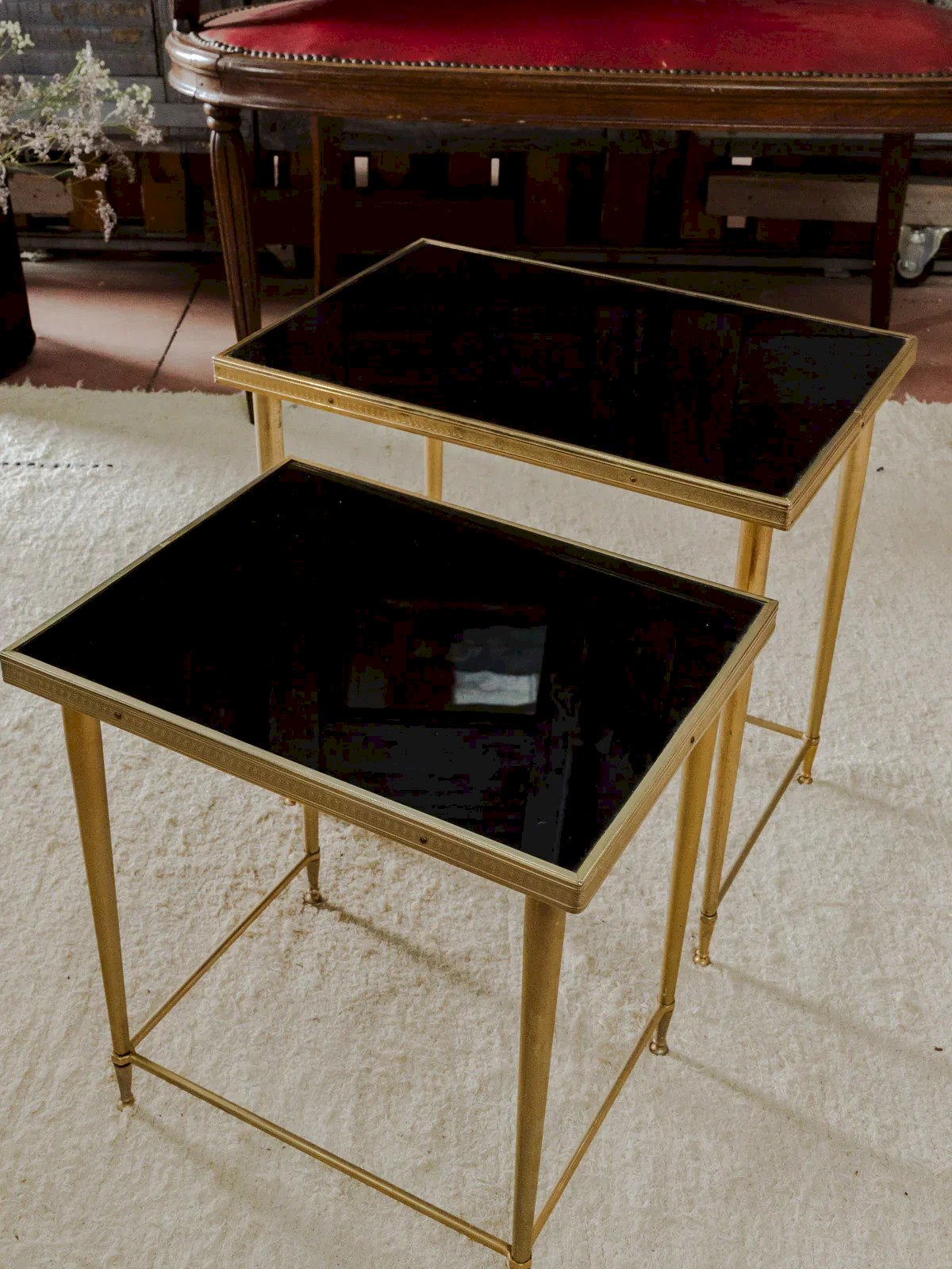 Add a touch of elegance to your interior with this set of 2 nesting tables in a vintage design. The brass legs and structure add a note of sophistication, while the black resin top brings a subtle modernity. Practical and aesthetic, these tables fit into any space, offering both style and functionality. A perfect choice for creating a chic and friendly lounge area. Length: 34/42 cm Width: 27/29 cm Height: 38/41 cm Condition: Used: Item has been used. Item shows some signs of superficial wear... Used: Item has been used. Item shows some signs of superficial wear, fully operational and functioning properly. It could be a demonstration model or an item returned to the store after a short period of use, including any imperfections. Brand: Debongout Type: Thrifted Product Material: Brass, Plastic Style: Contemporary Custom: Nesting tables