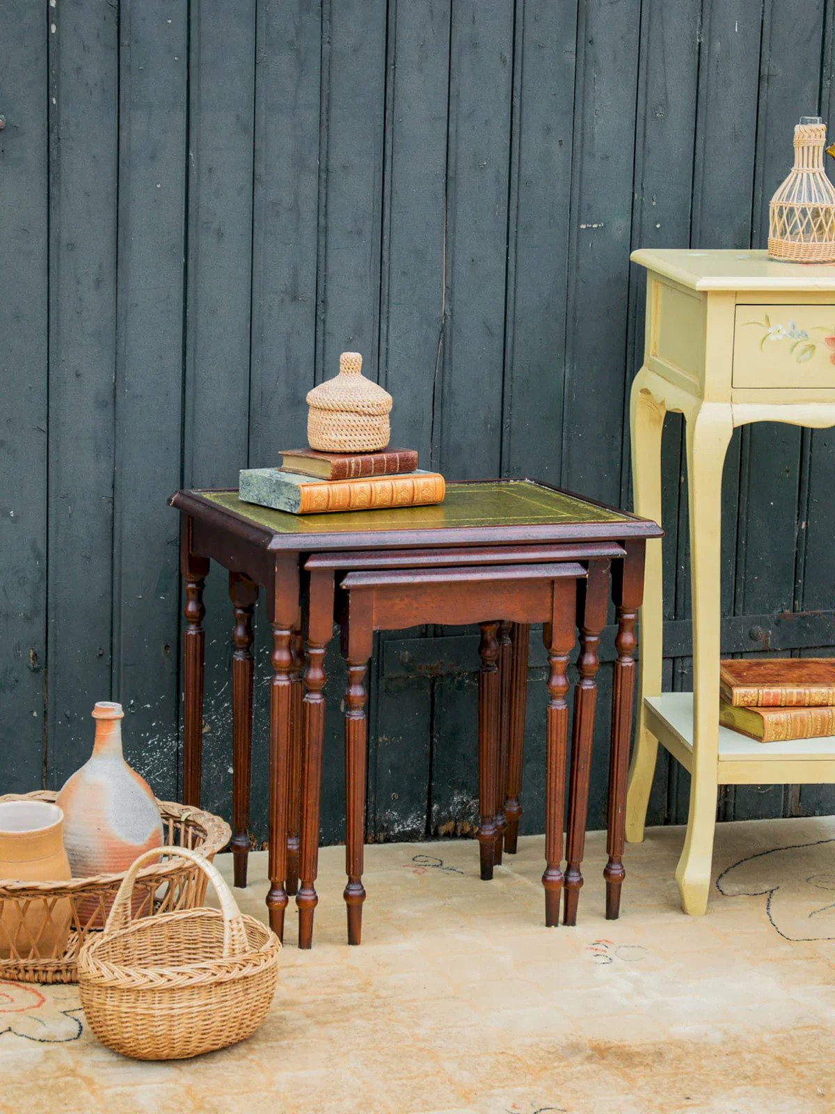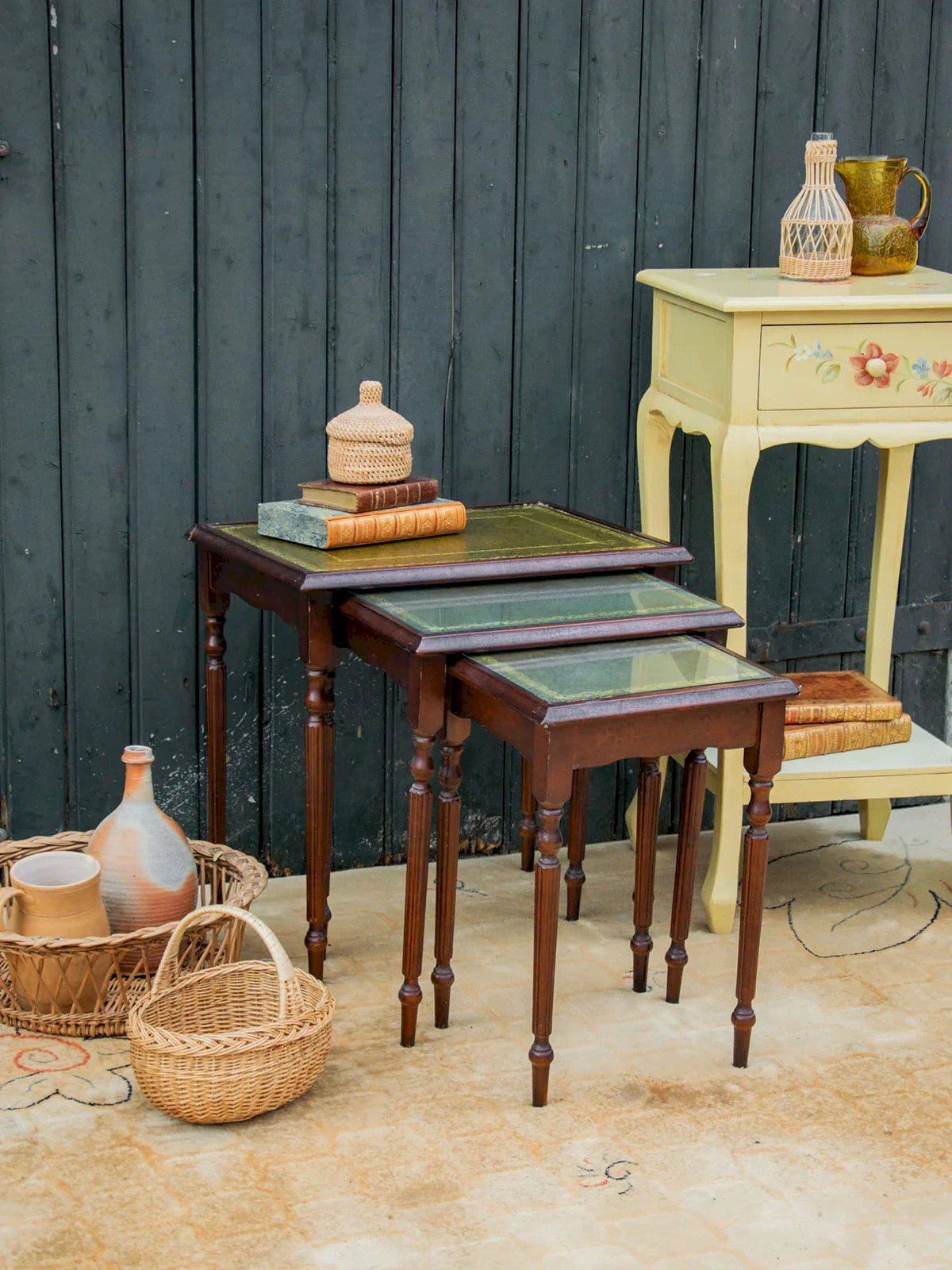 Discover this set of three nesting tables made of wood with classic charm. Each square table features a faux leather top, decorated with an elegant golden pattern. The legs are delicately crafted, adding depth to the overall design. The glass top of the largest table is missing, but this does not detract from its decorative potential. Ideal for stylishly and functionally managing space. Dimensions of the small table: Length: 33 cm Width: 29 cm Height: 45 cm Dimensions of the medium table: Length: 42 cm Width: 34 cm Height: 49 cm Dimensions of the large table: Length: 52 cm Width: 40 cm Height: 50 cm Condition: Used: Item has been used. Item shows some signs of superficial wear... Used: Item has been used. Item shows some signs of superficial wear, fully operational and functioning correctly. It may be a display model or an item returned to the store after a short period of use. Any possible imperfections. Brand: Debongout Type: Vintage product Material: Wood, Faux leather, Glass Style: Contemporary Customized: Nesting tables.