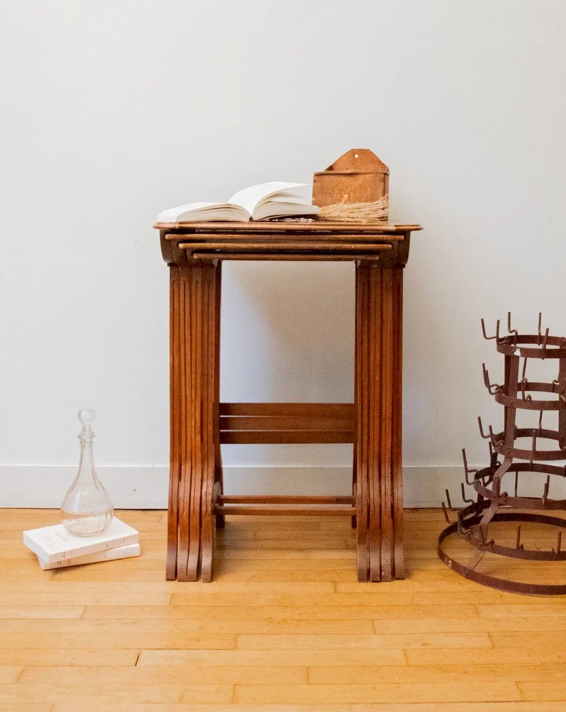 Discover this set of 4 high nesting tables made of dark wood, resting on thick legs that anchor the furniture with a sculptural presence in a living room or bedroom. The tiered tops — one large, one medium, and one small — provide practical surfaces for lamps, cups, or plants, while creating a warm and balanced display. The wood grain emphasizes a simple and timeless style. Some signs of wear add to their authenticity. Size XL: Length: 54.5 cm Width: 39 cm Height: 73 cm Size L: Length: 47 cm Width: 35 cm Height: 70 cm Size M: Length: 41 cm Width: 35 cm Height: 69 cm Size S: Length: 36 cm Width: 34 cm Height: 67 cm Condition: Used: Item has been used. Item shows some superficial signs of wear, fully operational and functioning correctly. It may be a demonstration model or a returned item after a short period of use. Possible imperfections. Brand: Debongout Type: Vintage product Material: Wood Style: Contemporary Customized: Nesting tables