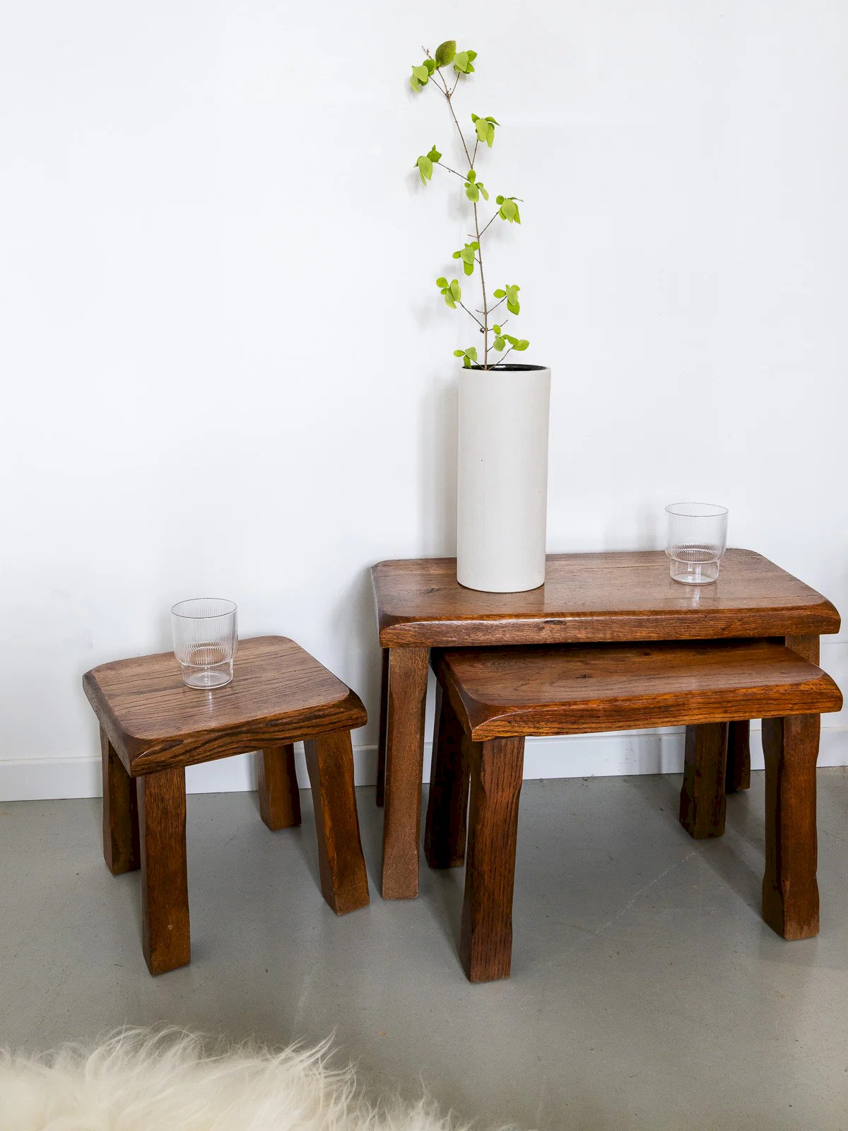 Discover this elegant set of three nesting tables made of solid wood, a true testament to 20th-century design. Their sturdy structure and clean lines bring a timeless vintage touch to your interior. These tables, with their warm patina, adapt to all your needs, whether as accent tables or decorative stands. In generally good condition, they do show some previous signs of use on the surface, adding to the charm of this authentic set. Length: 30/45/60 cm Width: 30 cm Height: 30/35/40 cm Condition: Used: Item has been used. Item shows some minor signs of superficial wear, fully operational and functioning properly. It may be a demonstration model or an item returned to the store after a short period of use. Any imperfections are possible. Brand: Debongout Type: Thrifted Product Material: Wood Style: Contemporary Custom: Nesting tables
