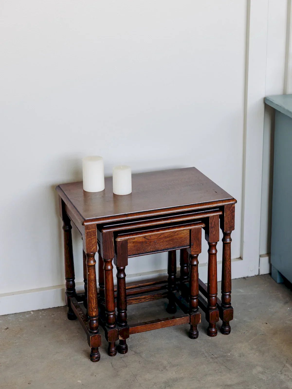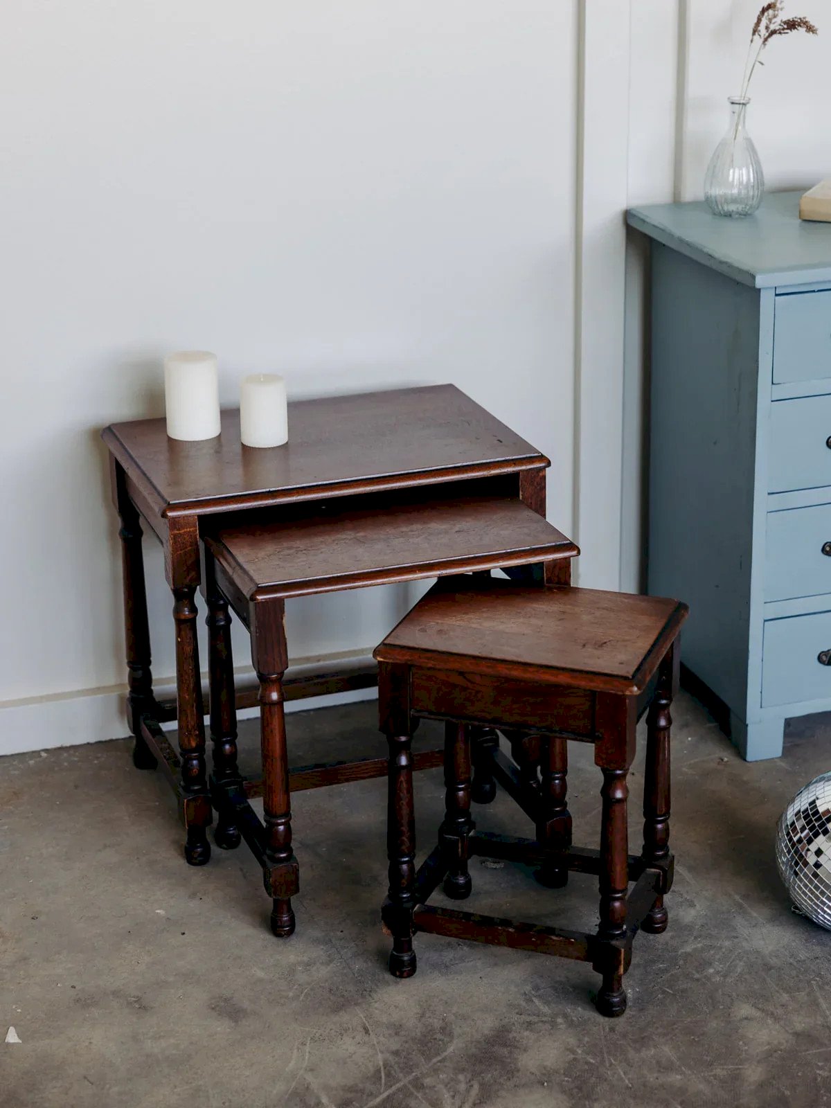Bring a rustic touch to your interior with this pair of all-wood nesting tables. Their sculpted legs and lower bars give them a charming country style full of authenticity. Sturdy and practical, they nest together to save space or unfold according to your needs. Their natural patina emphasizes their vintage character. Perfect as end tables or warm accent tables. Dimensions of the small table: Length: 30 cm Depth: 24 cm Height: 42 cm Dimensions of the medium table: Length: 40 cm Depth: 29 cm Height: 45 cm Dimensions of the large table: Length: 51 cm Height: 49 cm Depth: 34 cm Condition: Used: Item has been used. Item shows some superficial signs of wear...Used: Item has been used. Item shows some superficial signs of wear, fully operational and functioning correctly. It may be a demonstration model or a returned item after a short period of use. Any imperfections. Brand: Debongout Type: Vintage product Material: Wood Customizable: Nesting tables Style: Contemporary