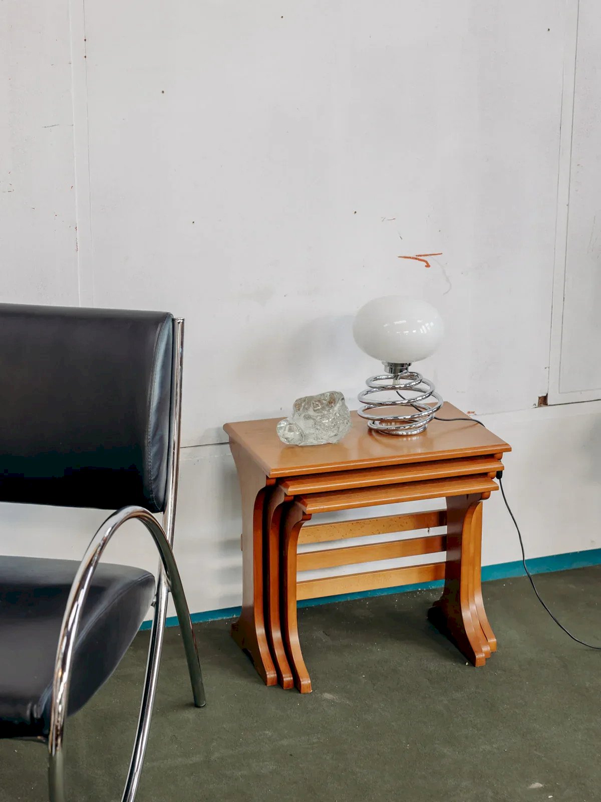 Discover our elegant wooden nesting tables, combining functionality and aesthetics. Their curved structure and beautiful legs add a touch of sophistication to your interior, while the bars at the back enhance their stability. Practical and modular, these tables fit perfectly into any space, facilitating the optimization of your layout. An ideal choice to combine style and versatility! Size L: Length: 48 cm Width: 30 cm Height: 45 cm Size M: Length: 43 cm Width: 30 cm Height: 43 cm Size S: Length: 38 cm Width: 30 cm Height: 39 cm Condition: Used: Item has been used. Item shows some superficial signs of wear, ...Used: Item has been used. Item shows some superficial signs of wear, fully operational and functioning correctly. It may be a display model or an item returned to the store after a short period of use. any imperfections. Brand: Debongout Type: Vintage product Material: Wood Style: Contemporary Custom: Nesting tables