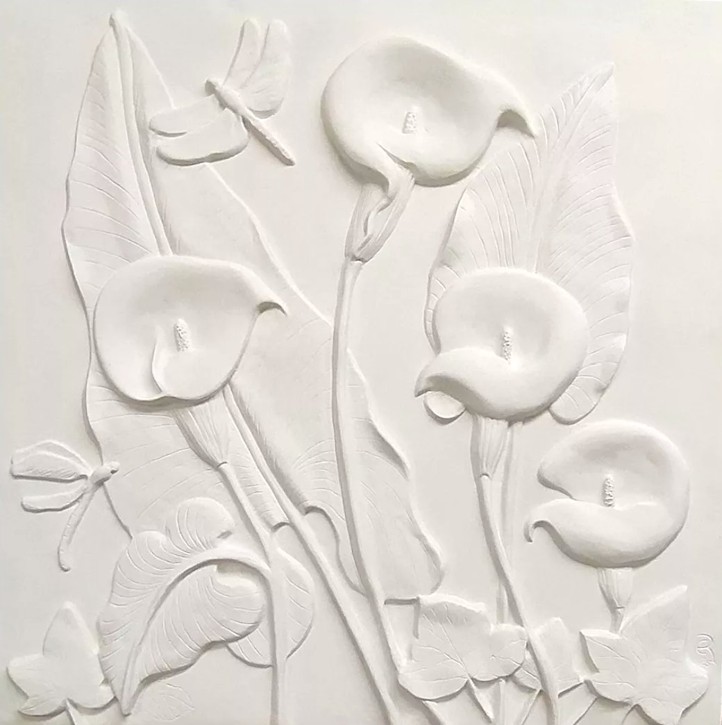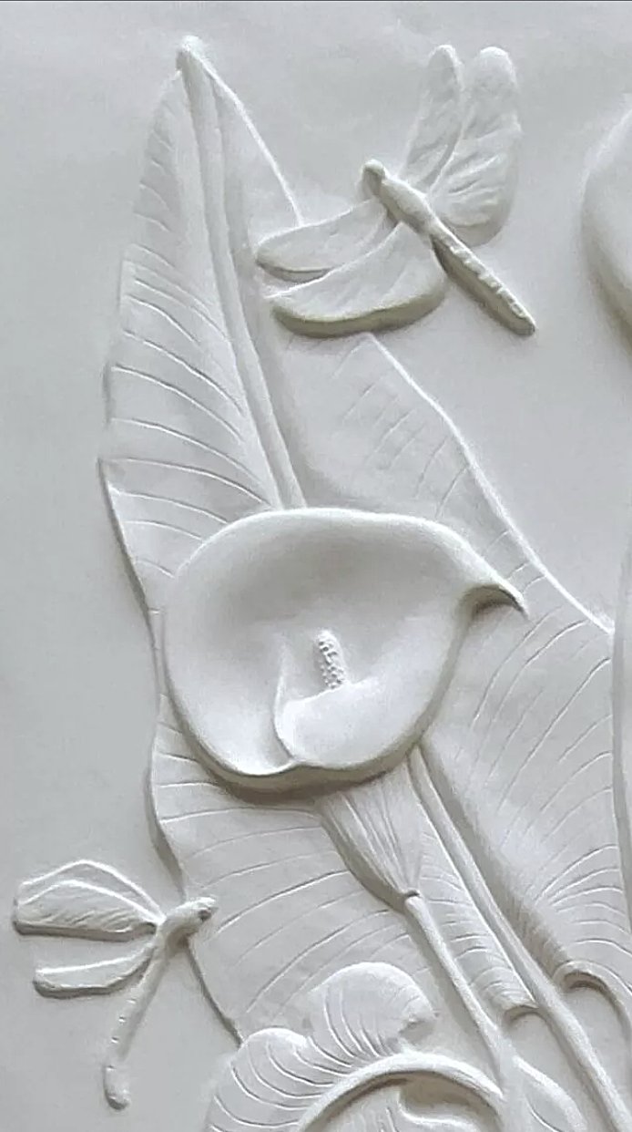 Limited series 1/5. Theme: Callas & dragonflies. Highly durable white plaster that can be directly glued to a wall or hung.