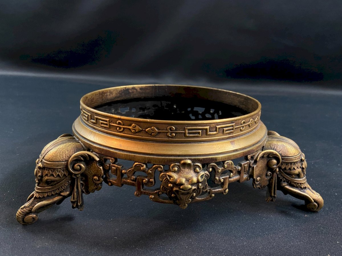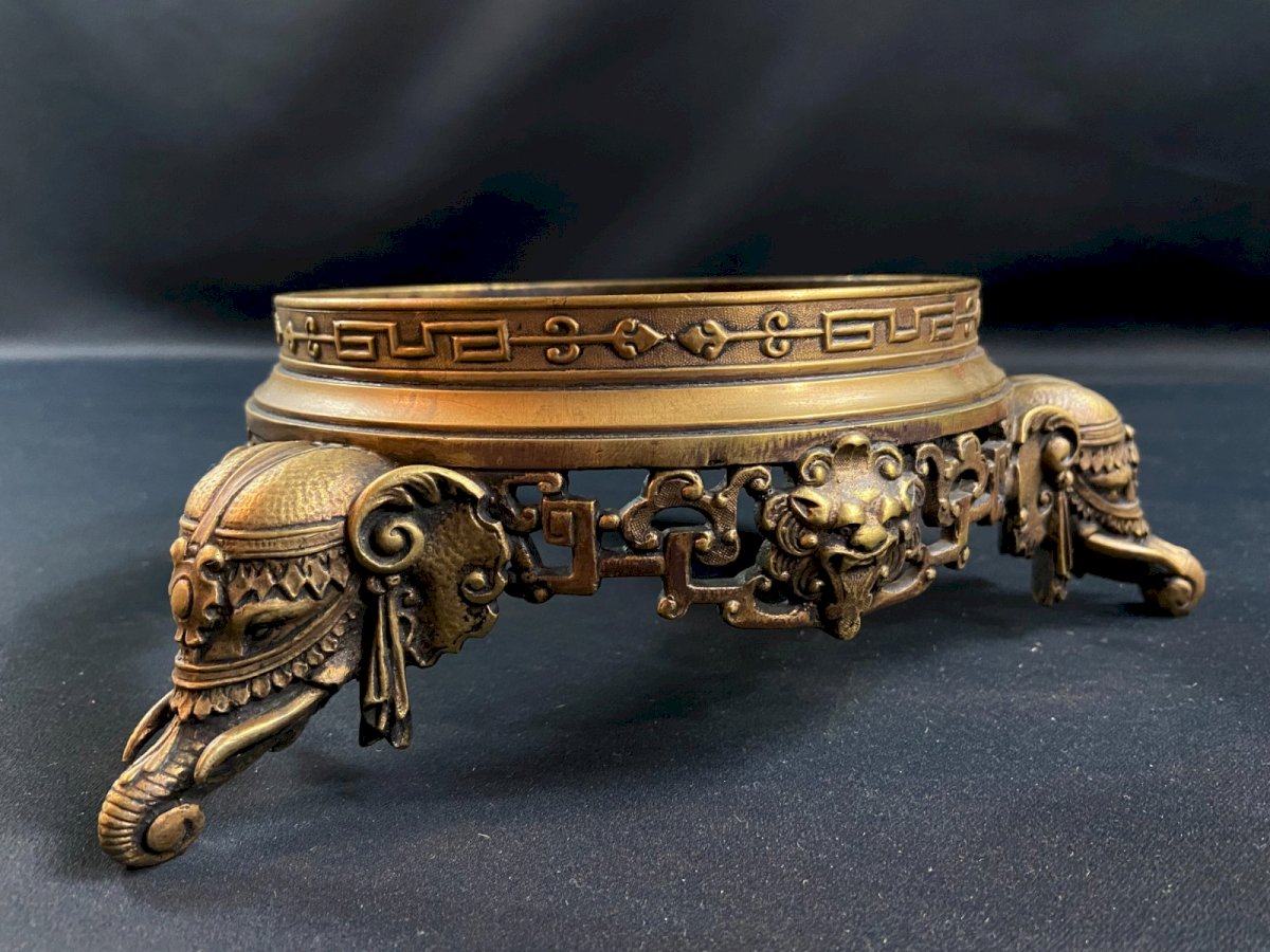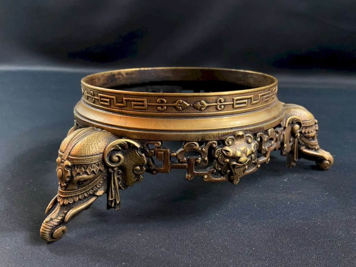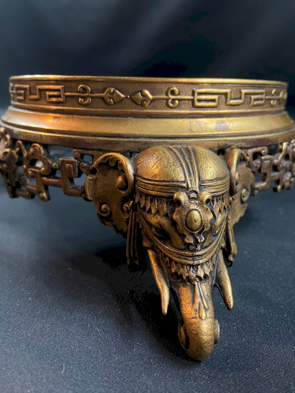 Base, vase holder, tripod jar in bronze from the 19th century with a decor of stylized elephants from the Far East. Very good condition. Undeniable elegance. Max dimensions: Wingspan 24.8 x External diameter 16.5 x Available internal diameter 16.2 x Height 8.3 cm. Very nice material density. Weight: 1005 grams. Ultra-secure shipping worldwide - Order pickup available by appointment at 7 rue Notre-Dame 18000 Bourges. - Possibility of grouping within the same package: please contact me beforehand so I can calculate your optimized shipping costs. Authenticity: Original. Type: Vase. Origin: China. Period: 19th century and before. Country of origin: China. Material: Bronze.
