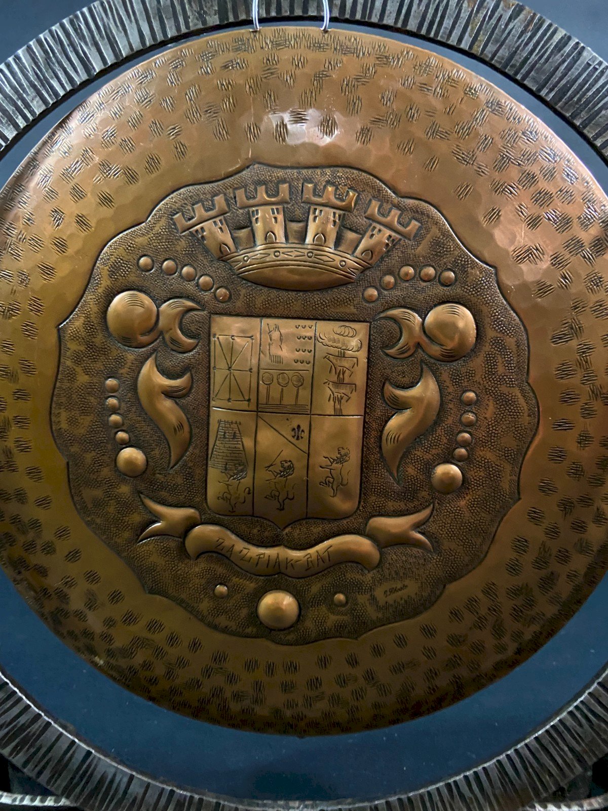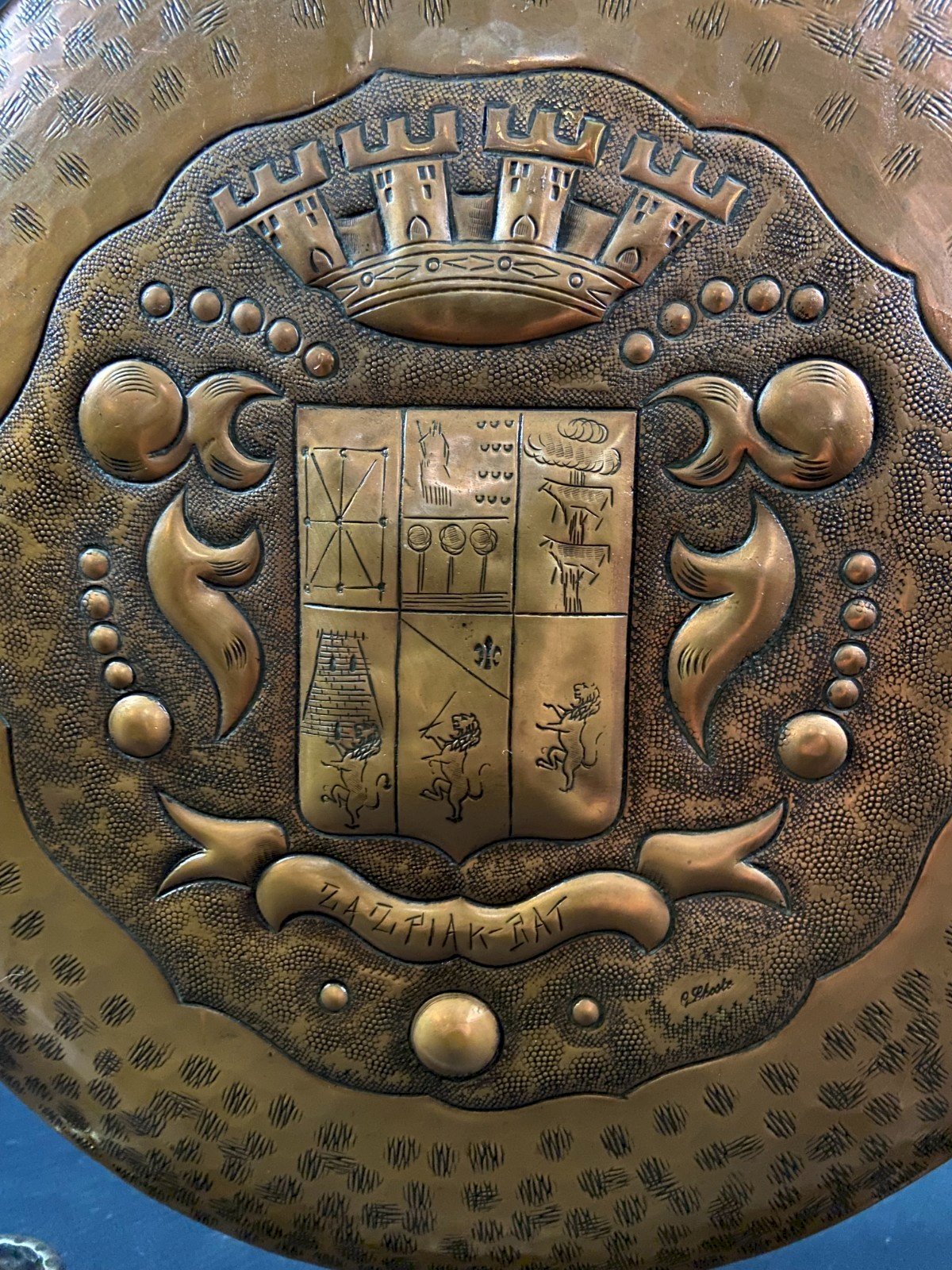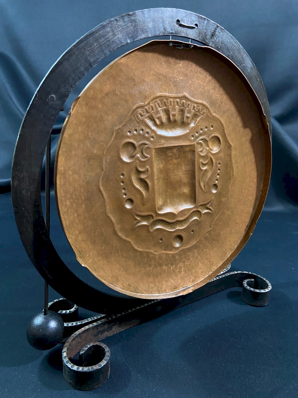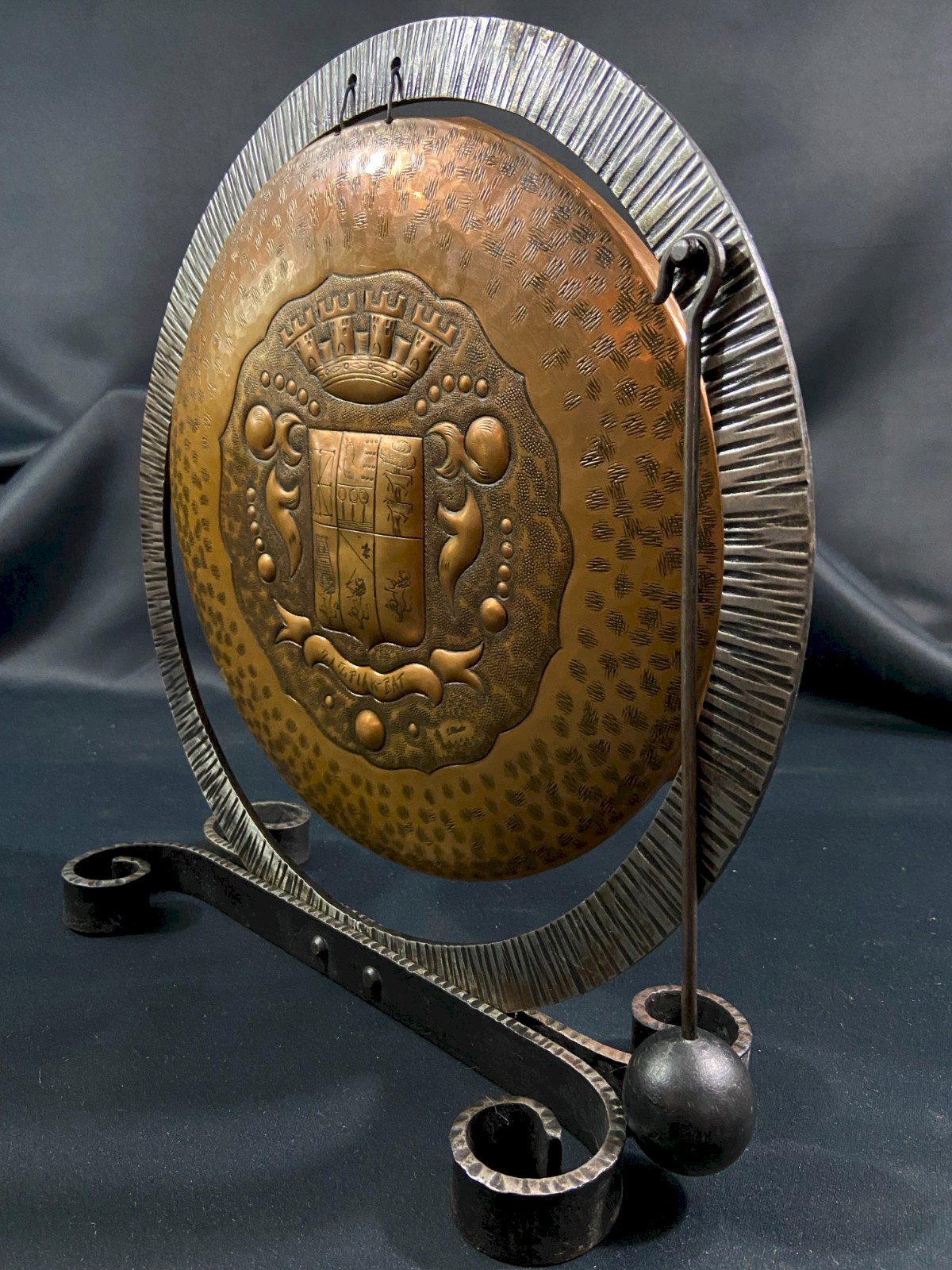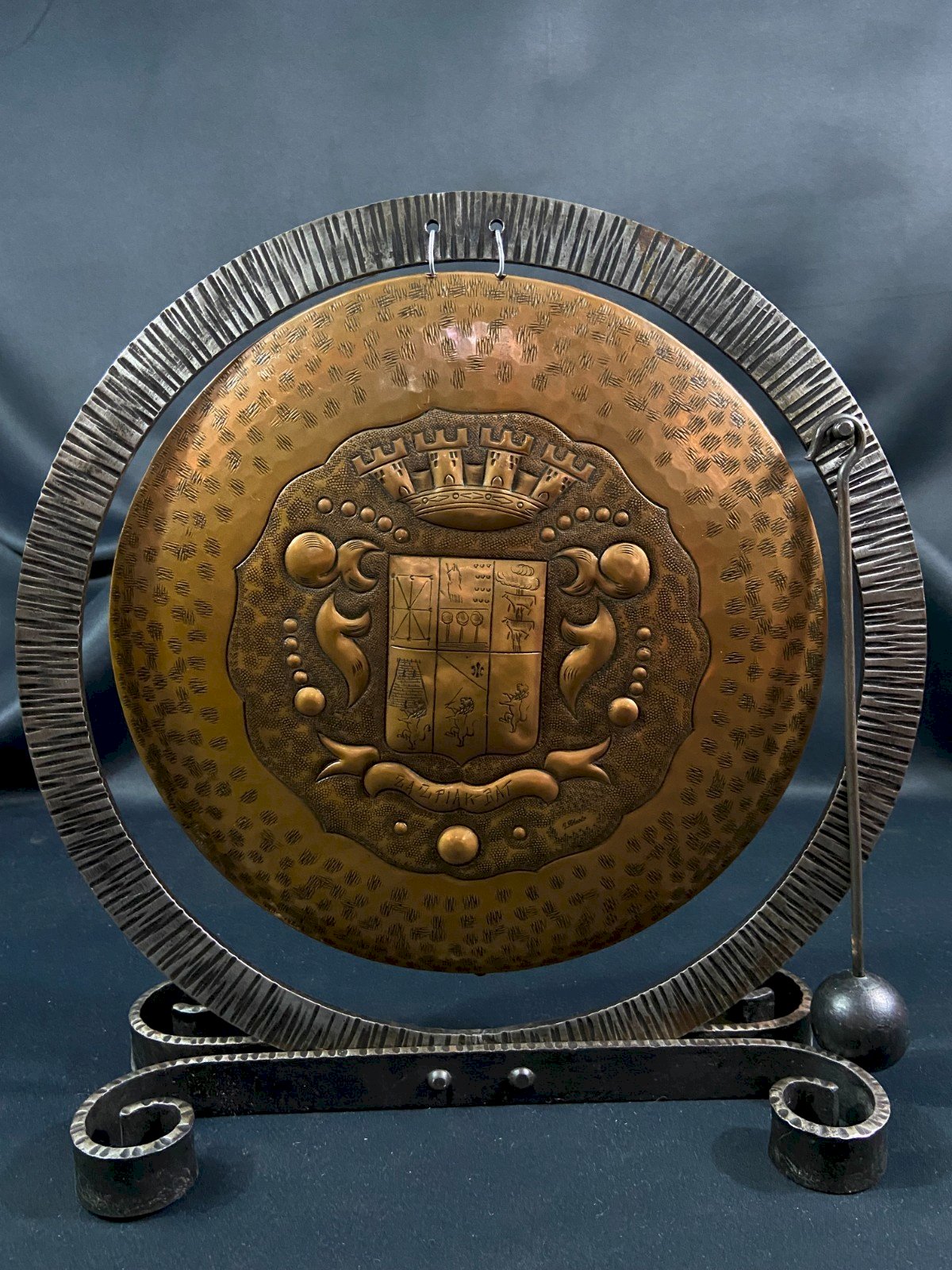 Heraldo-table gong of Basque origin in repoussé copper & wrought iron from the mid-20th century. At the center, a coat of arms representing the provinces of the Basque Country, surrounded by a decoration of hammered dots; a cartouche bearing the translated motto “The seven are but one”, symbolizing the unity of the seven Basque provinces. Maximum dimensions: Height 37.3 x 37 x 13.6 cm Weight: 2645 grams In very good condition; I would only note some small superficial oxidations at the base. Shipping VERY carefully worldwide. Authenticity: Original Type: Showcase object, Decorative Period: 20th Century Design Origin: France Subtype: Gong Country of origin: France Material: Copper Style: 1940-1960