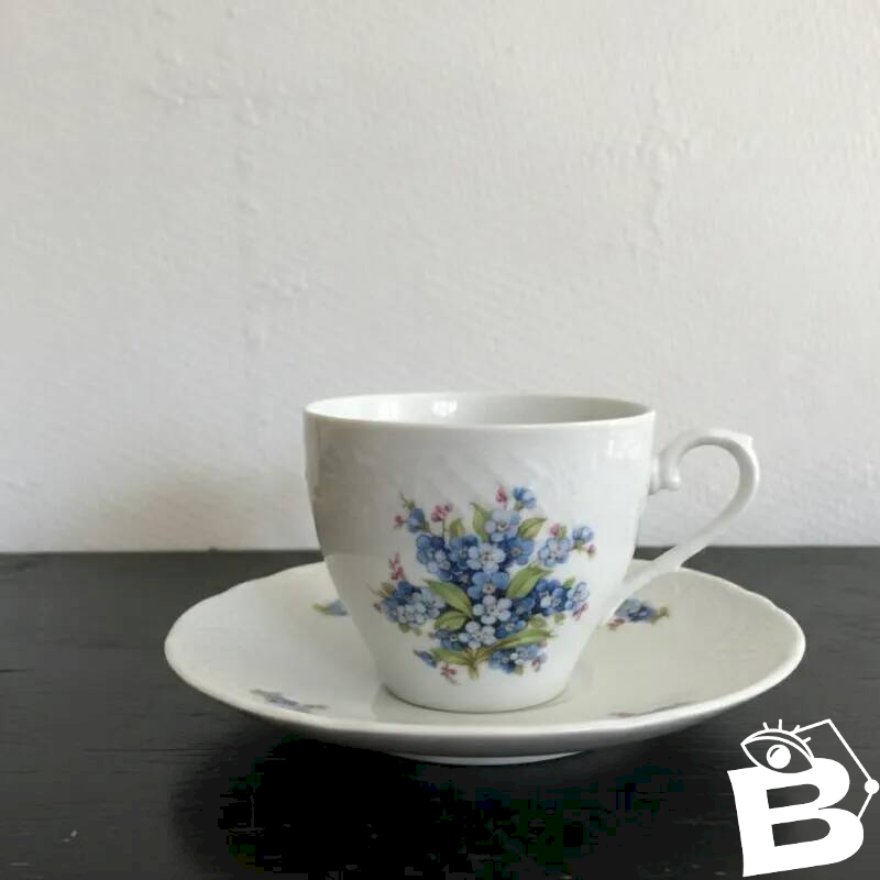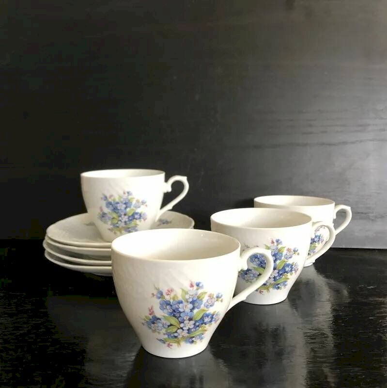 This service, composed of 4 cups and saucers, a sugar bowl, and a milk jug, stands out with its charming forget-me-not décor, where azure blue shades and hints of pink bring immediate spring freshness.