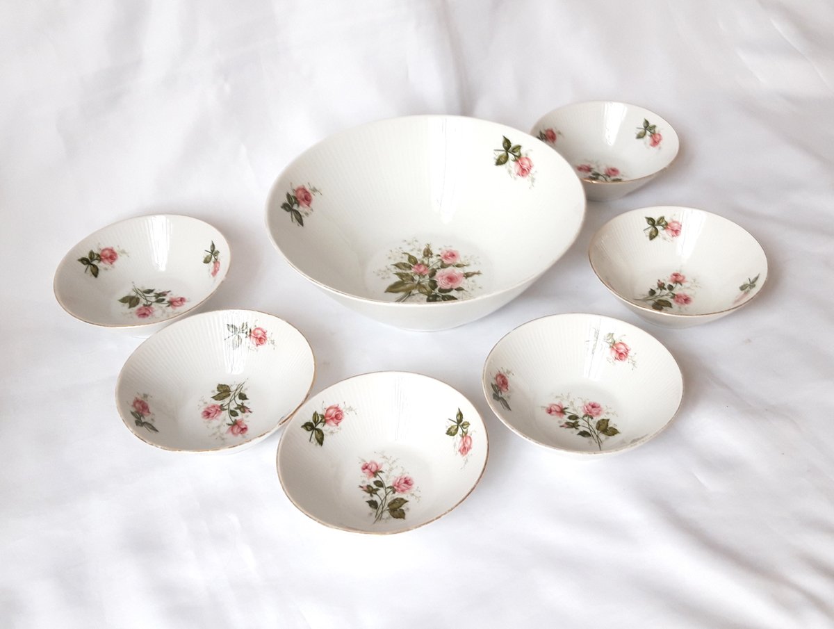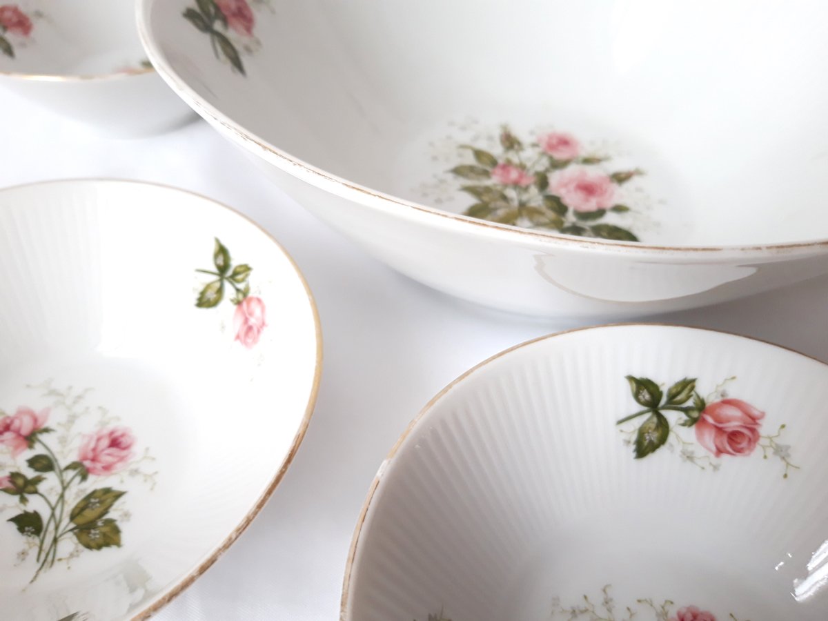 Impeccable condition, no cracks or chips. The gold edge trim is worn, mainly on the serving bowl (see last close-up photo). It is quite rare to find the complete service, without any chips!