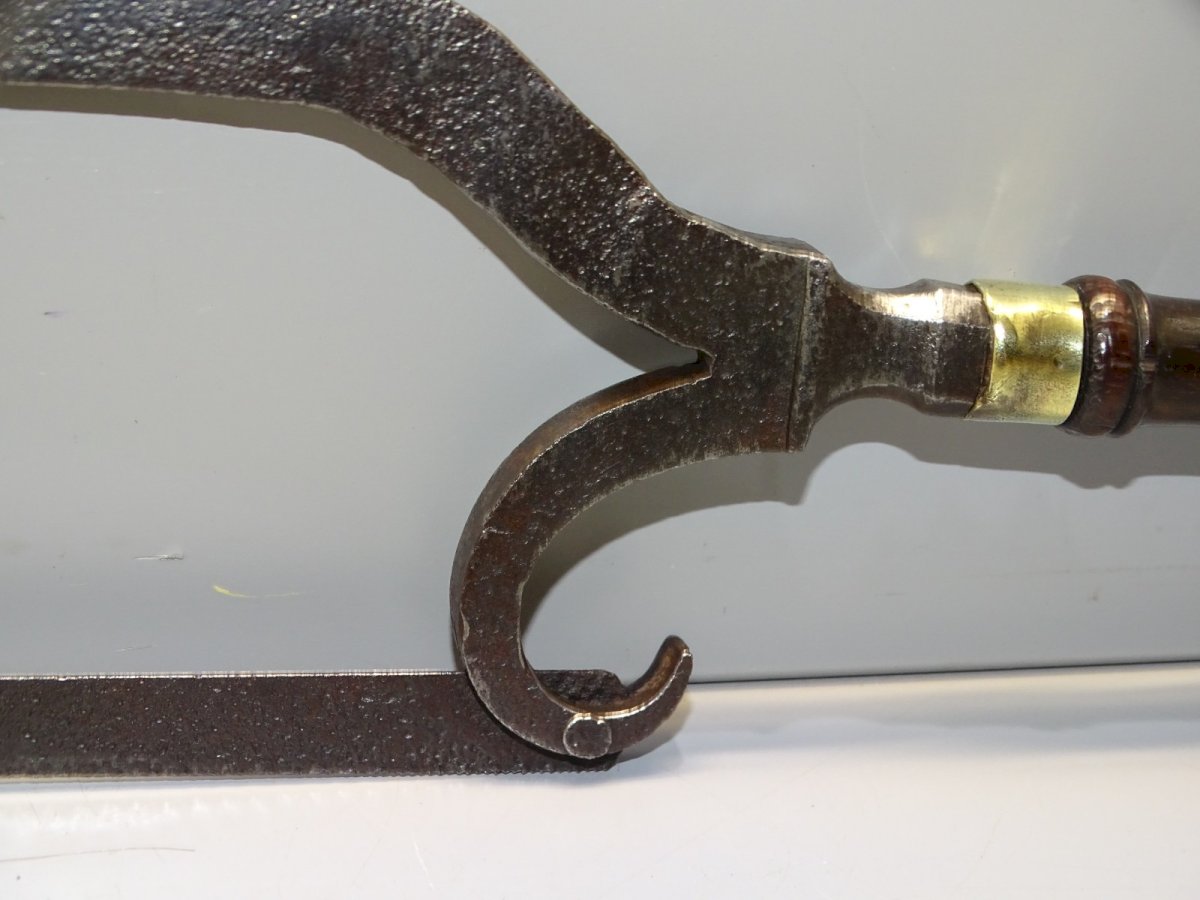 Beautiful 19th-century amputation saw, forged iron with wooden handle and brass ring - no visible brand - I haven't disassembled it because the wing nut is a bit tight and I'm afraid of breaking it by forcing - attic find - in good condition - (see photos) - Ref. 1V250707/2 - Length 37.5 cm - Width 9.2 cm - Blade length 18 cm - Weight 308 g - SHIPPING POSSIBLE VIA MONDIAL RELAY or COLISSIMO upon request, VERY GOOD PACKAGING GUARANTEED THANK YOU for carefully viewing ALL the PHOTOS as they are an INTEGRAL PART of the DESCRIPTION and ALLOW YOU TO SEE the ITEM AS BEST AS POSSIBLE with ITS POSSIBLE LITTLE DEFECTS -