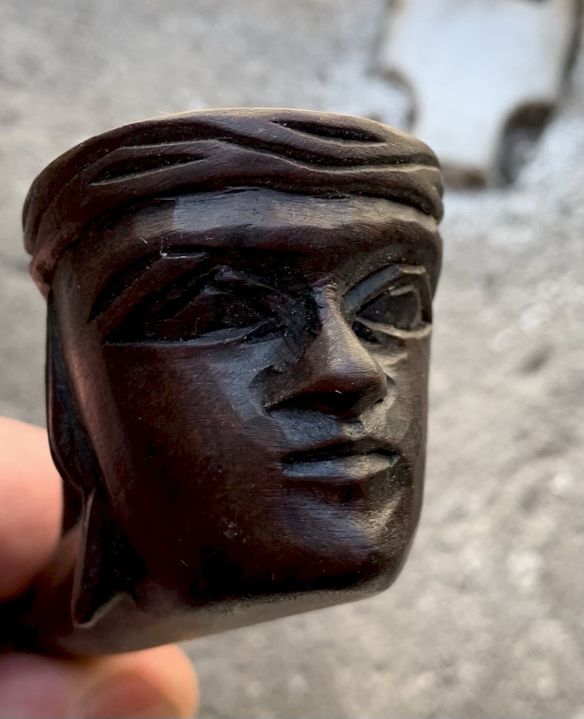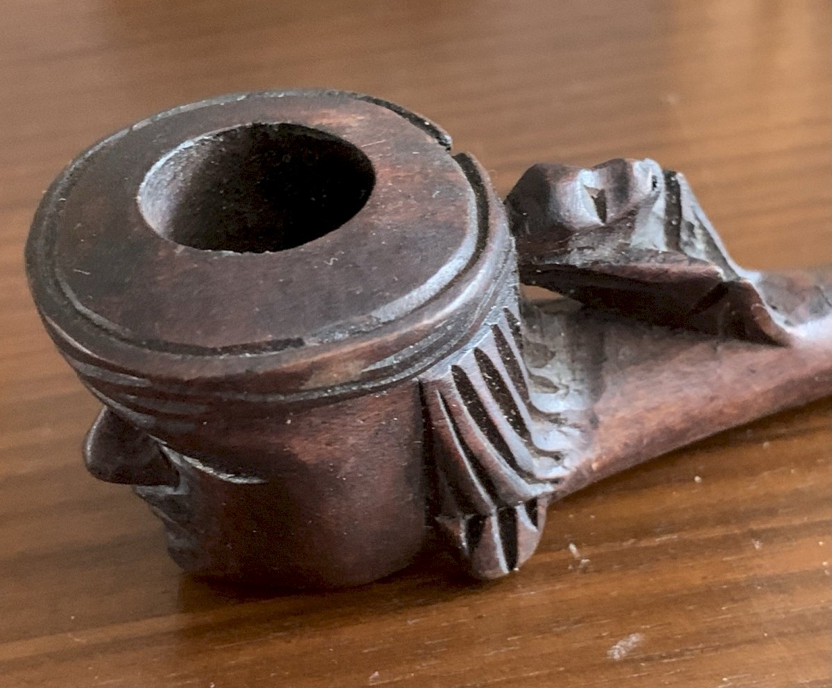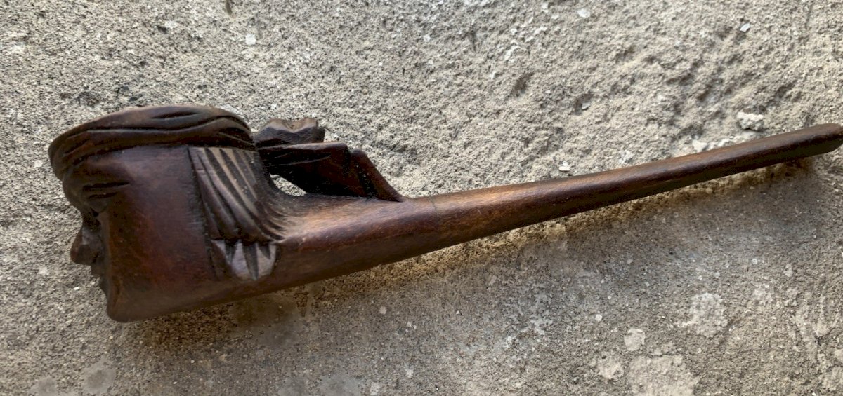 Old carved wooden pipe Represents a head of Hindu against which a monkey is leaning Good condition Length: 18cm Condition: Used Item that has been used. possible imperfections. Era: Vintage (1900-1970) Type: Pipe Material: Wood Style: Carved, Engraved