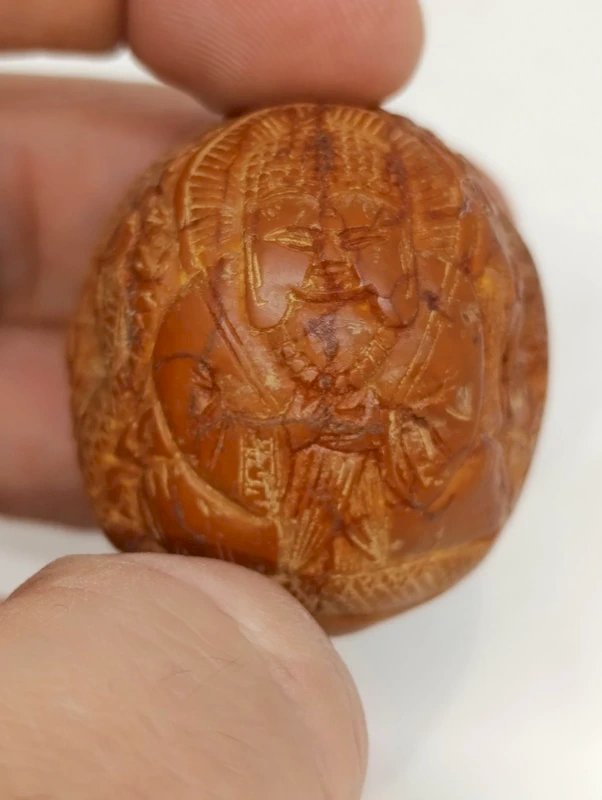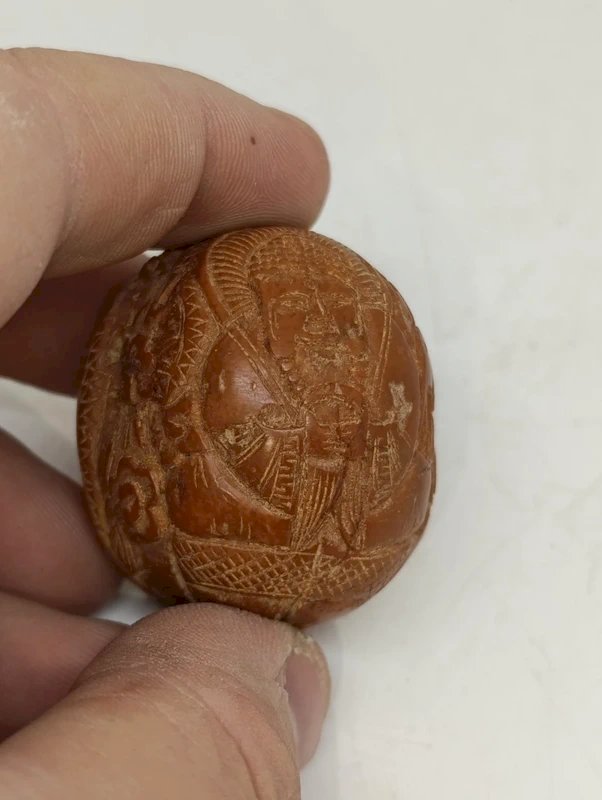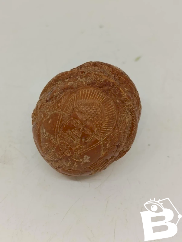 beautiful carved Asian nut decorated with a character in good condition Brown