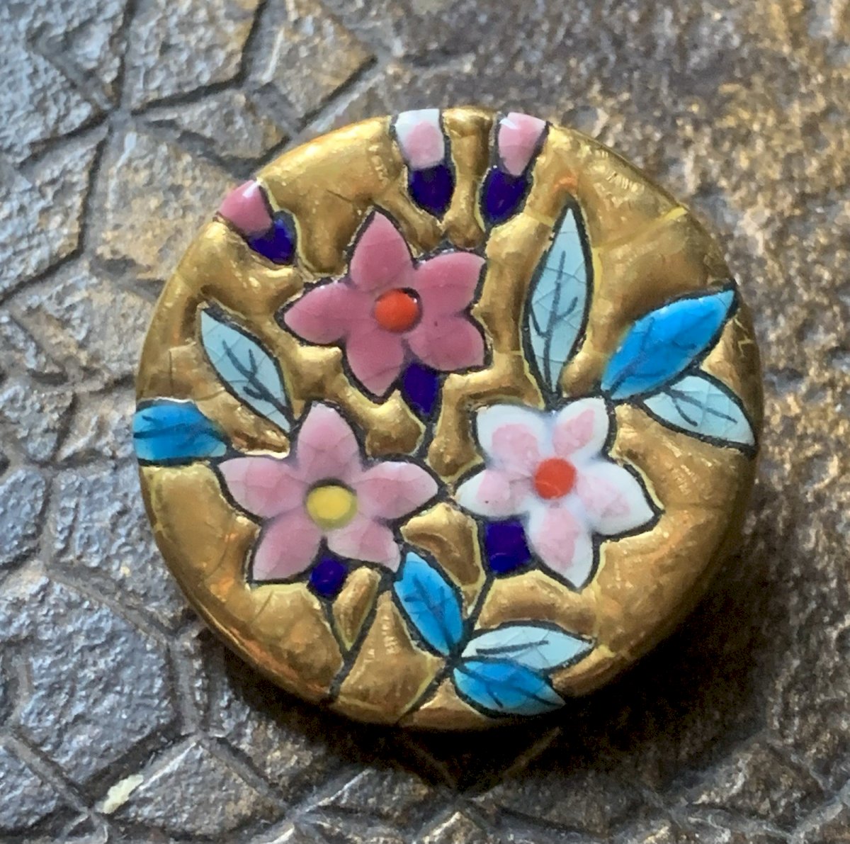 Beautiful enamel brooch from Longwy with floral design on a gold background.