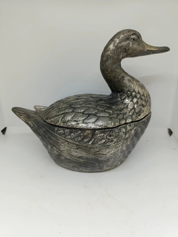 Beautiful Italian ice bucket decor duck signed Mauro Manetti in good condition. Exterior in good condition, wear and oxidation in the aluminum inner lining see photos. Signed at the tail. Beautiful rare model. Length 27 cm.