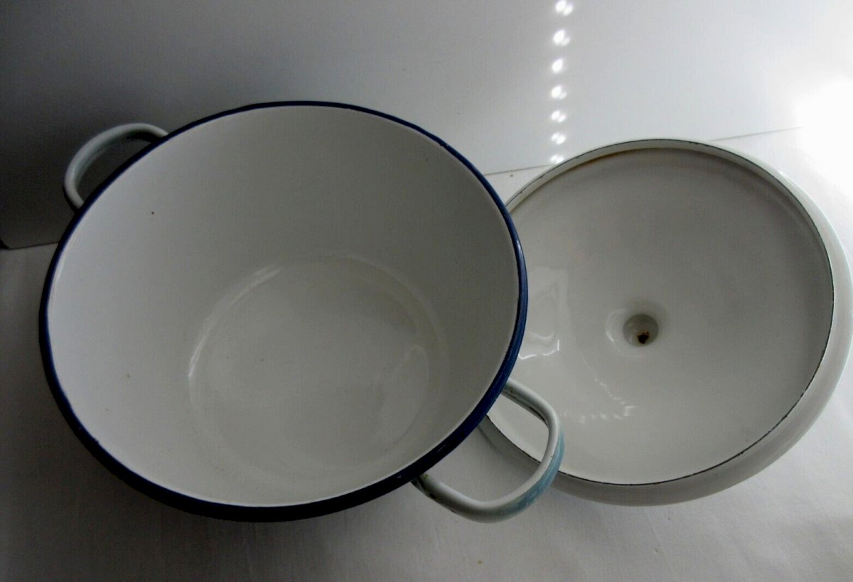 Worldwide sale. Antique Japy soup tureen. Beautiful white enameled metal soup tureen, shaded with light blue and featuring a navy blue rim. Decoration on both sides with pansies and roses with foliage. Decorated with beautiful roses on the lid. Good condition. This is a Japy soup tureen, unmarked. The photos show its good condition and complement the description. Diameter: 21.5 cm and width between the handles: 29 cm. Total height: 18 cm. Beautiful authentic object from around 1920. Condition: Used. Item has been used, possible imperfections. Country of origin: France. Color: Blue. Number of pieces: 1. Type: Cookware. Period: Art Deco, 1920-1939. Subtype: soup tureen. Material: Enameled metal. Style: Handmade.