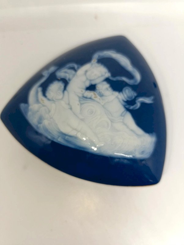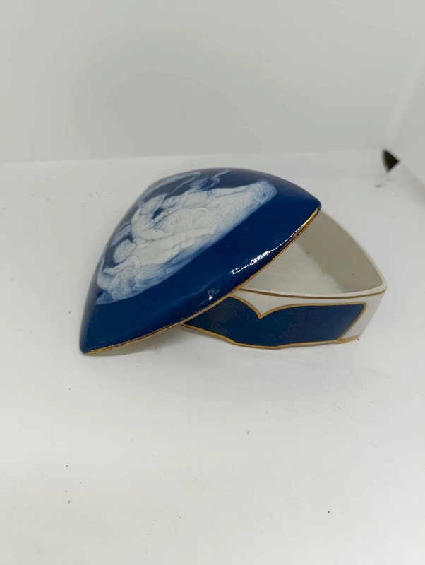 beautiful porcelain bonbonnière in Art Nouveau style Nude woman bathing on a blue background good general condition, some loss of color on the top and wear to the gilding (see photos) dimensions 13X13 height 5.5cm triangular, accented with gilding Marked: Artistic porcelain of Limoges - Barbotine F.M. Grand Feu 1st half of the 20th century... plus