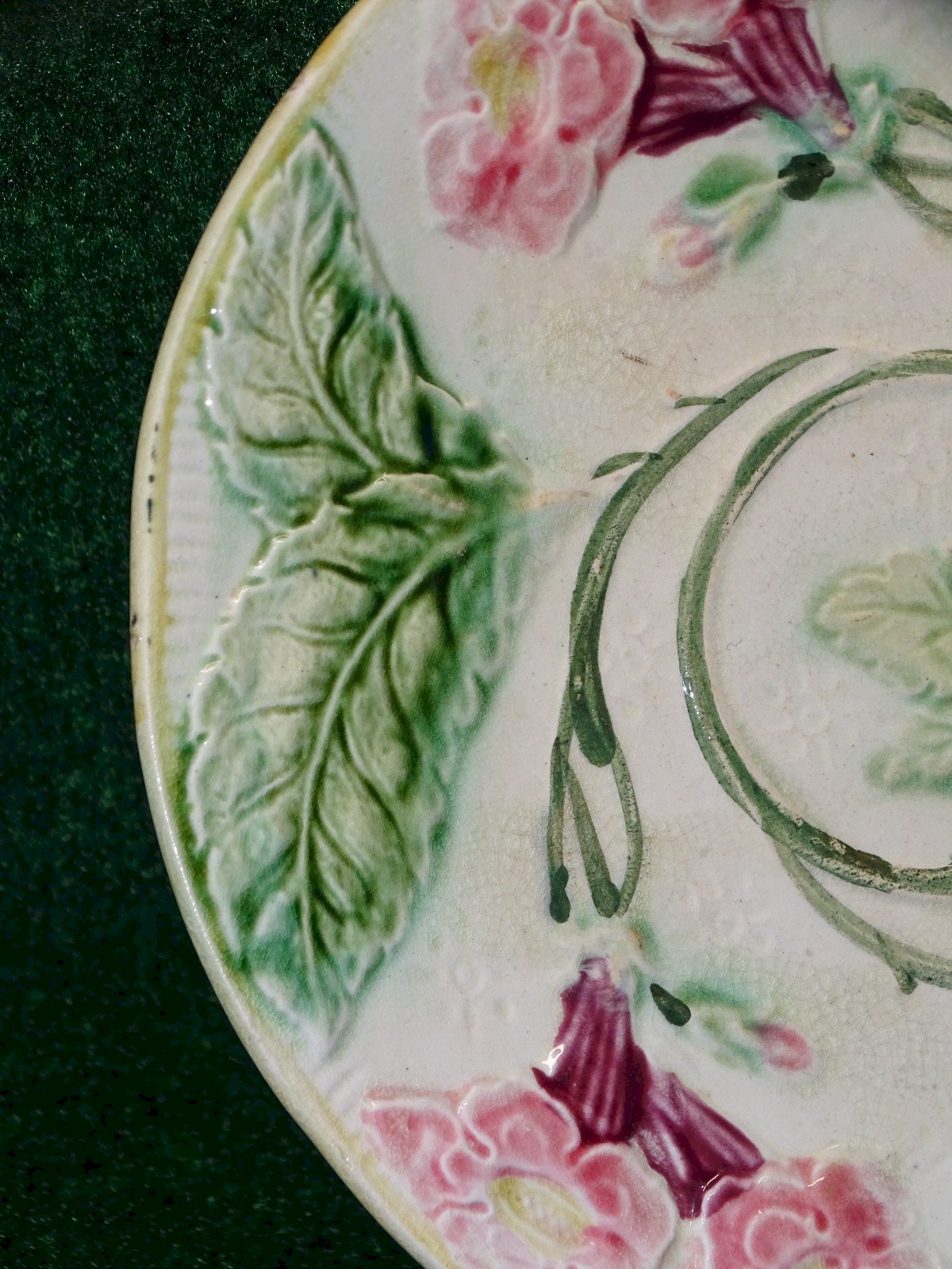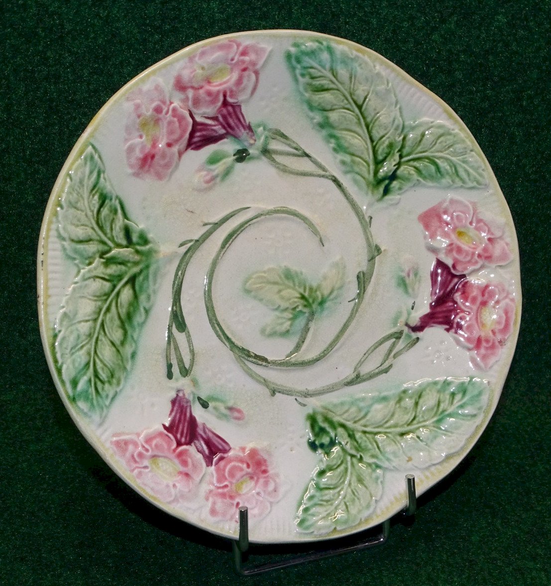 Beautiful old majolica plate decorated with pink flowers and green leaves, signed with an embossed heart on the back - with tarnishing (see photos) - found item - in used condition (see photos) - Ref. 1V240718/457 - Diameter 21 cm - Weight 321 g - To contact me, my email address: SHIPPING POSSIBLE WITH MONDIAL RELAY or COLISSIMO upon request, VERY GOOD PACKAGING GUARANTEED. PLEASE MAKE SURE TO LOOK AT ALL THE PHOTOS as THEY ARE AN INTEGRAL PART of the DESCRIPTION and ALLOW YOU TO SEE the ITEM IN THE BEST WAY with ITS POSSIBLE SMALL DEFECTS.