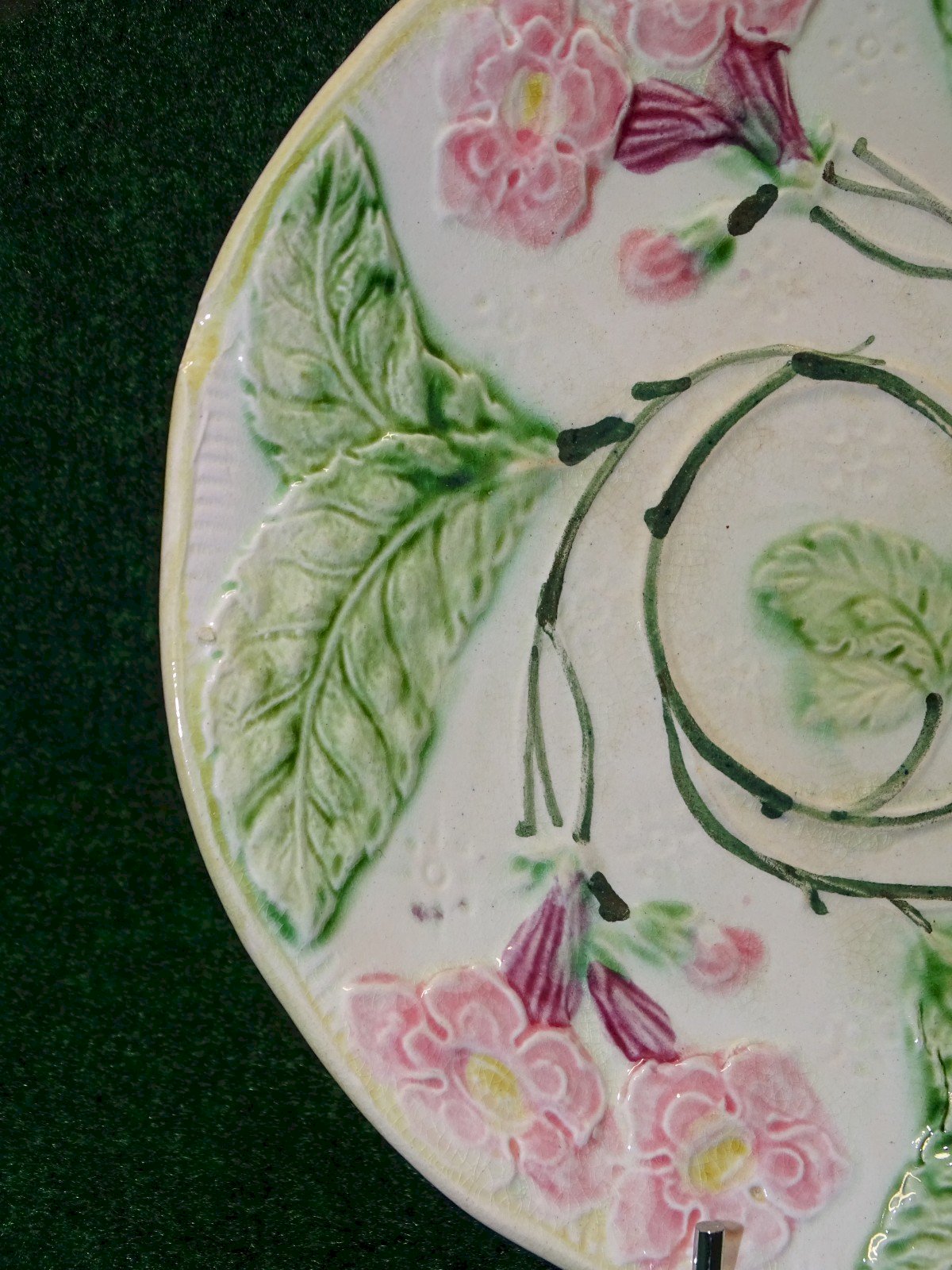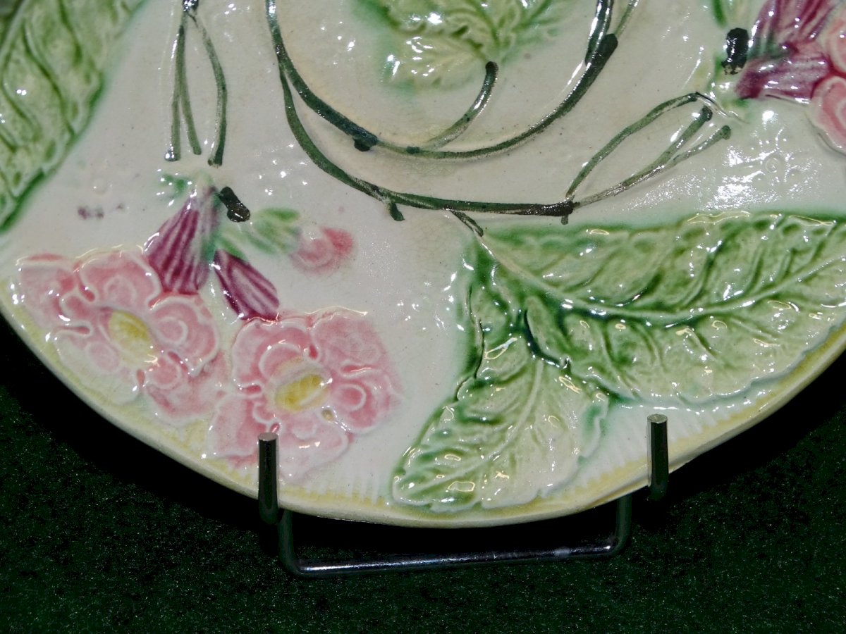 Beautiful antique majolica plate decorated with pink flowers and green leaves, signed with an indented heart on the back - with burnishes (see photos) - found condition - used (see photos) - Ref. 1V240718/454 - Diameter 20.9 cm - Weight 374 g - To contact me, my email address: SHIPPING POSSIBLE VIA MONDIAL RELAY or COLISSIMO upon request, VERY GOOD PACKAGING GUARANTEED. THANK YOU for CAREFULLY VIEWING ALL the PHOTOS as THEY ARE AN INTEGRAL PART of the DESCRIPTION and ALLOW YOU to SEE the ITEM AT ITS BEST with ANY POSSIBLE SMALL DEFECTS.