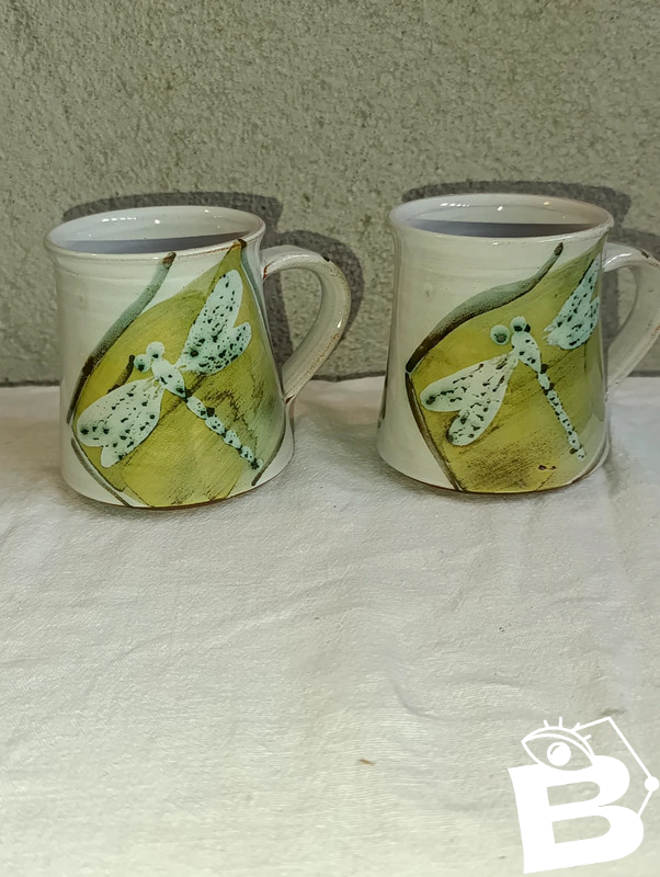 beautiful pair of cups signed M.C of British origin (Ireland?) in good condition dragonfly decoration height 9cm