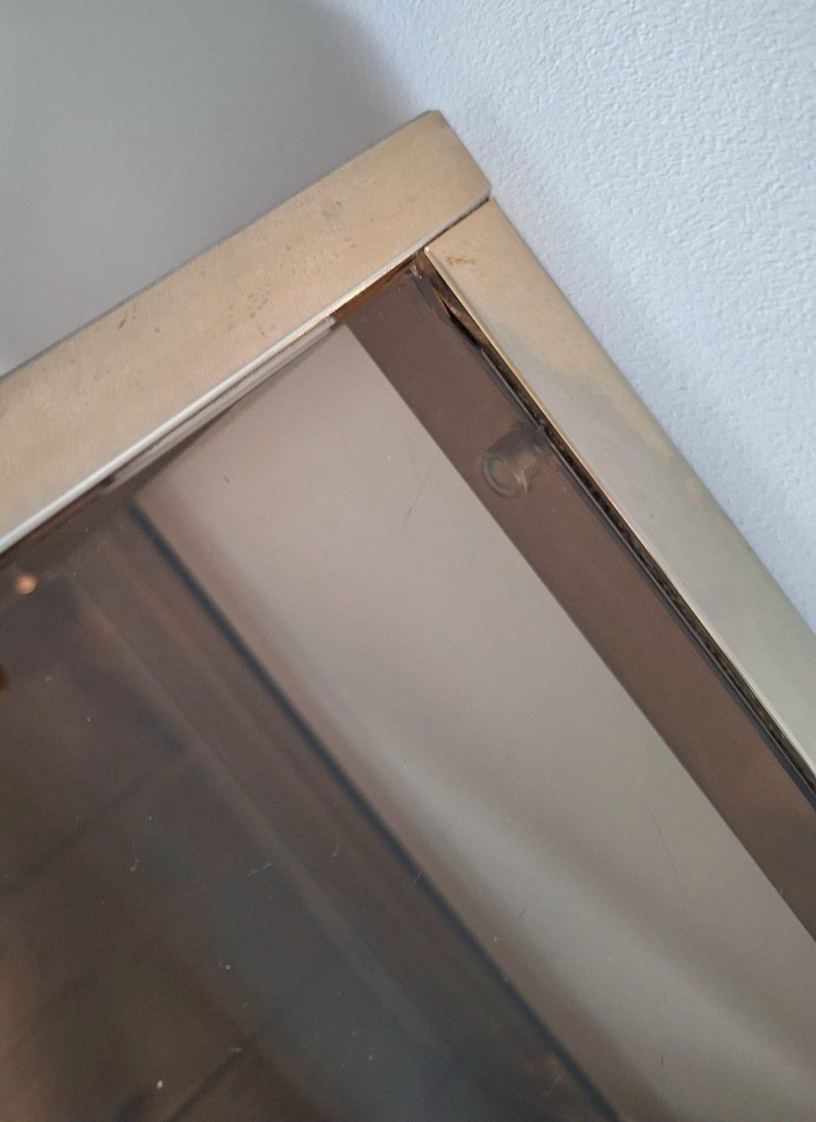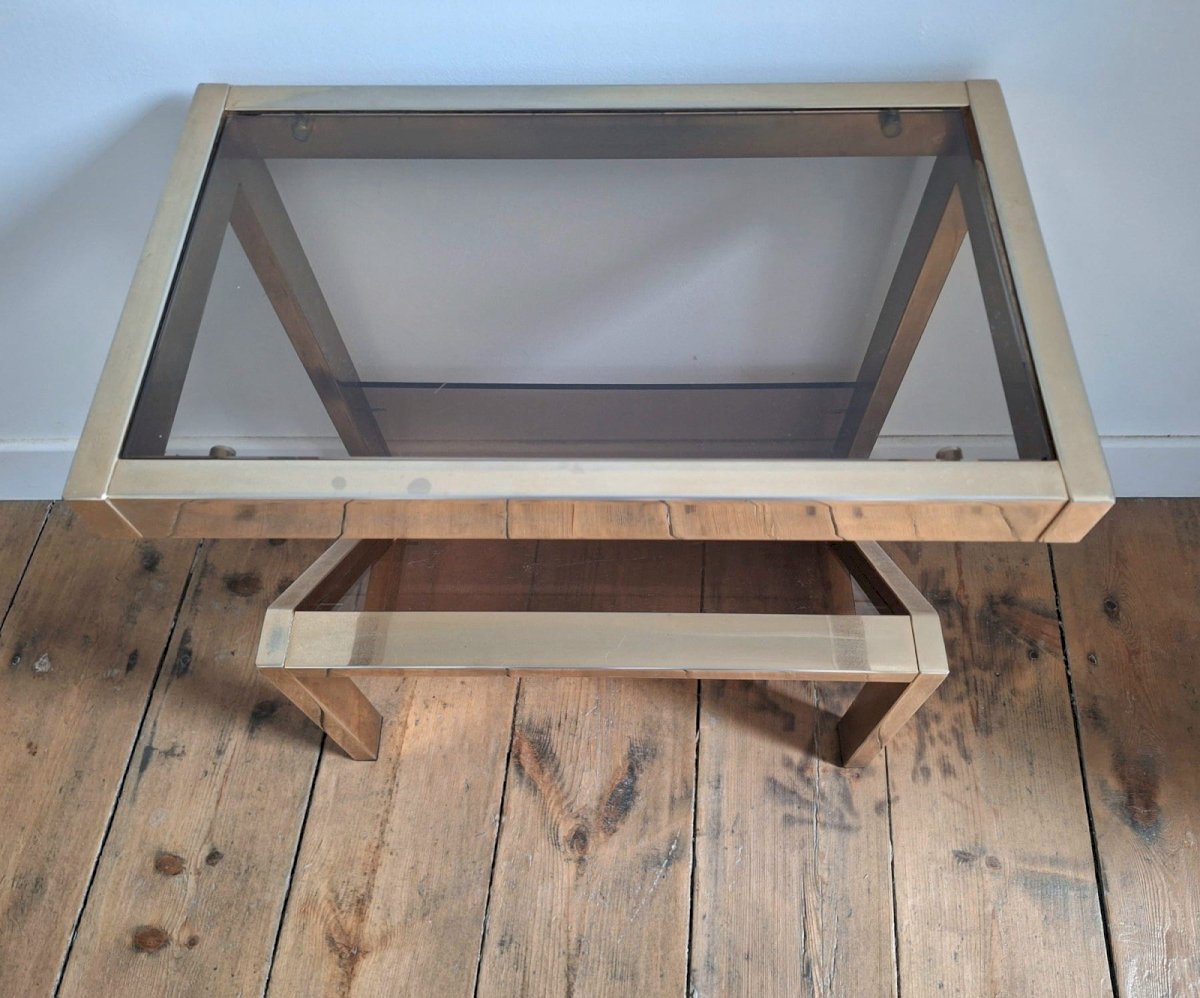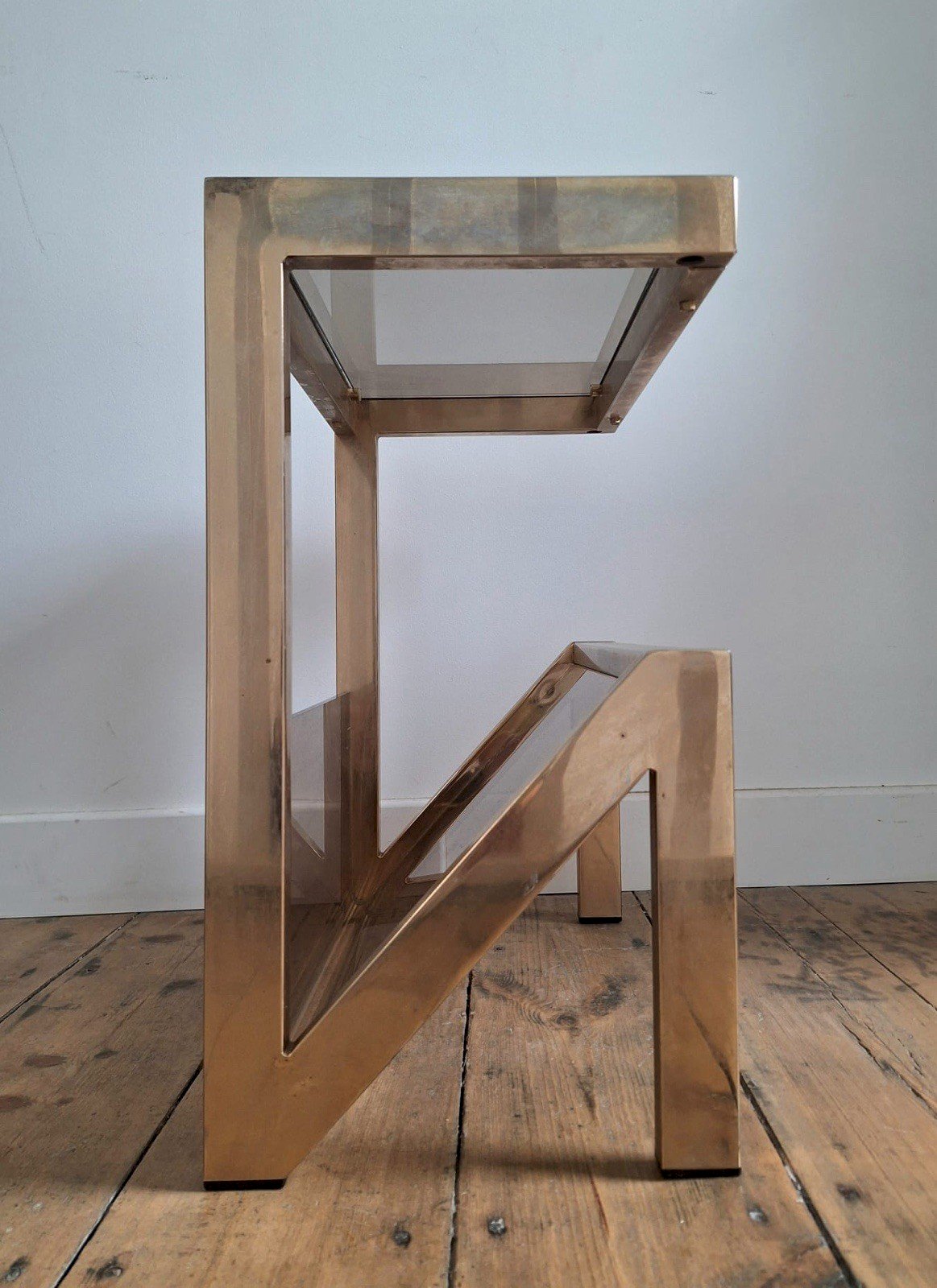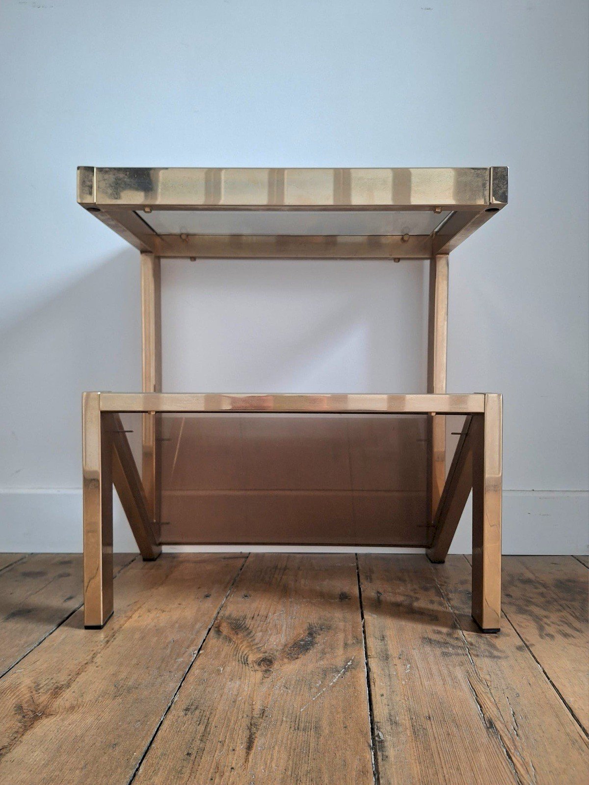 Thank you for writing to me if you would like to make me an offer. Belgo Chrom vintage side table 23 ct, designer magazine rack, furniture published by Dewulf Selection for Belgo Chrom. Belgian production from the 1970s-1980s. End table, nightstand, etc., with a structure in 23-carat gold plating (see label). Top surface in smoked glass (2 chips and some scratches). Lower part in smoked plexiglass. Dimensions 45x27xh50cm. Some discolorations and fading of the structure. Pickup at my home or delivery possible via carrier (e.g., €40 to Paris and the Paris region, contact me for other destinations). Delivery times of 2 to 4 days are imposed by and are therefore given purely as an indication. Hollywood Regency vintage Type: Magazine rack.