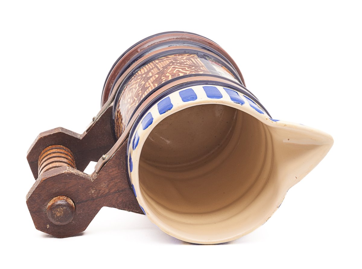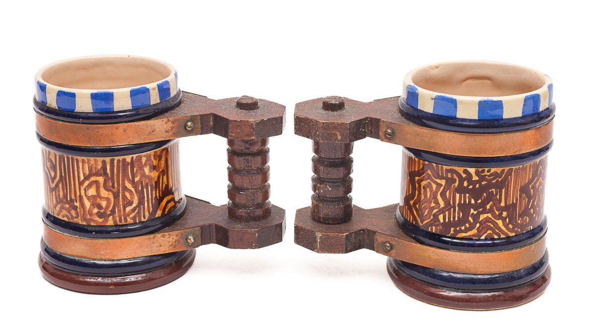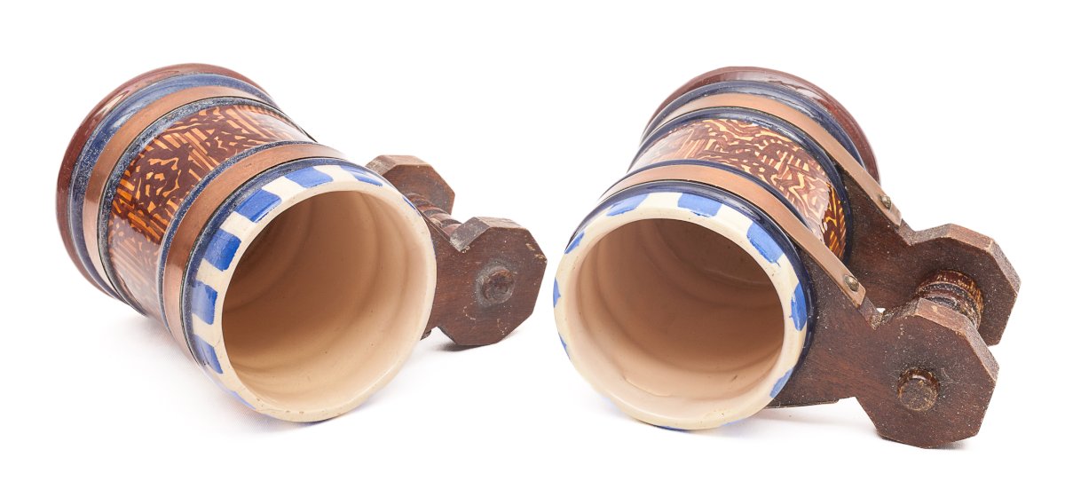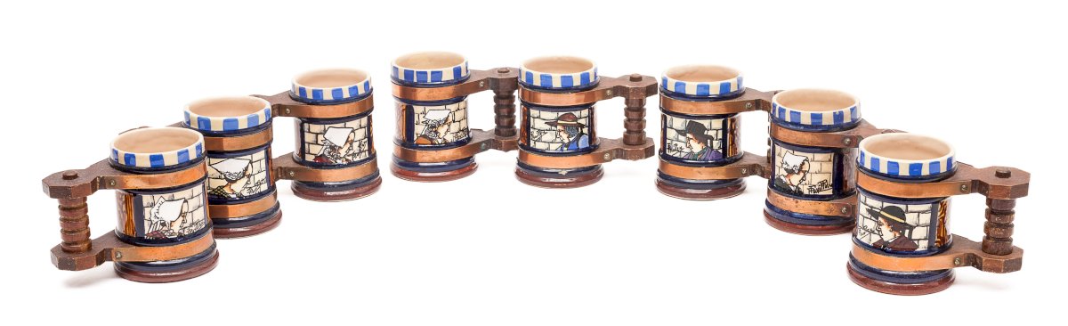 1 carafe and 8 handled glasses.