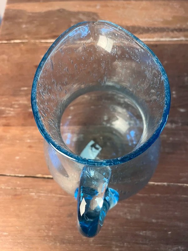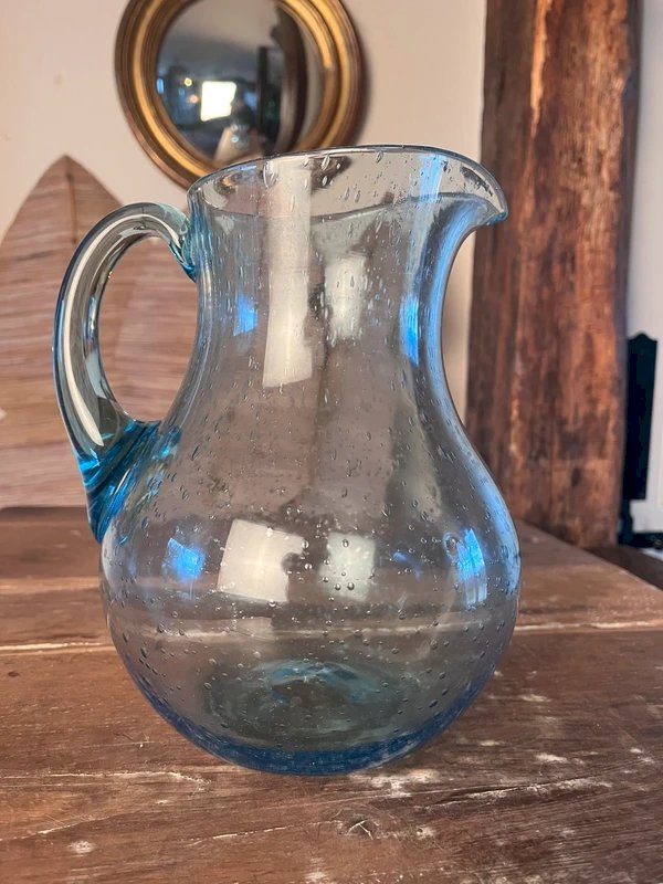 Large blown glass pitcher with bubbles from the Biot glassworks, in translucent blue color.