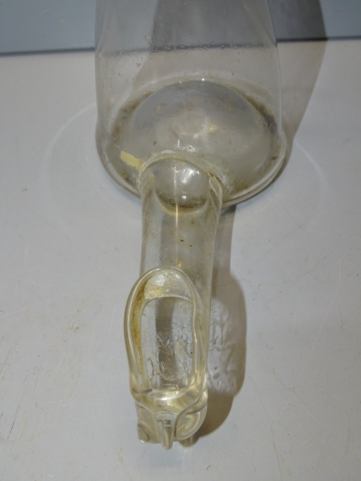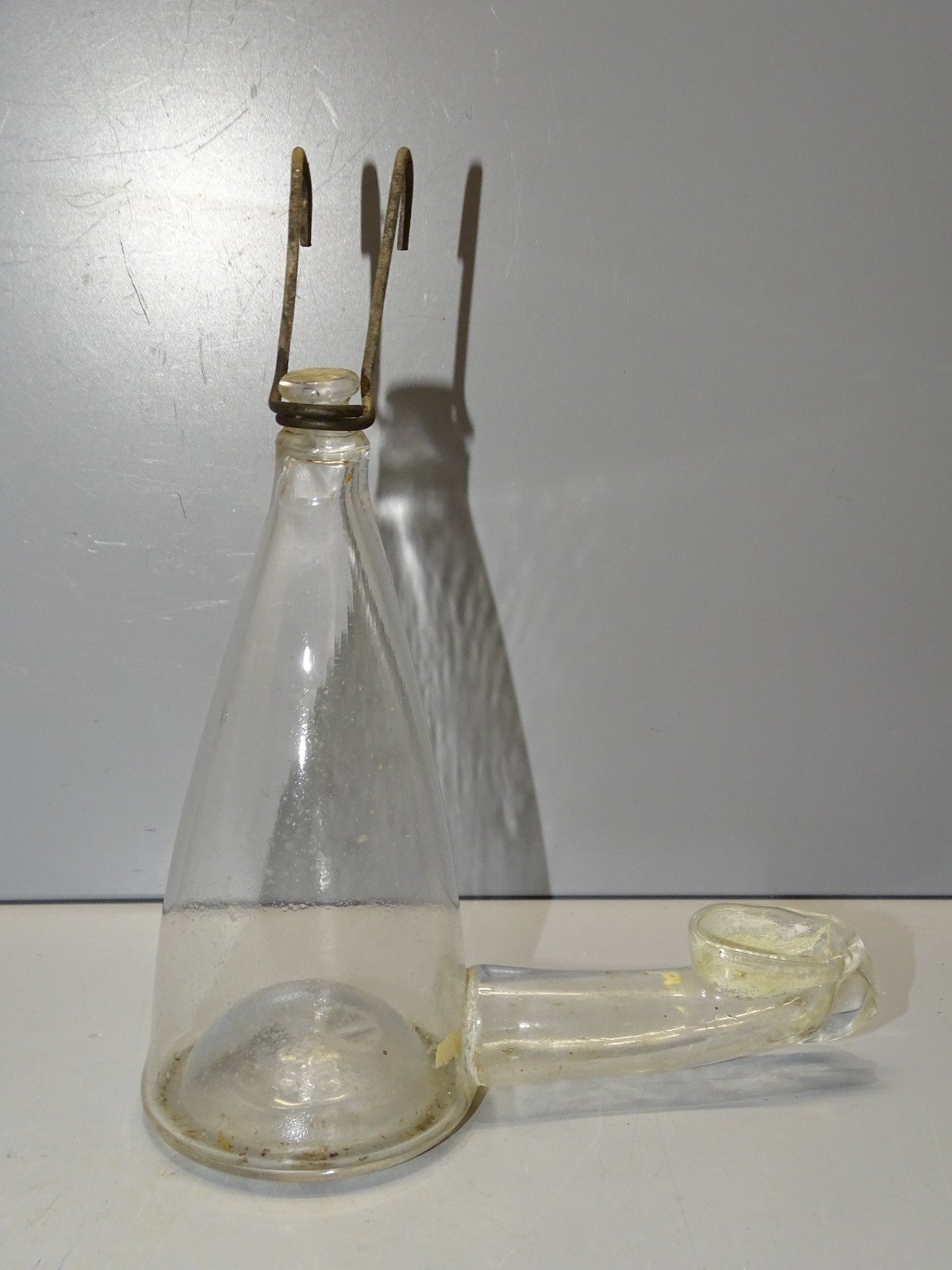 Old 18th century blown glass water trough for birdcage - with traces of limescale and interior to be cleaned - with wire to hang it in the cage (see photos) - in its current state, needs cleaning - Ref. 1V251219/92 Height 15 cm - Length 15.5 cm - Bottom diameter 6.7 cm - Weight 0.167 kg SHIPPING POSSIBLE WITH MONDIAL RELAY or COLISSIMO upon request VERY GOOD PACKAGING GUARANTEED PLEASE TAKE A GOOD LOOK AT ALL THE PHOTOS as THEY ARE AN INTEGRAL PART of the DESCRIPTION and ALLOW YOU TO SEE the OBJECT AS BEST AS POSSIBLE with ITS POTENTIAL SMALL DEFECTS - Type: Showcase item, Decorative Origin: France Subtype: WATER TROUGH Country of origin: France Style: Antique