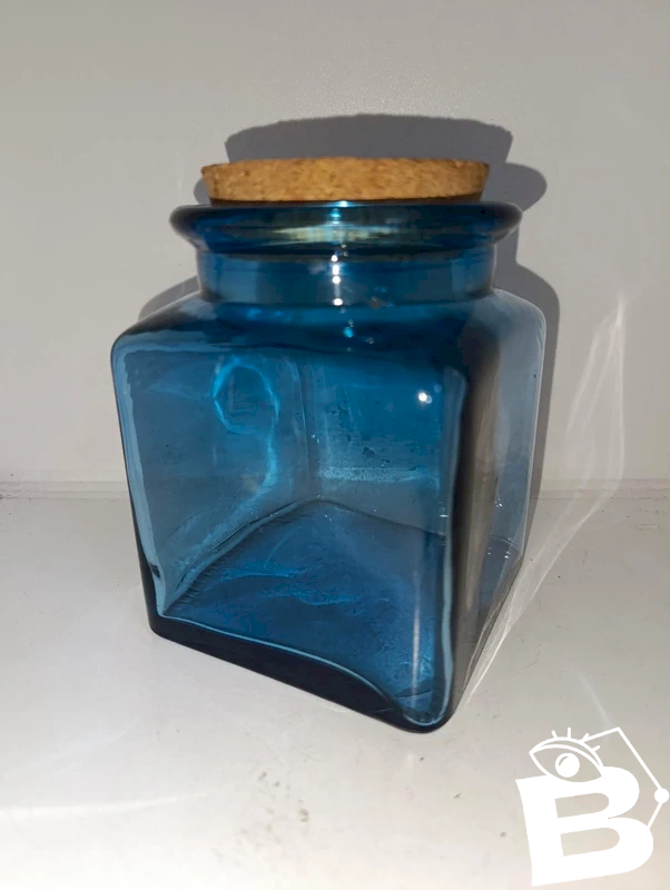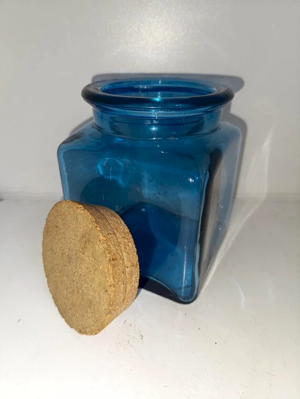 blue glass jar with cork lid in good condition
